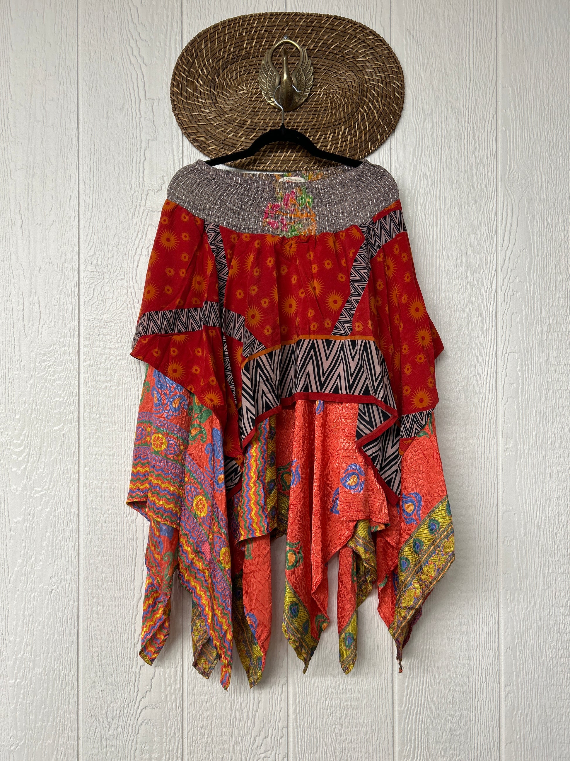 crafted from our ultra lux vintage crepe and ragulla sari. Features a rock star asymmetrical hem and stretchy pareo kantha waistband. This versatile piece can be pulled up to be worn as a tunic!
