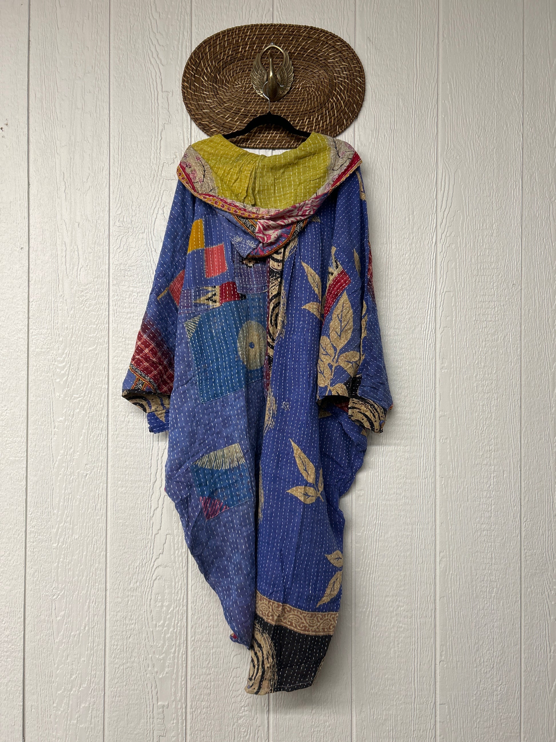 Made from our hand kantha stitched vintage cotton sari, this piece of wearable art features a Button-down opening with functional buttons, slouchy outer pockets, billowy sleeves, a rounded hemline and a vibey hood. The perfect maxi to compliment your favorite kantha pants or bell bottoms.