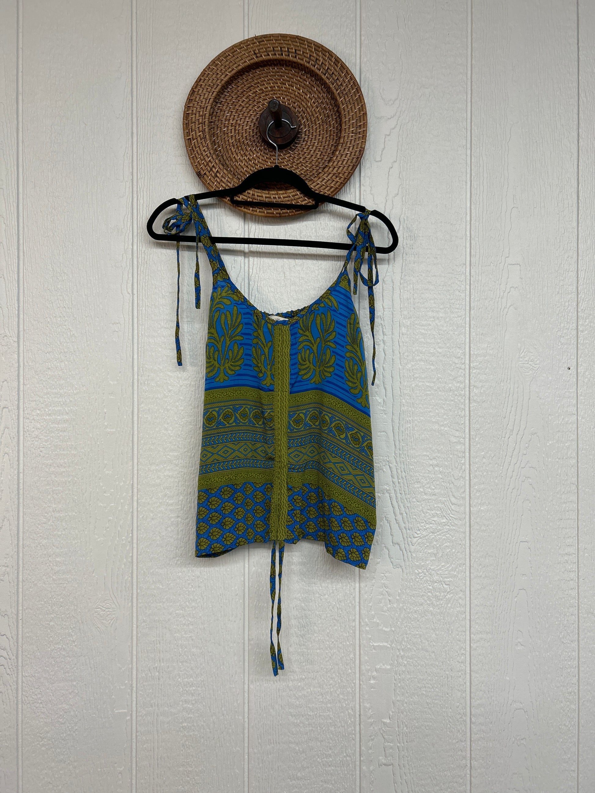 Our Rasgulla Butterfly Tank Top Features adjustable tie straps and a cinch front tie in the front which makes the top customizable for any of your favorite bottoms. Crafted from our ultra lux rasgulla silk this dreamy top is bound to be your new vibey go to! The back also features stretchy elastic for added comfort.