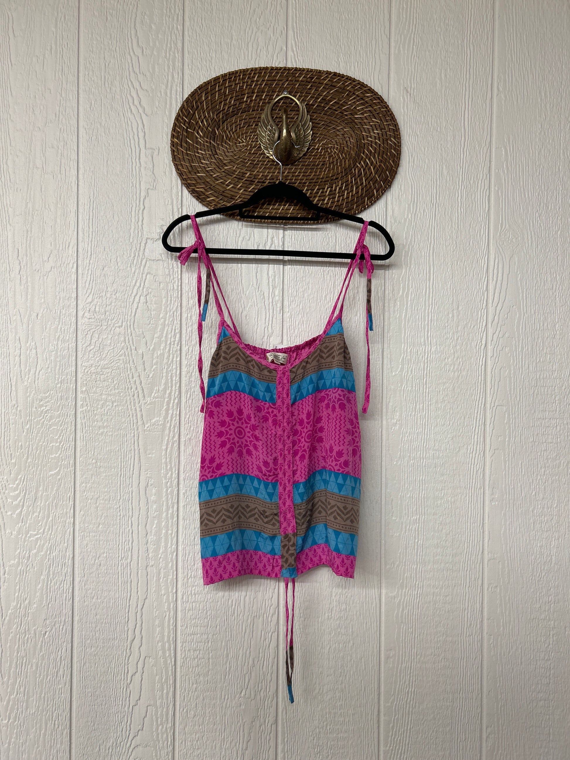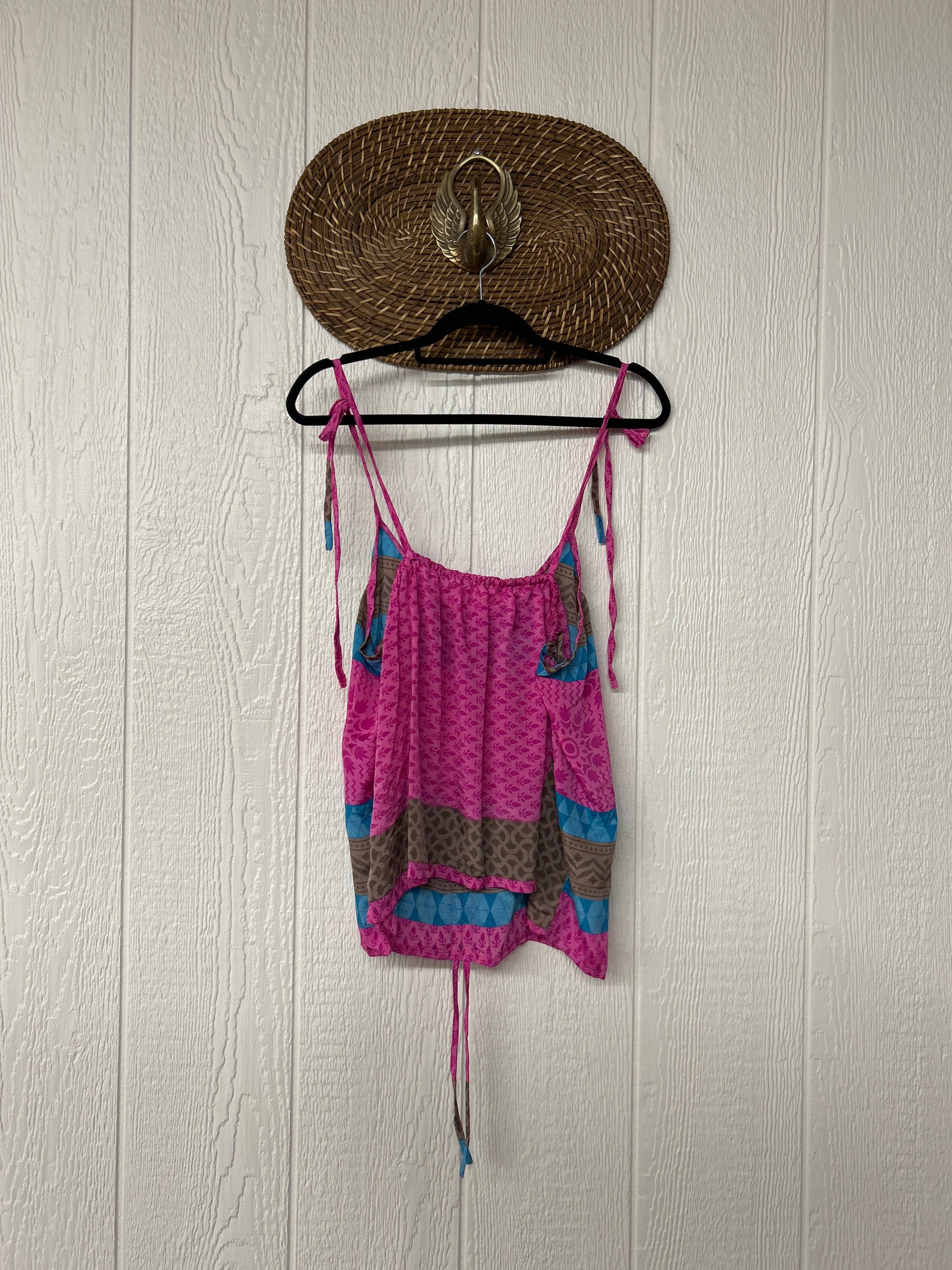 Our Rasgulla Butterfly Tank Top Features adjustable tie straps and a cinch front tie in the front which makes the top customizable for any of your favorite bottoms. Crafted from our ultra lux rasgulla silk this dreamy top is bound to be your new vibey go to! The back also features stretchy elastic for added comfort.