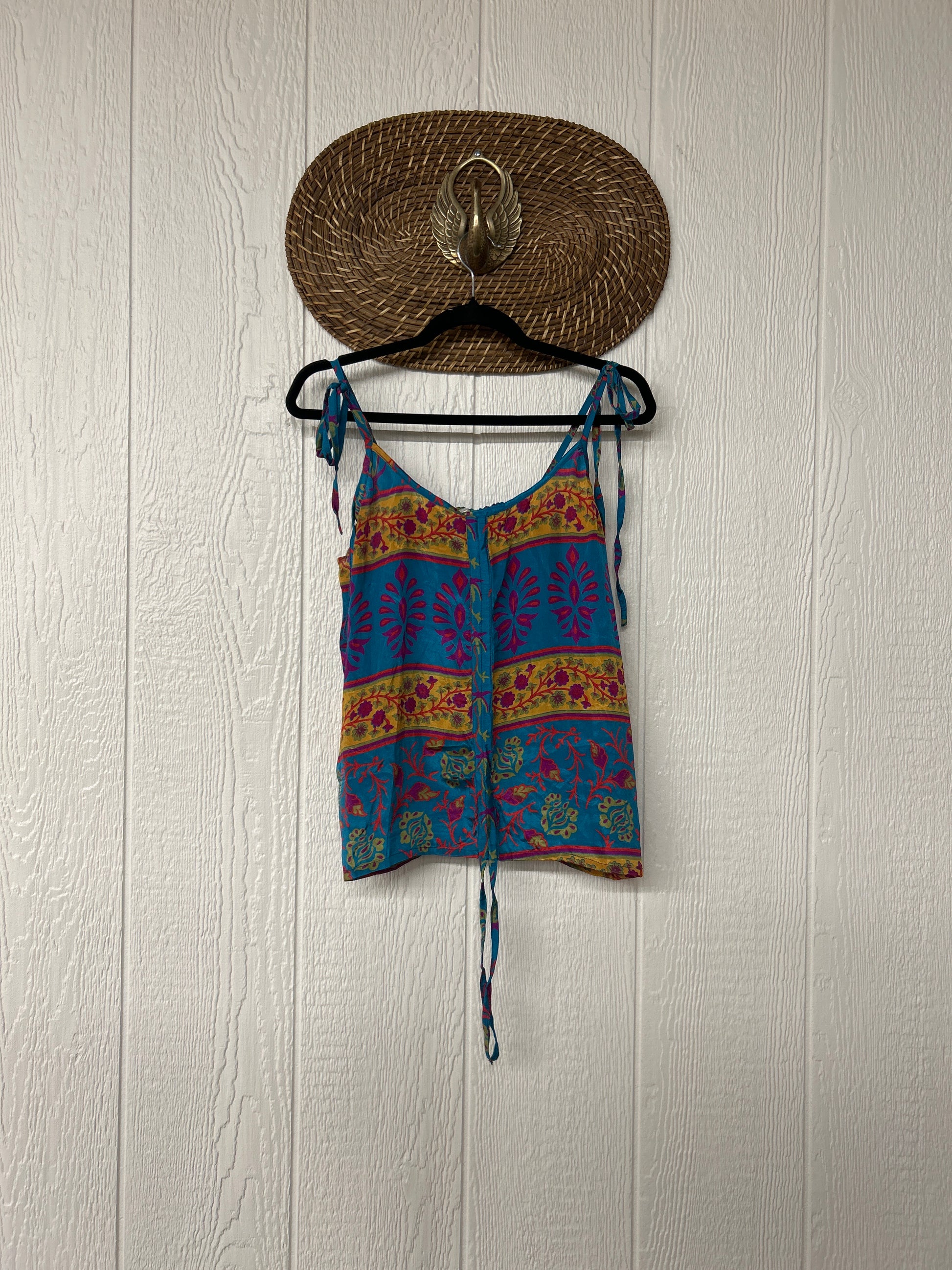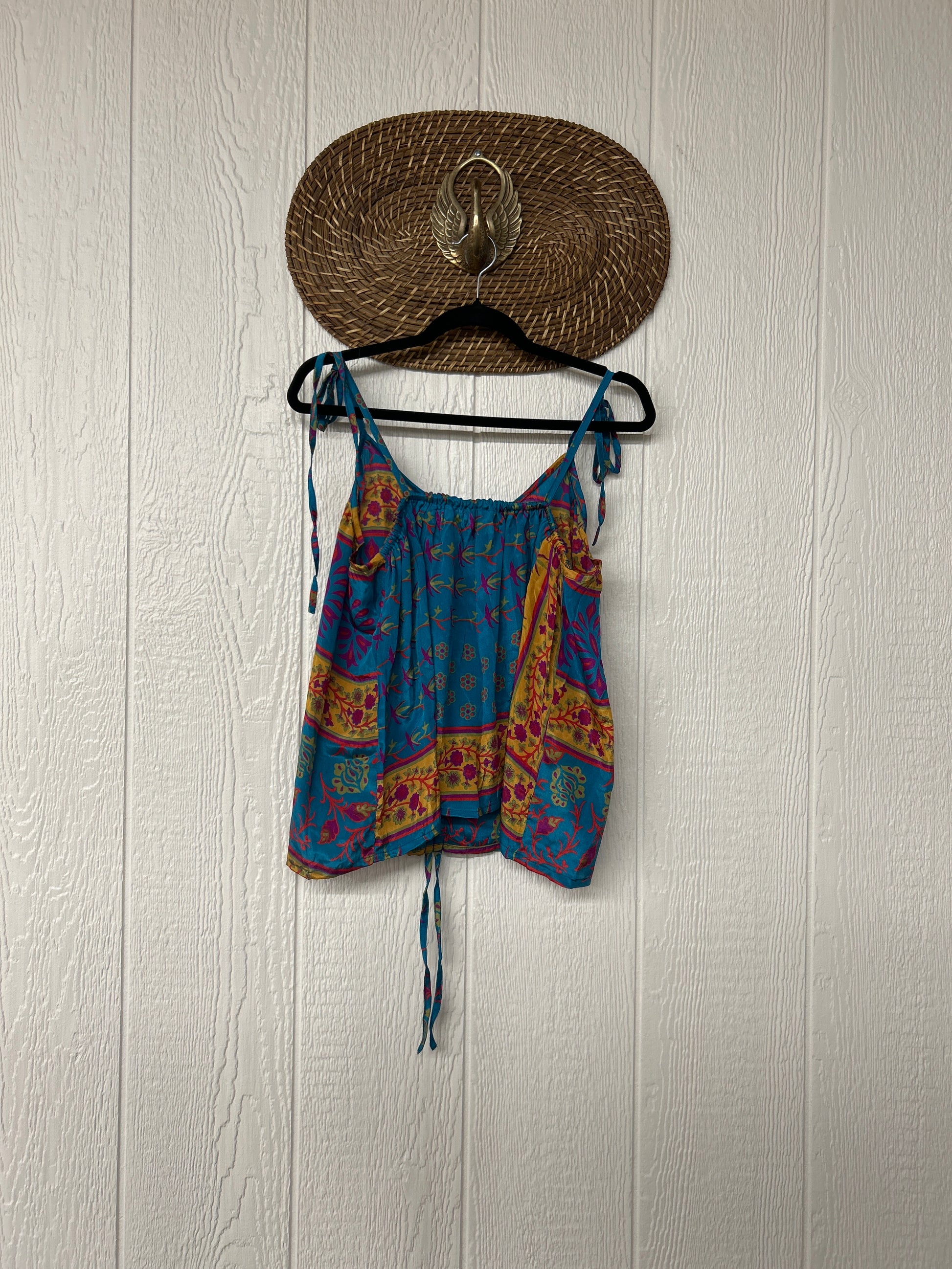 Our Rasgulla Butterfly Tank Top Features adjustable tie straps and a cinch front tie in the front which makes the top customizable for any of your favorite bottoms. Crafted from our ultra lux rasgulla silk this dreamy top is bound to be your new vibey go to! The back also features stretchy elastic for added comfort.