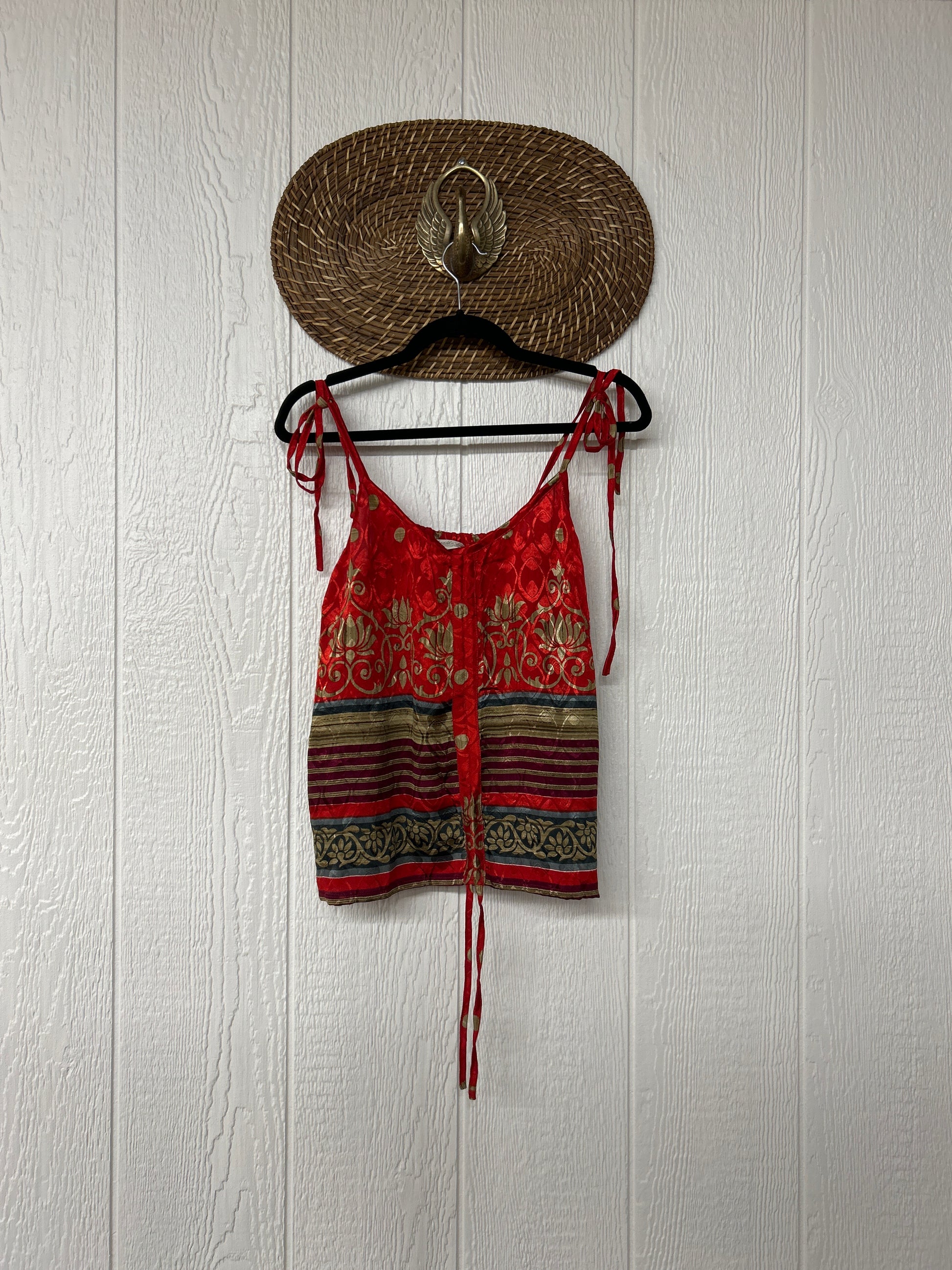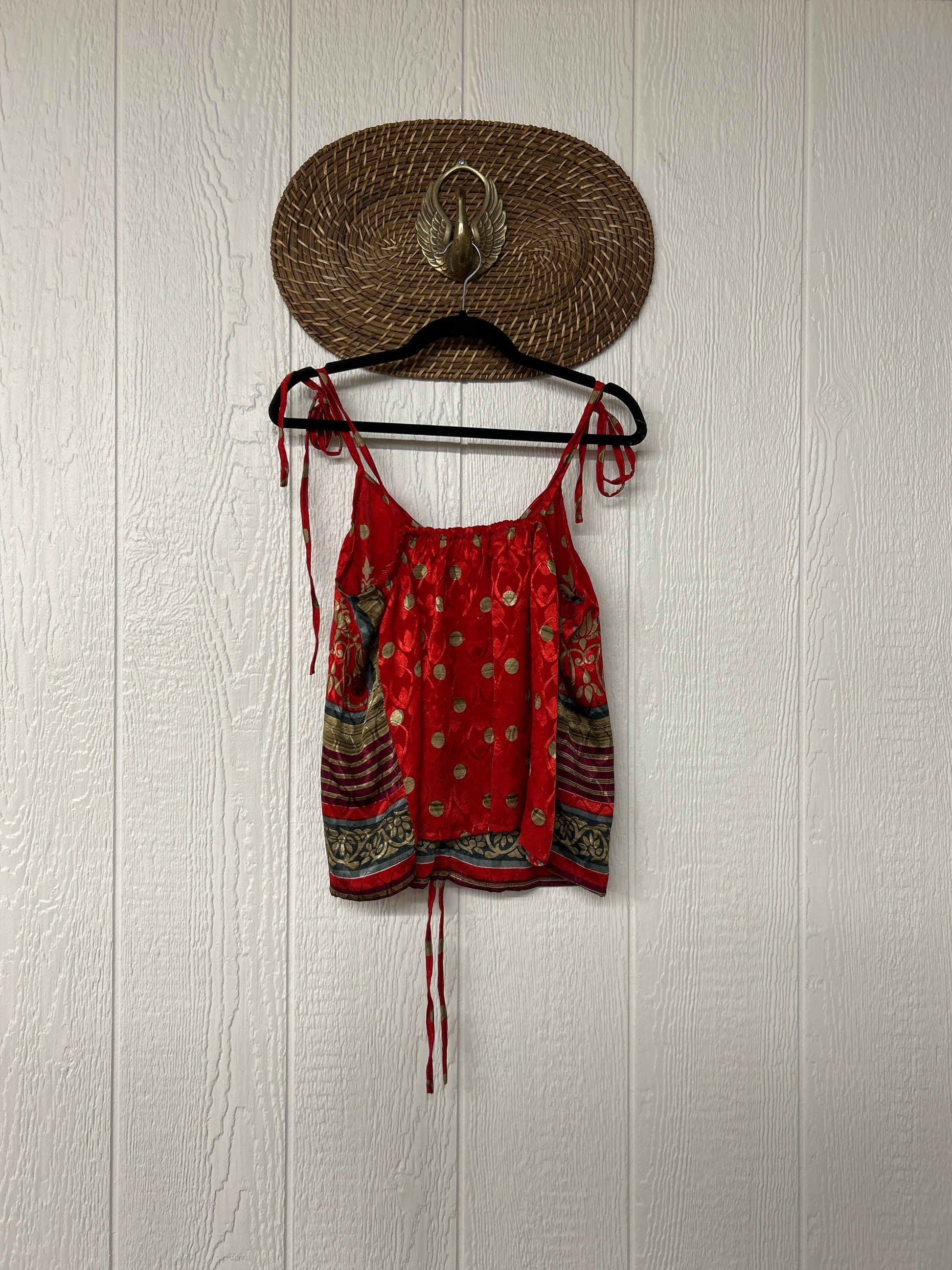 Our Rasgulla Butterfly Tank Top Features adjustable tie straps and a cinch front tie in the front which makes the top customizable for any of your favorite bottoms. Crafted from our ultra lux rasgulla silk this dreamy top is bound to be your new vibey go to! The back also features stretchy elastic for added comfort.