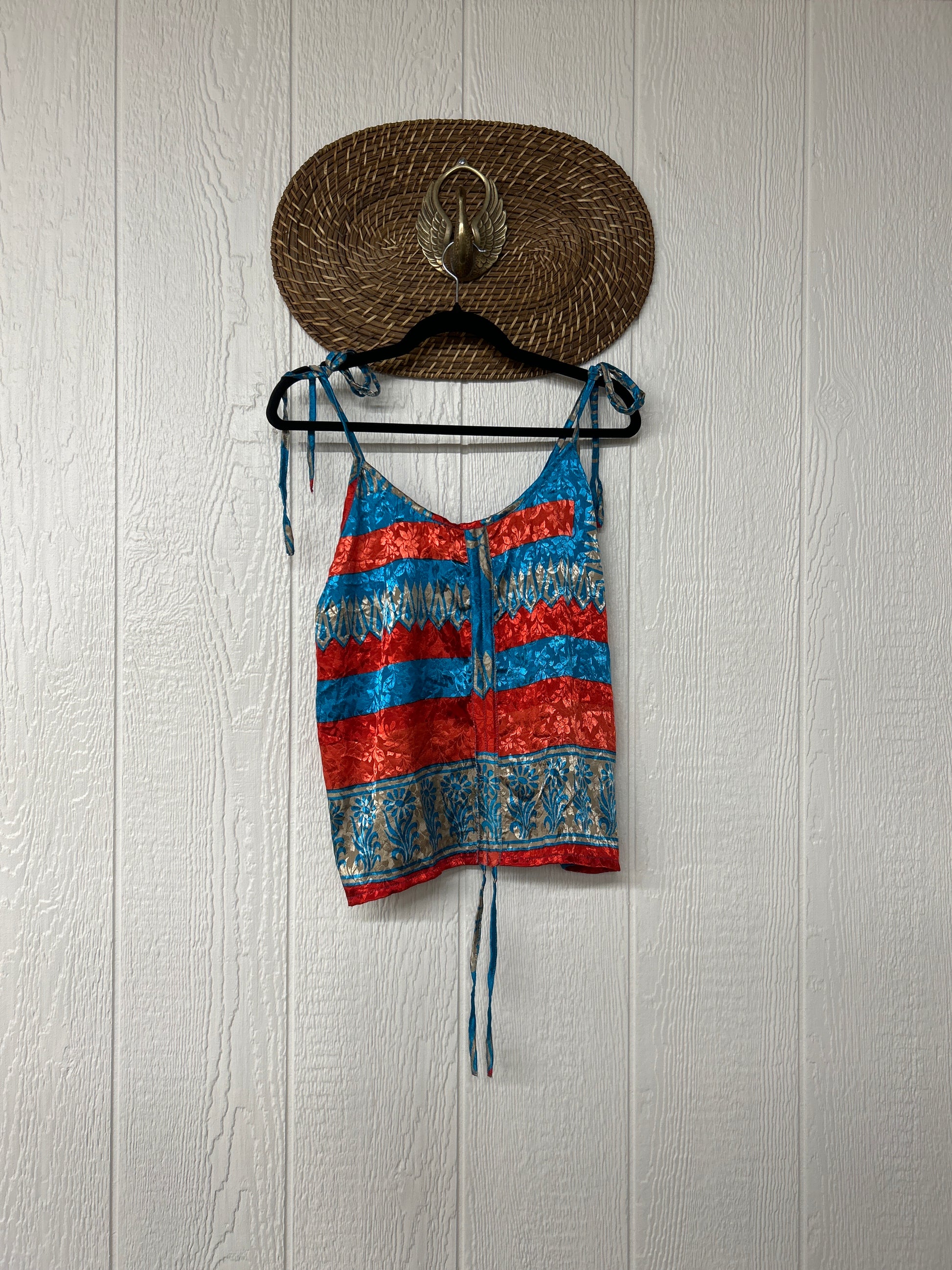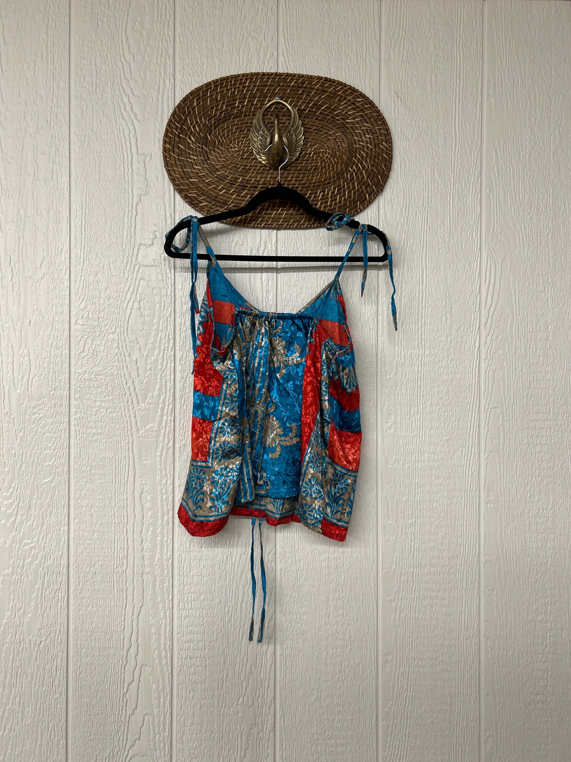 Our Rasgulla Butterfly Tank Top Features adjustable tie straps and a cinch front tie in the front which makes the top customizable for any of your favorite bottoms. Crafted from our ultra lux rasgulla silk this dreamy top is bound to be your new vibey go to! The back also features stretchy elastic for added comfort.