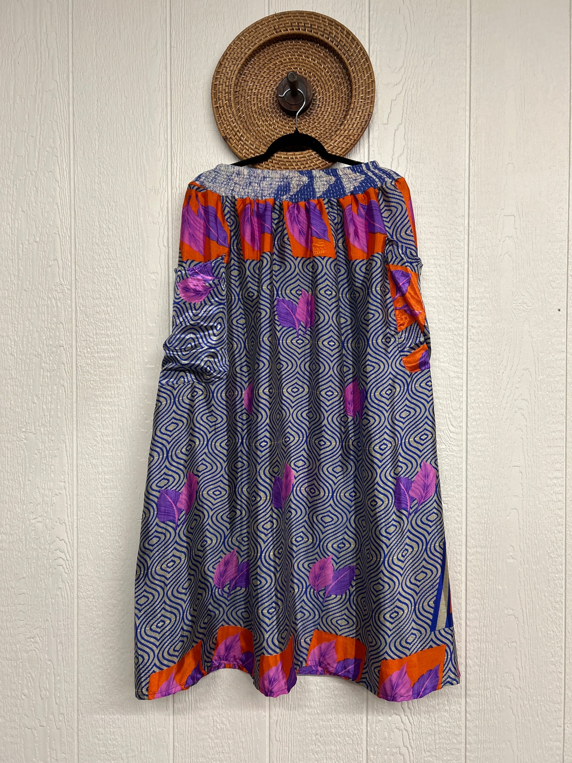 Crafted from rasgulla sari, this absolute dream features slouchy side pockets with a butterfly drawstring to cinch the sides, a button front skirt and a stretchy free size waist.