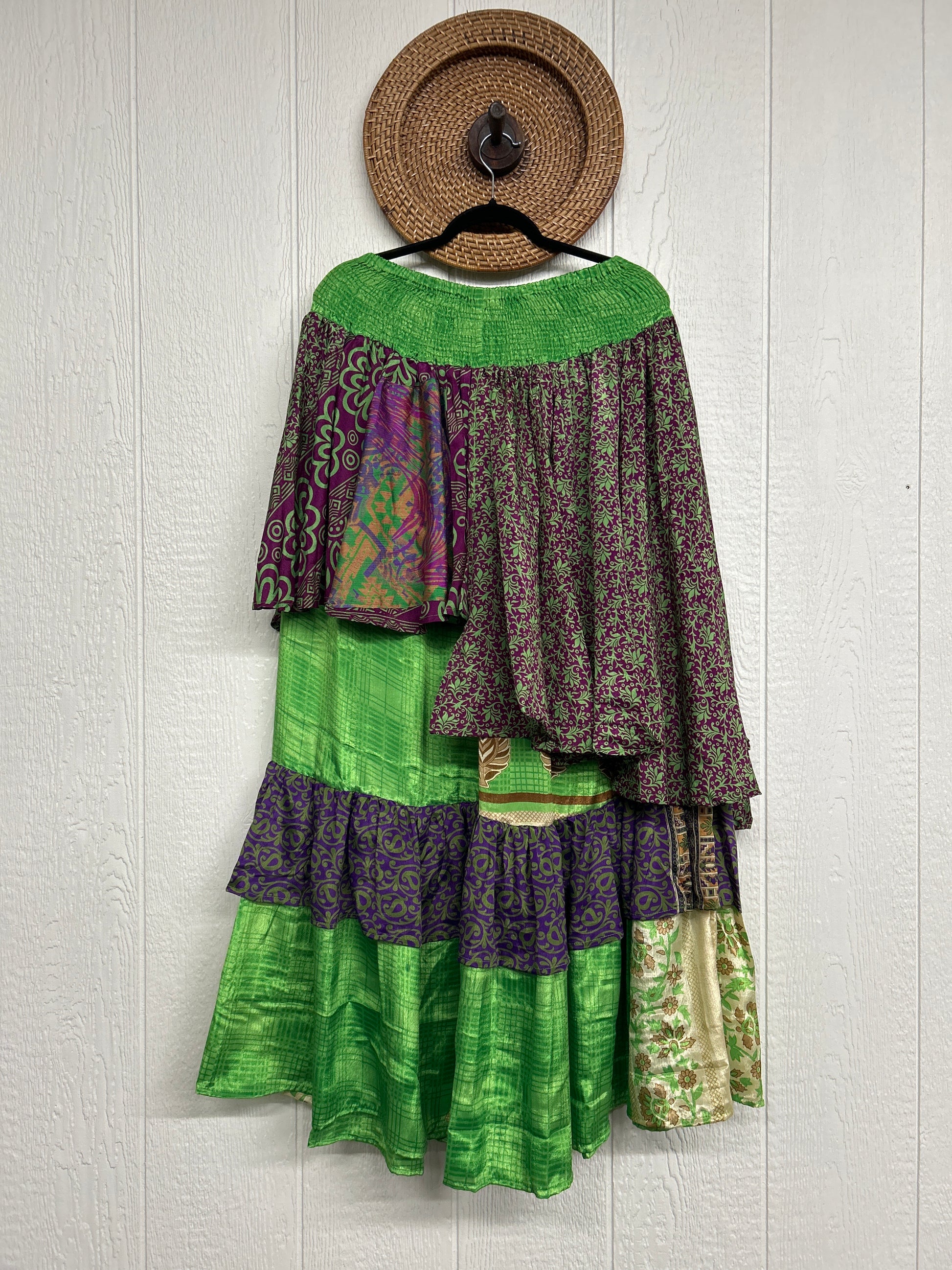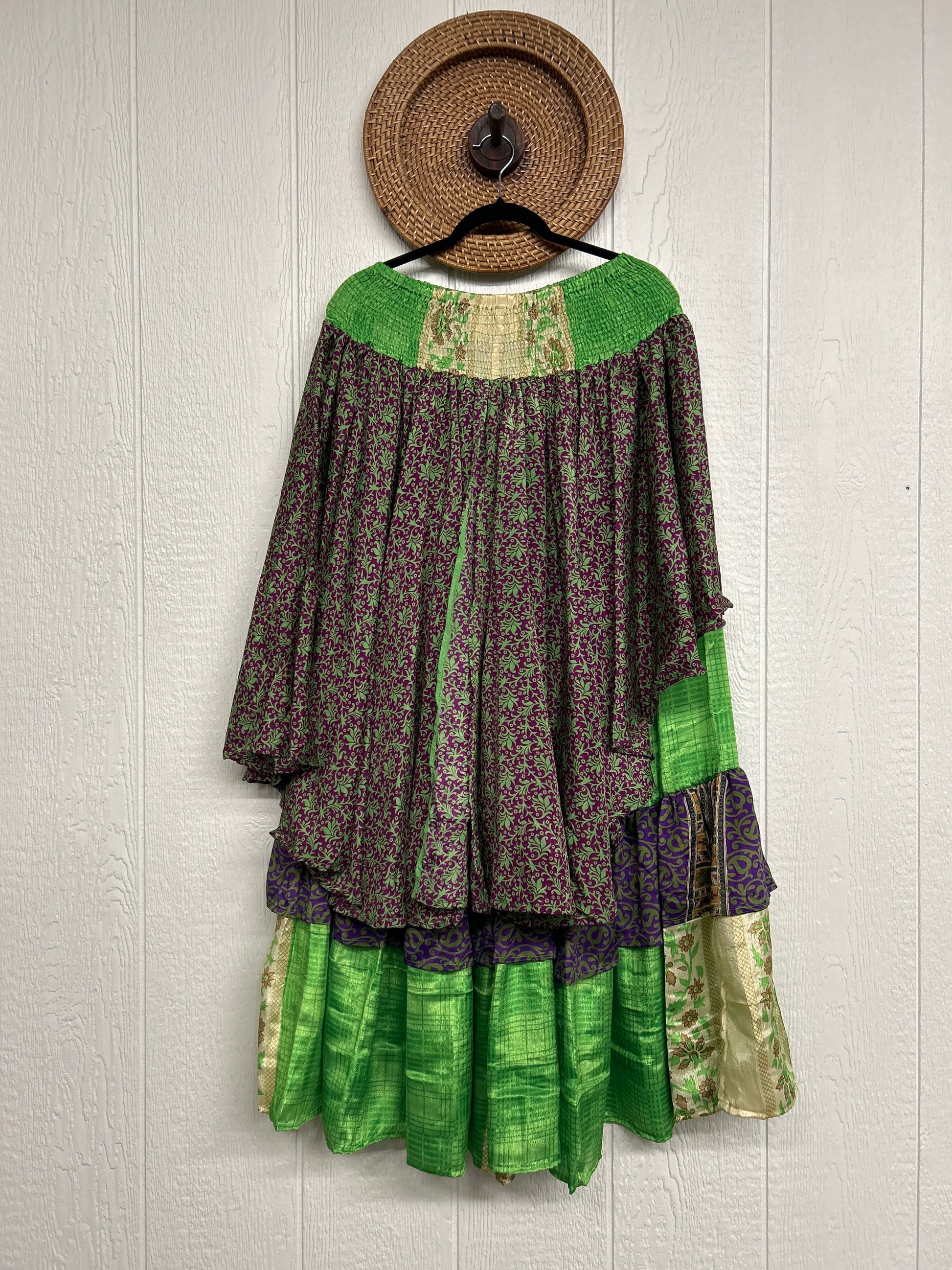 Crafted from vintage rasgulla sari these ethereal pants features stretchy waist, super wide legs, double tier hem and a skirt layer. these pants will make you want to dance! One size, recommended up to size 22/24 Crafted and sewn by families in a small village in Northern India providing work and a fair living. This product should be hand washed and line dried for longest life. For softness, fluff in the dryer on low heat after it has dried from hand washing. Disclosure: Our vintage styles have lived a full life before becoming the designs in our shop. Fabrics may have small threads or holes in the layers. Color inconsistency or small stains may be present. The saris are sewn together and extend the life of each design. Imperfections should be celebrated.