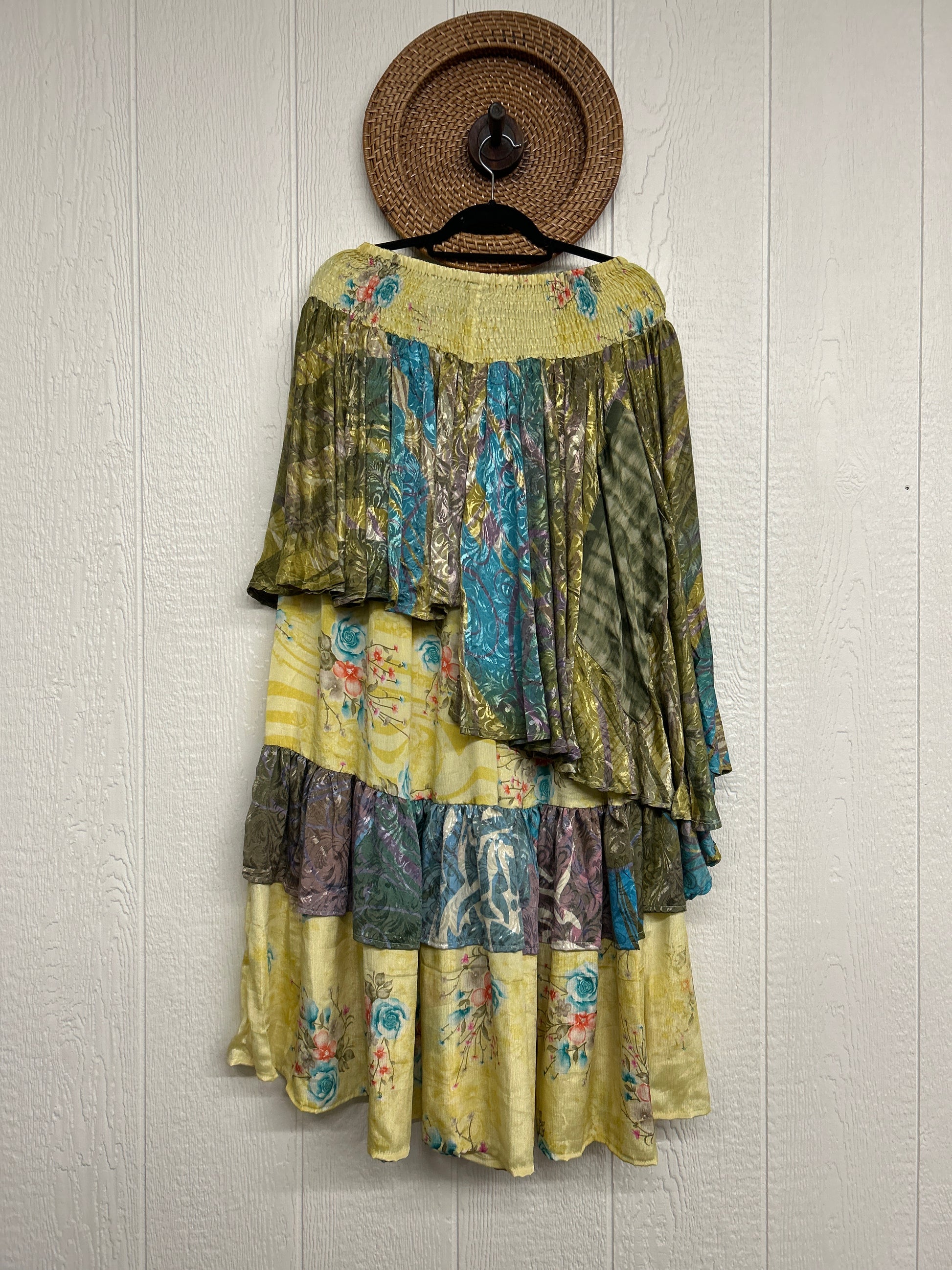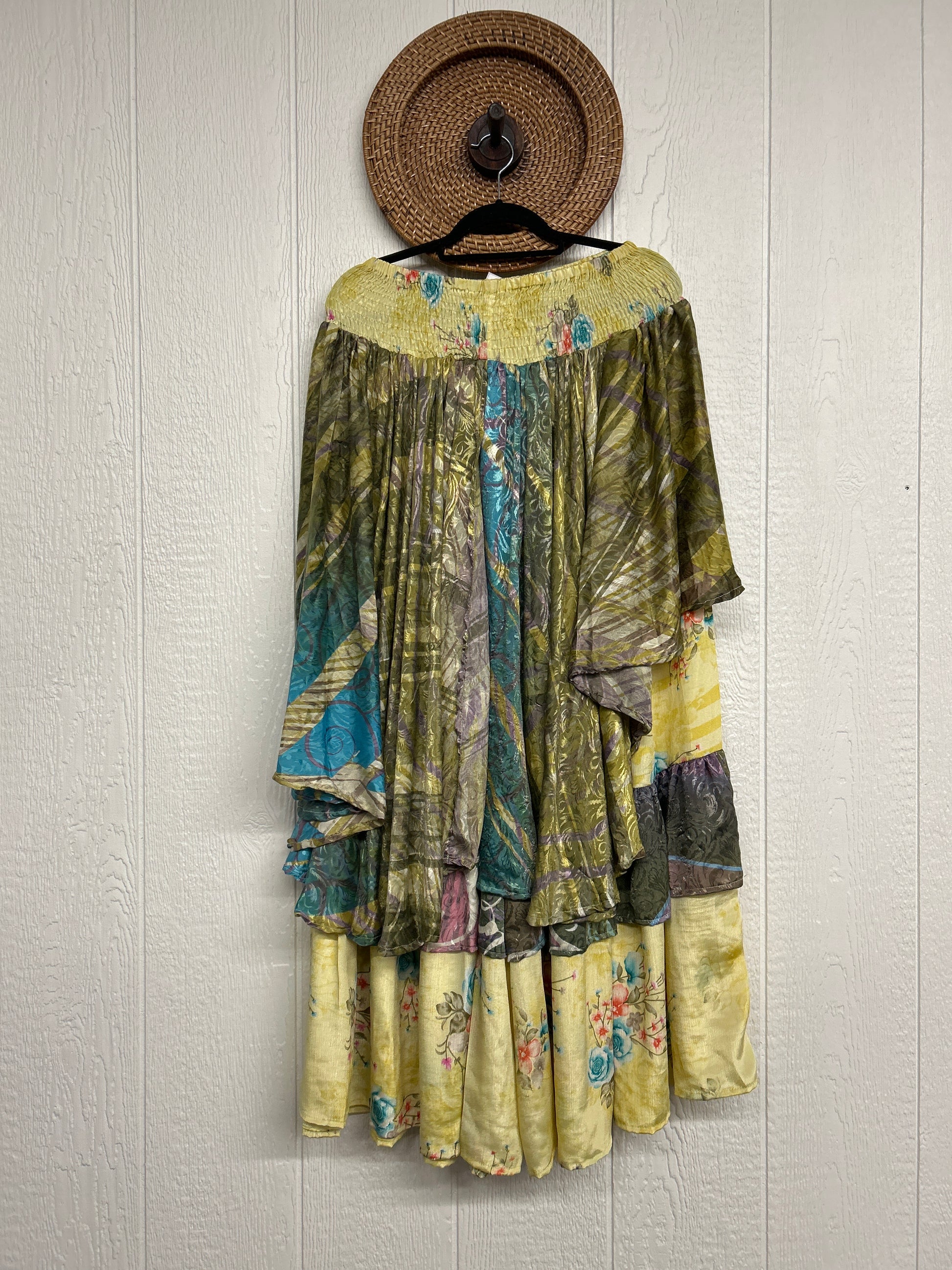 Crafted from vintage rasgulla sari these ethereal pants features stretchy waist, super wide legs, double tier hem and a skirt layer. these pants will make you want to dance! One size, recommended up to size 22/24 Crafted and sewn by families in a small village in Northern India providing work and a fair living. This product should be hand washed and line dried for longest life. For softness, fluff in the dryer on low heat after it has dried from hand washing. Disclosure: Our vintage styles have lived a full life before becoming the designs in our shop. Fabrics may have small threads or holes in the layers. Color inconsistency or small stains may be present. The saris are sewn together and extend the life of each design. Imperfections should be celebrated.