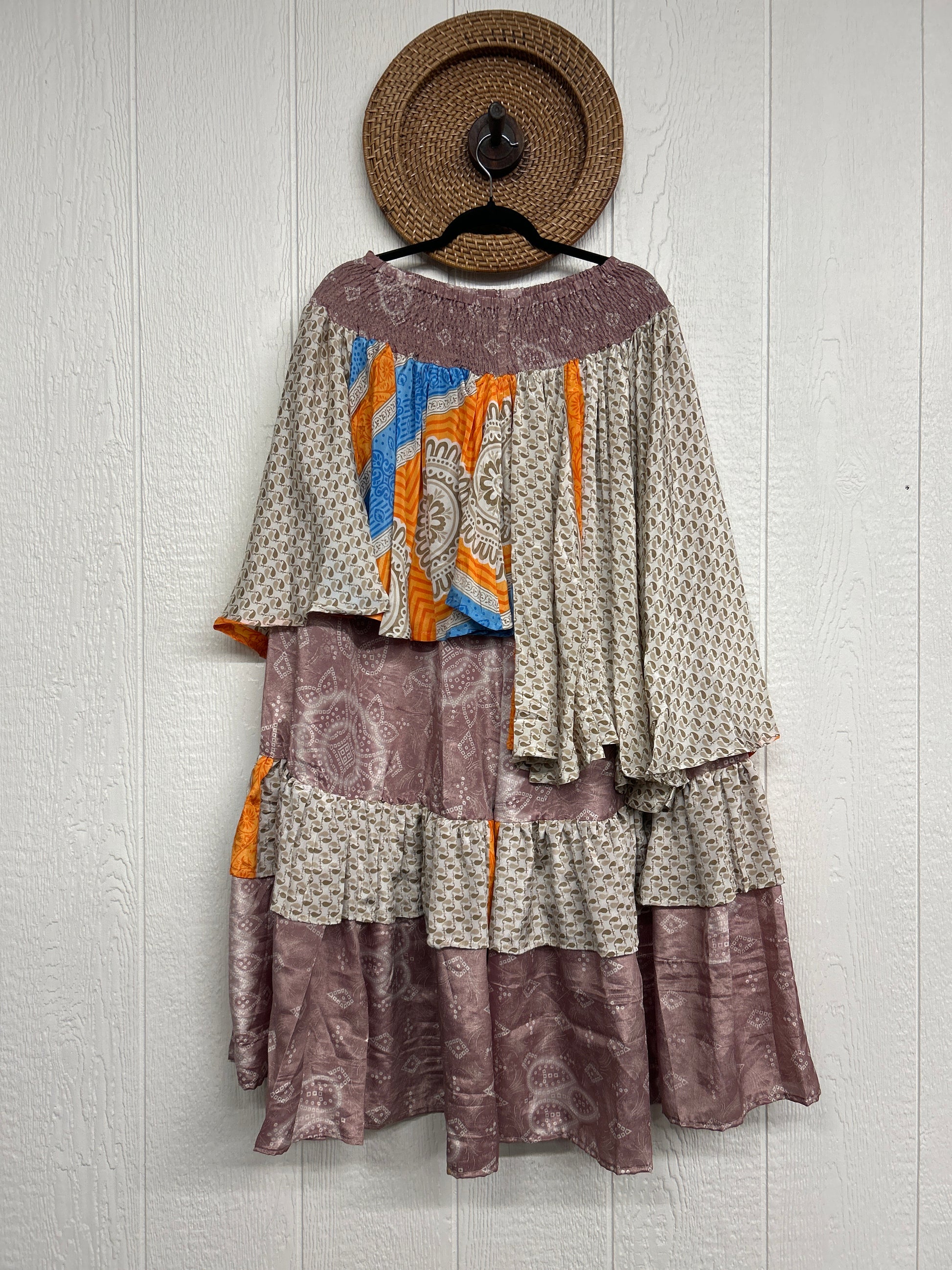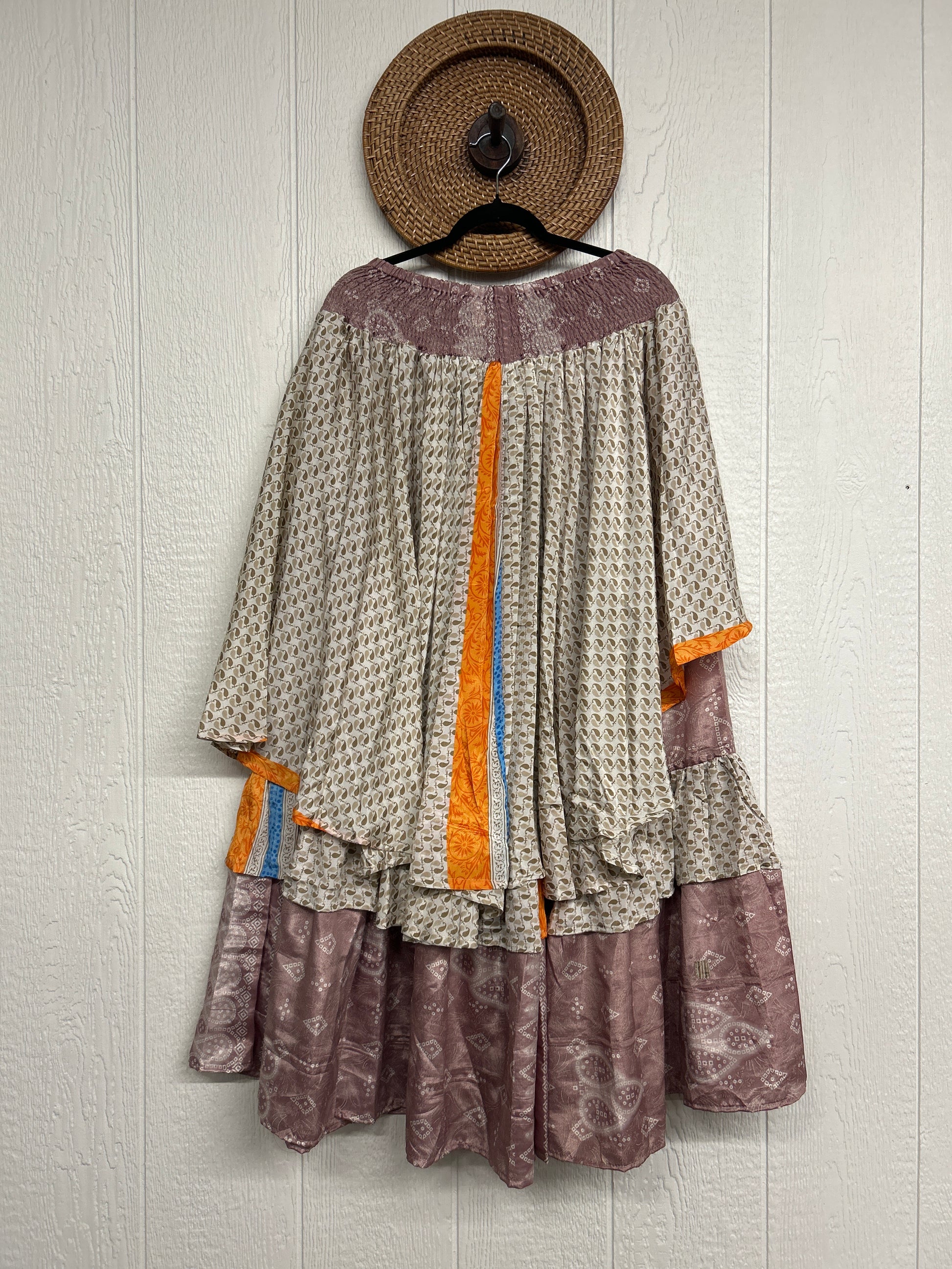 Crafted from vintage rasgulla sari these ethereal pants features stretchy waist, super wide legs, double tier hem and a skirt layer. these pants will make you want to dance! One size, recommended up to size 22/24 Crafted and sewn by families in a small village in Northern India providing work and a fair living. This product should be hand washed and line dried for longest life. For softness, fluff in the dryer on low heat after it has dried from hand washing. Disclosure: Our vintage styles have lived a full life before becoming the designs in our shop. Fabrics may have small threads or holes in the layers. Color inconsistency or small stains may be present. The saris are sewn together and extend the life of each design. Imperfections should be celebrated.