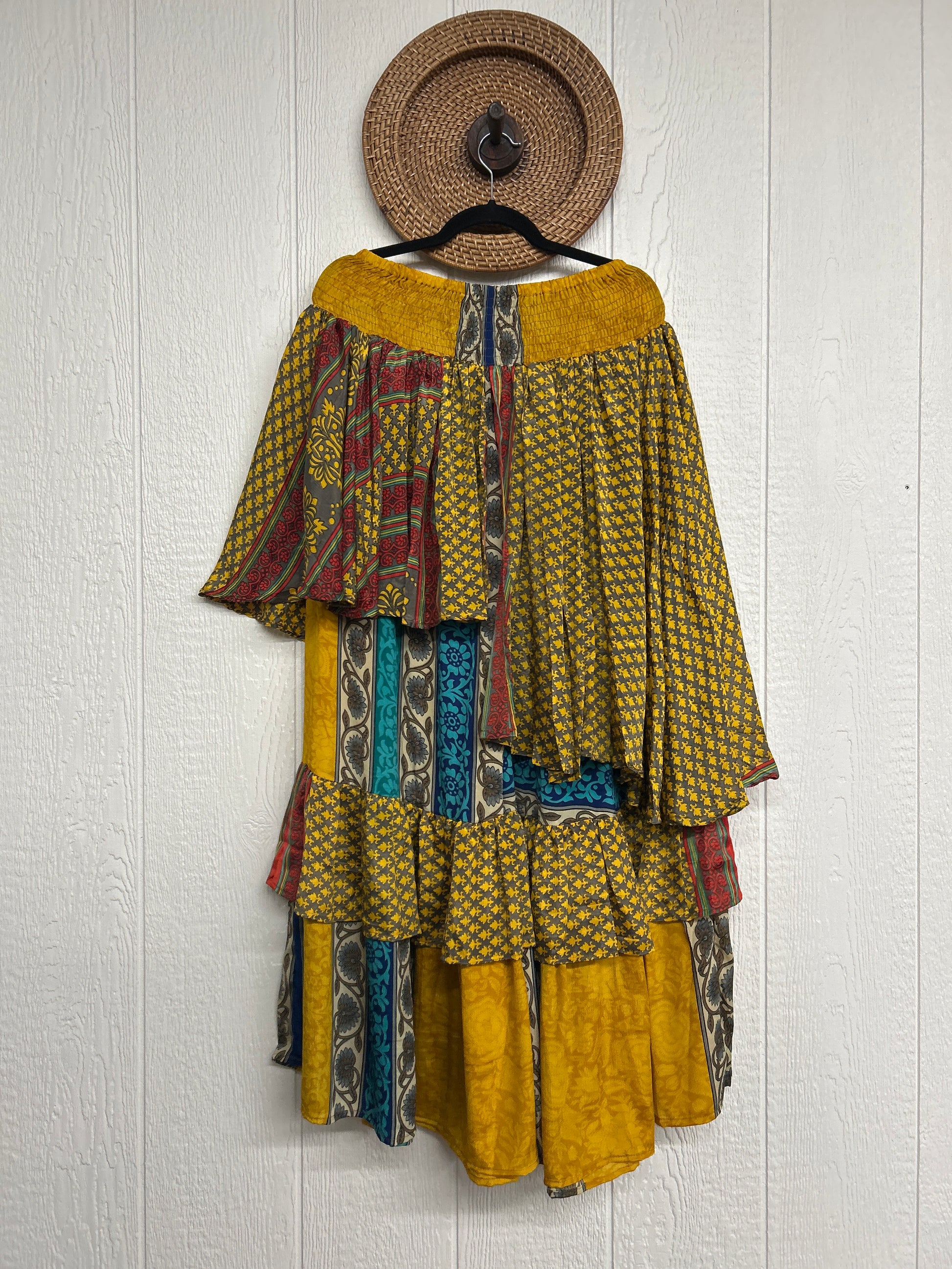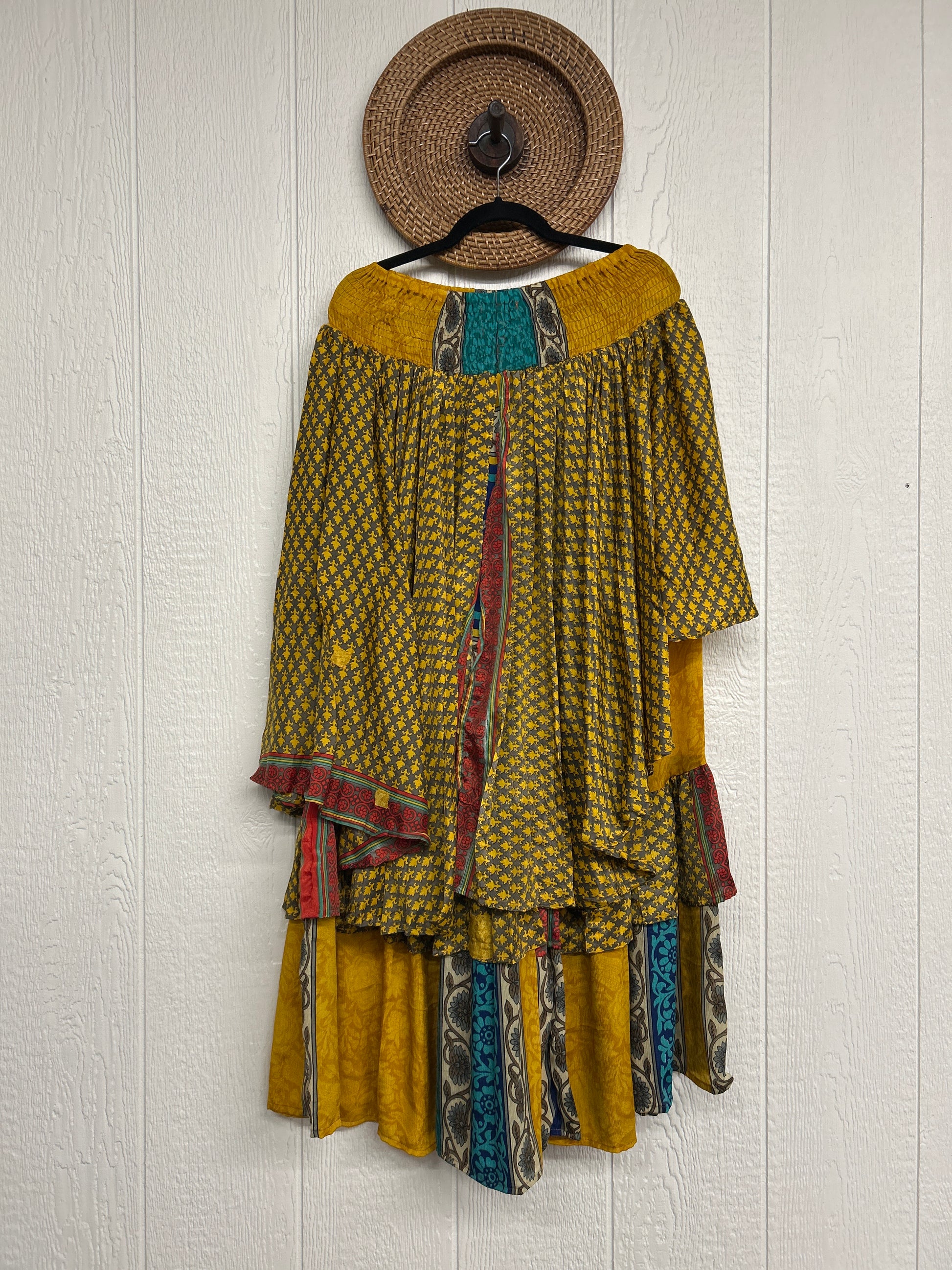 Crafted from vintage rasgulla sari these ethereal pants features stretchy waist, super wide legs, double tier hem and a skirt layer. these pants will make you want to dance! One size, recommended up to size 22/24 Crafted and sewn by families in a small village in Northern India providing work and a fair living. This product should be hand washed and line dried for longest life. For softness, fluff in the dryer on low heat after it has dried from hand washing. Disclosure: Our vintage styles have lived a full life before becoming the designs in our shop. Fabrics may have small threads or holes in the layers. Color inconsistency or small stains may be present. The saris are sewn together and extend the life of each design. Imperfections should be celebrated.