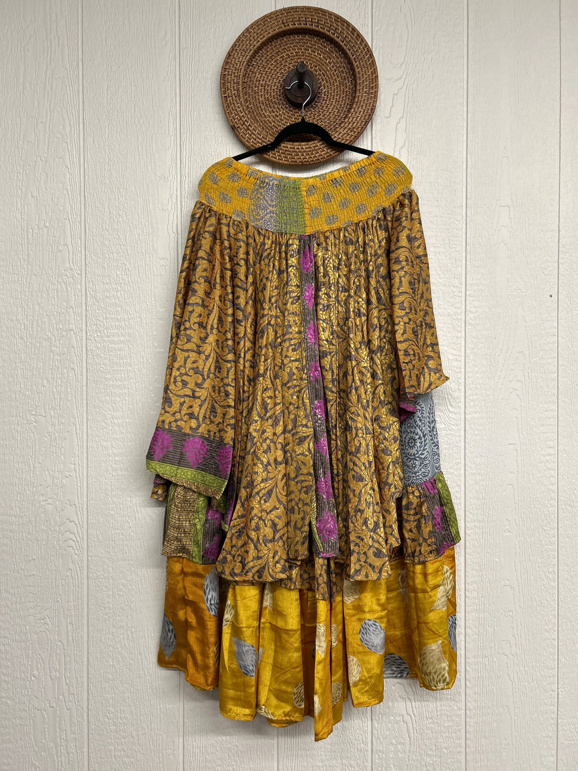 Crafted from vintage rasgulla sari these ethereal pants features stretchy waist, super wide legs, double tier hem and a skirt layer. these pants will make you want to dance! One size, recommended up to size 22/24 Crafted and sewn by families in a small village in Northern India providing work and a fair living. This product should be hand washed and line dried for longest life. For softness, fluff in the dryer on low heat after it has dried from hand washing. Disclosure: Our vintage styles have lived a full life before becoming the designs in our shop. Fabrics may have small threads or holes in the layers. Color inconsistency or small stains may be present. The saris are sewn together and extend the life of each design. Imperfections should be celebrated.