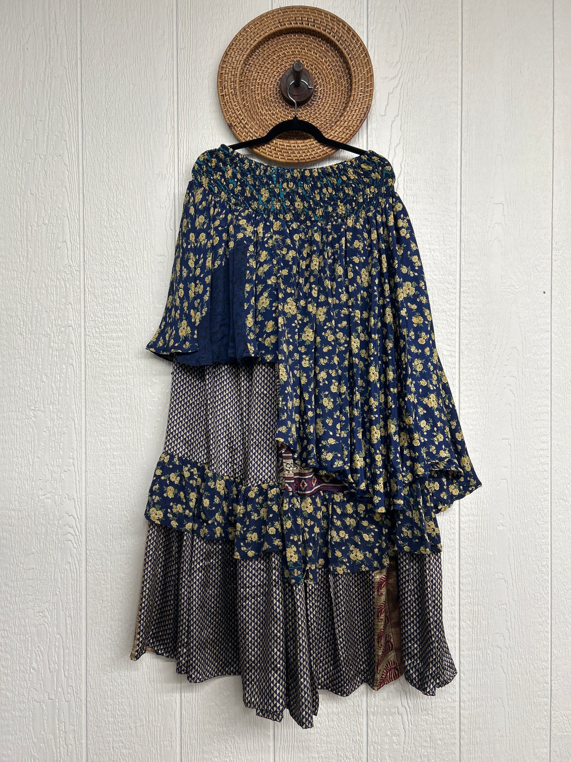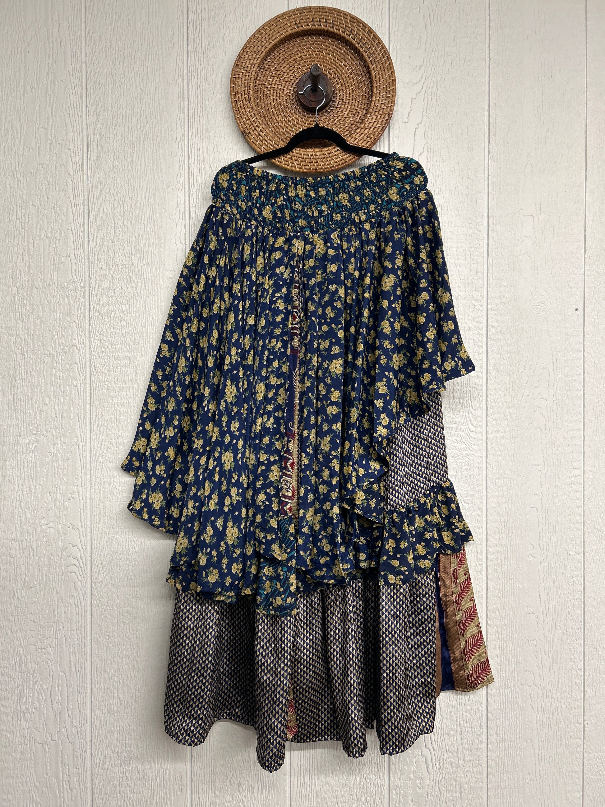 Crafted from vintage rasgulla sari these ethereal pants features stretchy waist, super wide legs, double tier hem and a skirt layer. these pants will make you want to dance! One size, recommended up to size 22/24 Crafted and sewn by families in a small village in Northern India providing work and a fair living. This product should be hand washed and line dried for longest life. For softness, fluff in the dryer on low heat after it has dried from hand washing. Disclosure: Our vintage styles have lived a full life before becoming the designs in our shop. Fabrics may have small threads or holes in the layers. Color inconsistency or small stains may be present. The saris are sewn together and extend the life of each design. Imperfections should be celebrated.