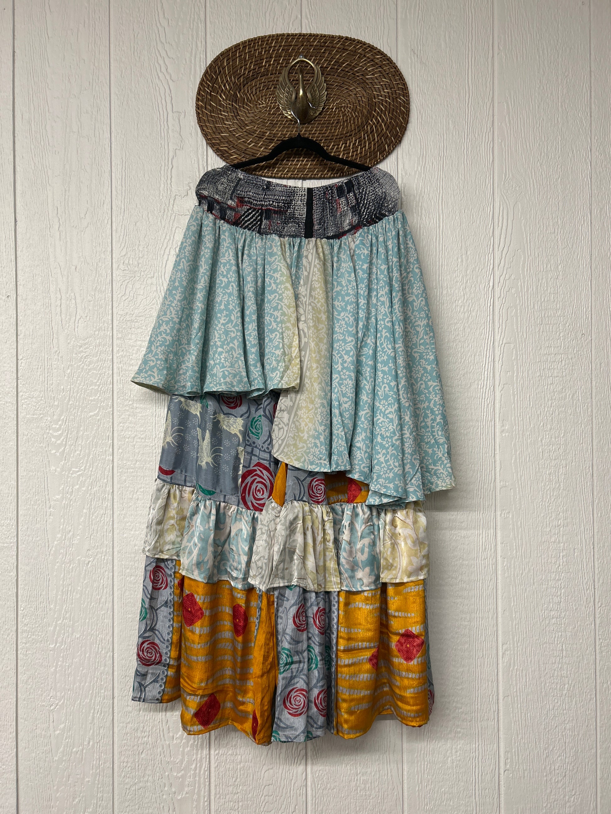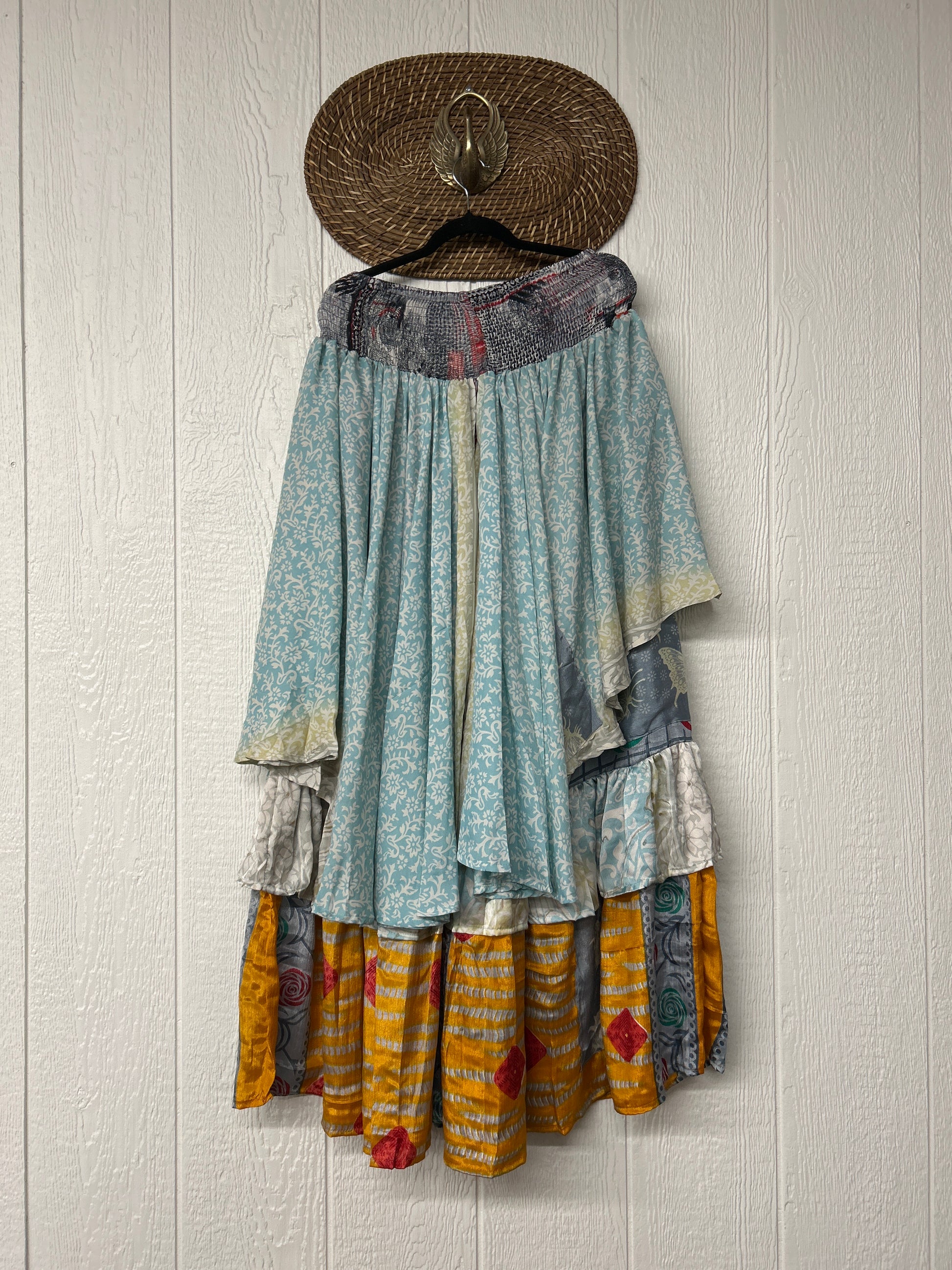 Crafted from vintage rasgulla sari these ethereal pants features stretchy waist, super wide legs, double tier hem and a skirt layer. these pants will make you want to dance! One size, recommended up to size 22/24 Crafted and sewn by families in a small village in Northern India providing work and a fair living. This product should be hand washed and line dried for longest life. For softness, fluff in the dryer on low heat after it has dried from hand washing. Disclosure: Our vintage styles have lived a full life before becoming the designs in our shop. Fabrics may have small threads or holes in the layers. Color inconsistency or small stains may be present. The saris are sewn together and extend the life of each design. Imperfections should be celebrated.