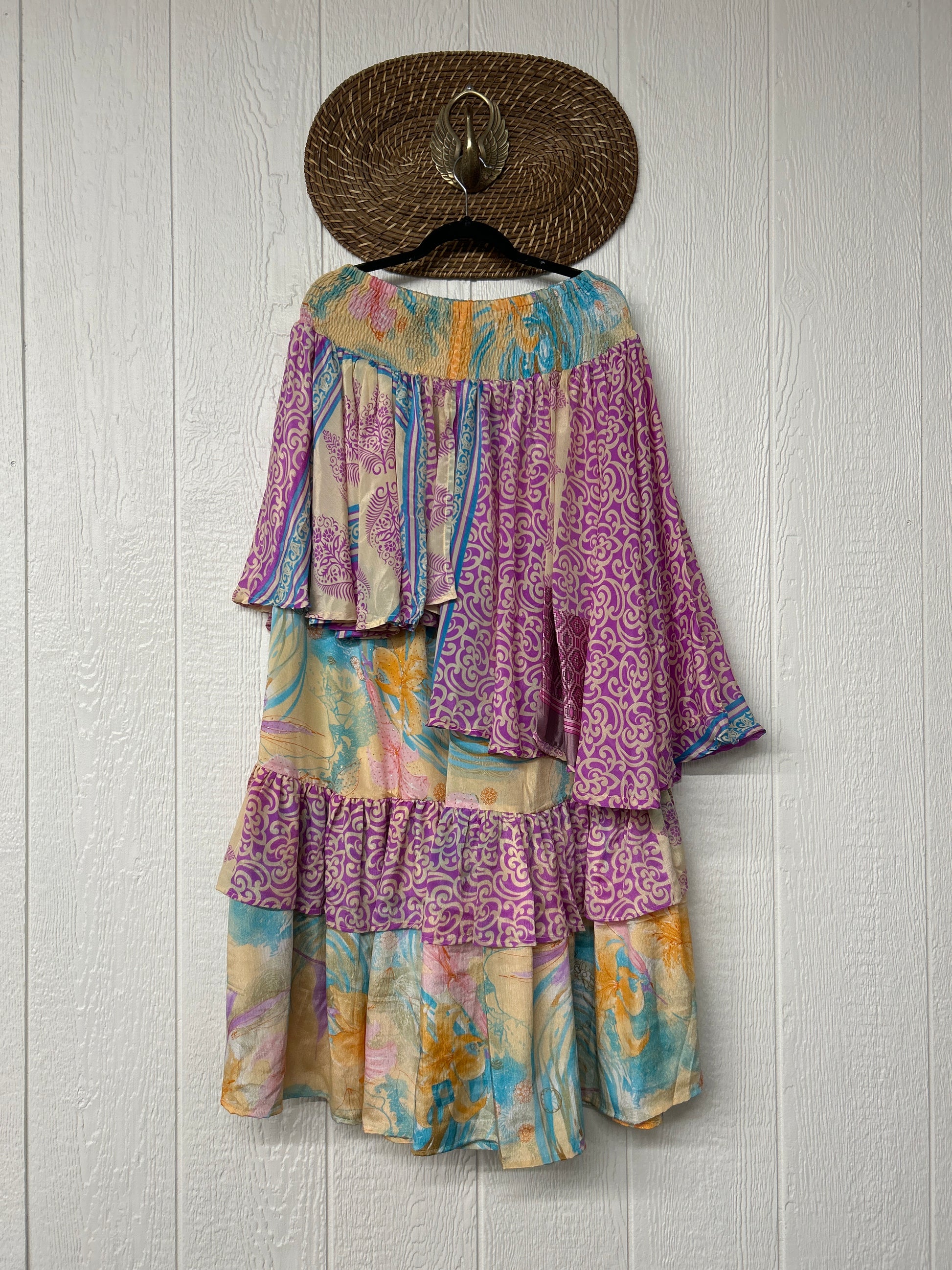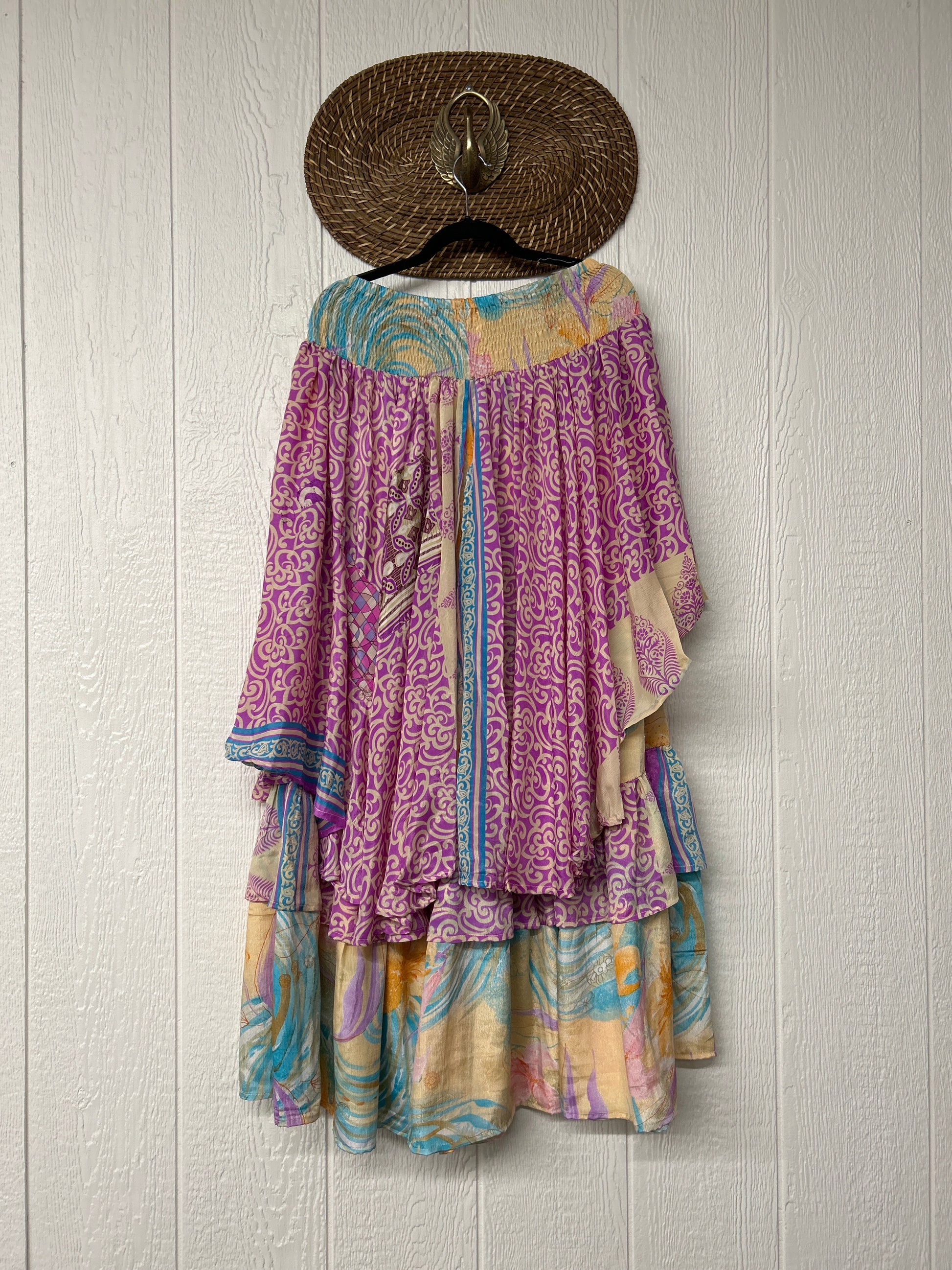 Crafted from vintage rasgulla sari these ethereal pants features stretchy waist, super wide legs, double tier hem and a skirt layer. these pants will make you want to dance! One size, recommended up to size 22/24 Crafted and sewn by families in a small village in Northern India providing work and a fair living. This product should be hand washed and line dried for longest life. For softness, fluff in the dryer on low heat after it has dried from hand washing. Disclosure: Our vintage styles have lived a full life before becoming the designs in our shop. Fabrics may have small threads or holes in the layers. Color inconsistency or small stains may be present. The saris are sewn together and extend the life of each design. Imperfections should be celebrated.