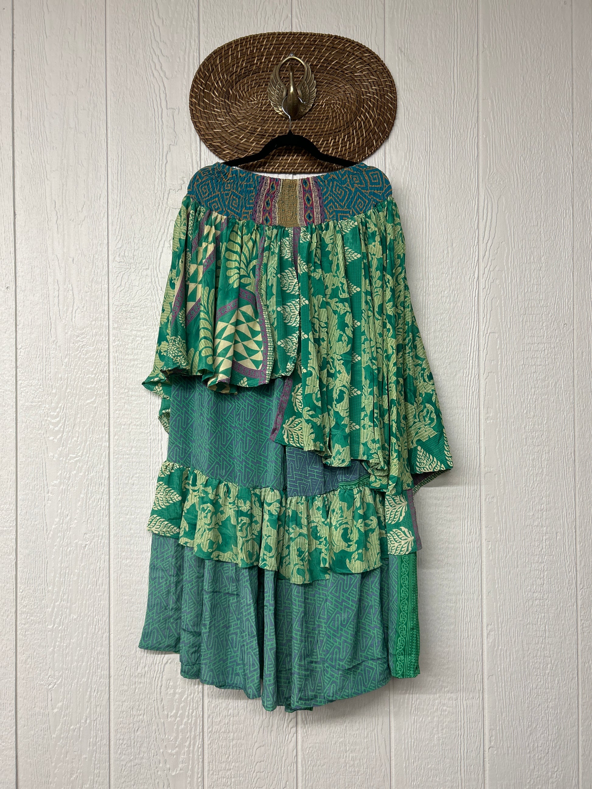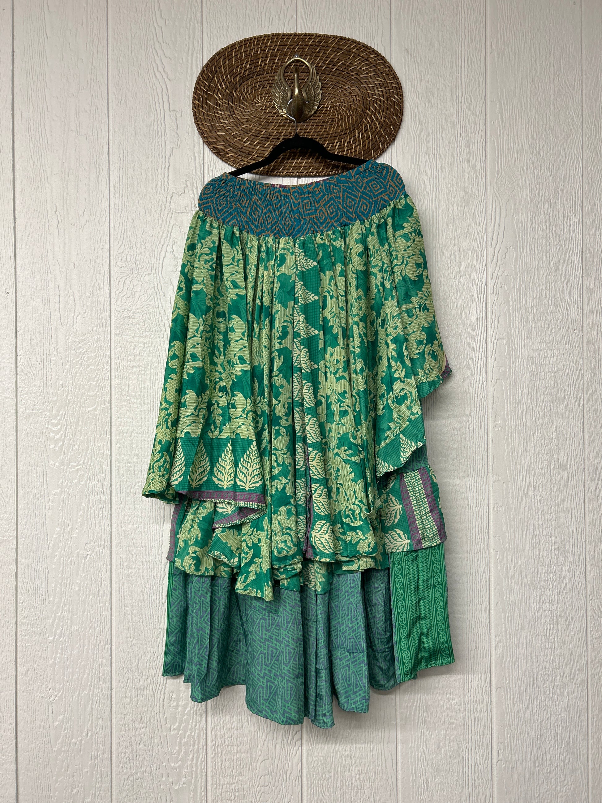 Crafted from vintage rasgulla sari these ethereal pants features stretchy waist, super wide legs, double tier hem and a skirt layer. these pants will make you want to dance! One size, recommended up to size 22/24 Crafted and sewn by families in a small village in Northern India providing work and a fair living. This product should be hand washed and line dried for longest life. For softness, fluff in the dryer on low heat after it has dried from hand washing. Disclosure: Our vintage styles have lived a full life before becoming the designs in our shop. Fabrics may have small threads or holes in the layers. Color inconsistency or small stains may be present. The saris are sewn together and extend the life of each design. Imperfections should be celebrated.