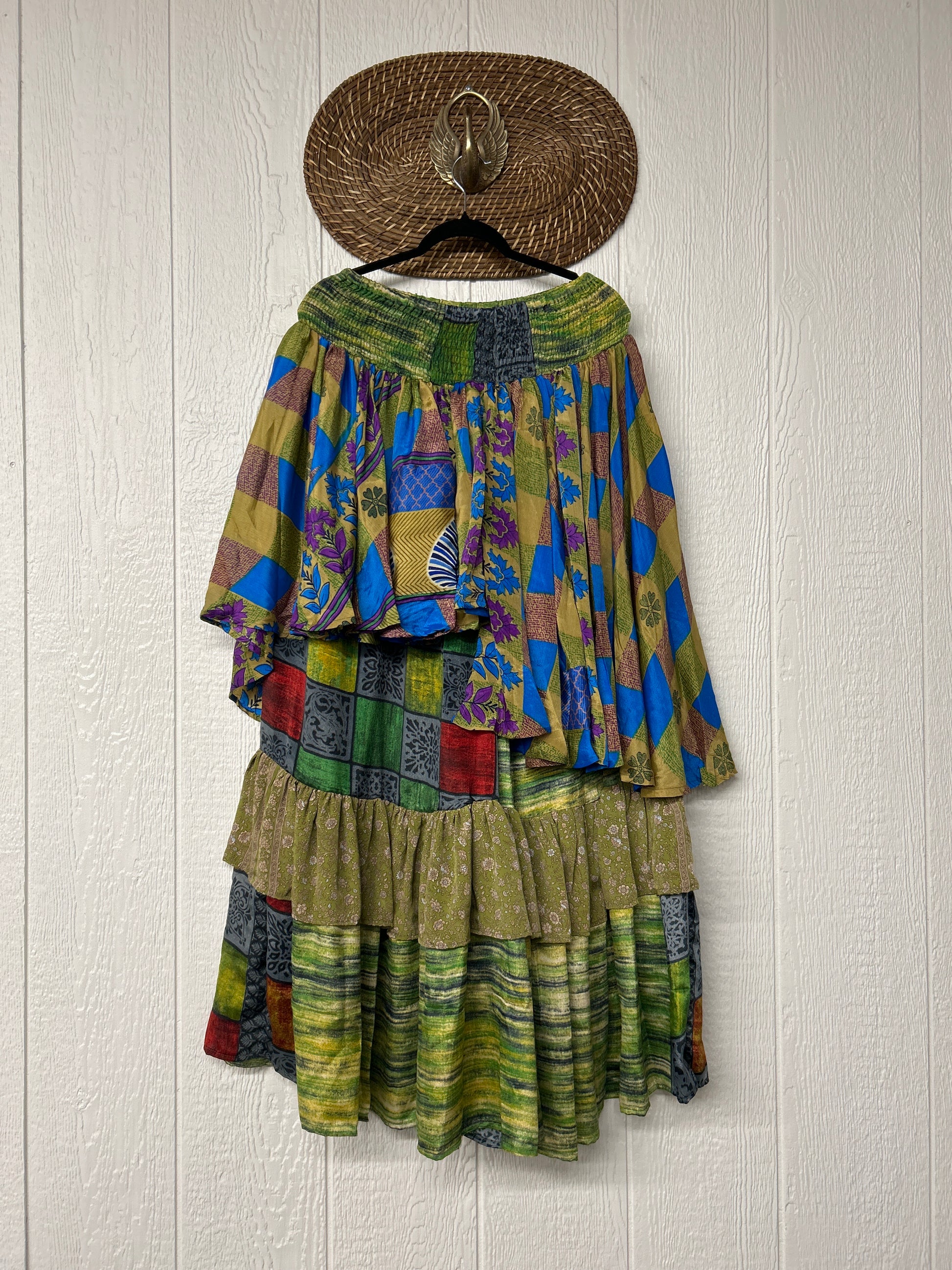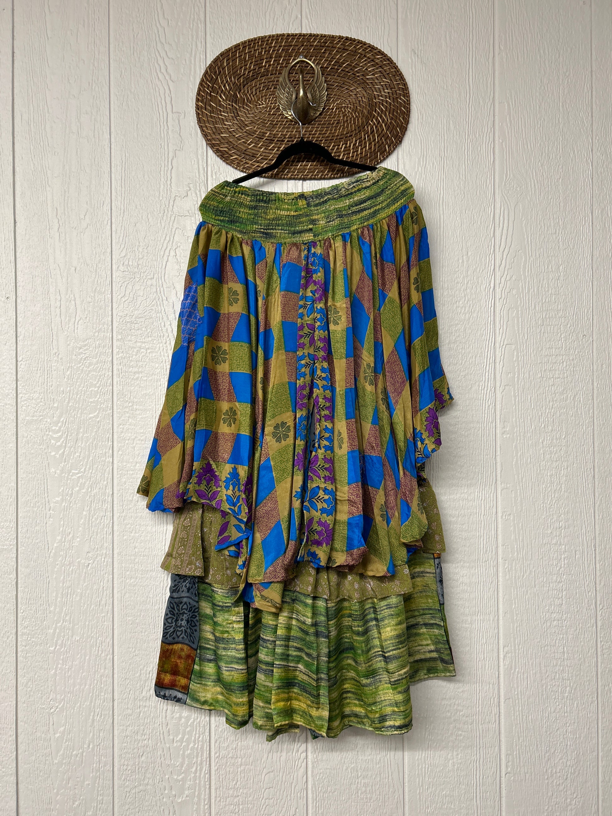 Crafted from vintage rasgulla sari these ethereal pants features stretchy waist, super wide legs, double tier hem and a skirt layer. these pants will make you want to dance! One size, recommended up to size 22/24 Crafted and sewn by families in a small village in Northern India providing work and a fair living. This product should be hand washed and line dried for longest life. For softness, fluff in the dryer on low heat after it has dried from hand washing. Disclosure: Our vintage styles have lived a full life before becoming the designs in our shop. Fabrics may have small threads or holes in the layers. Color inconsistency or small stains may be present. The saris are sewn together and extend the life of each design. Imperfections should be celebrated.