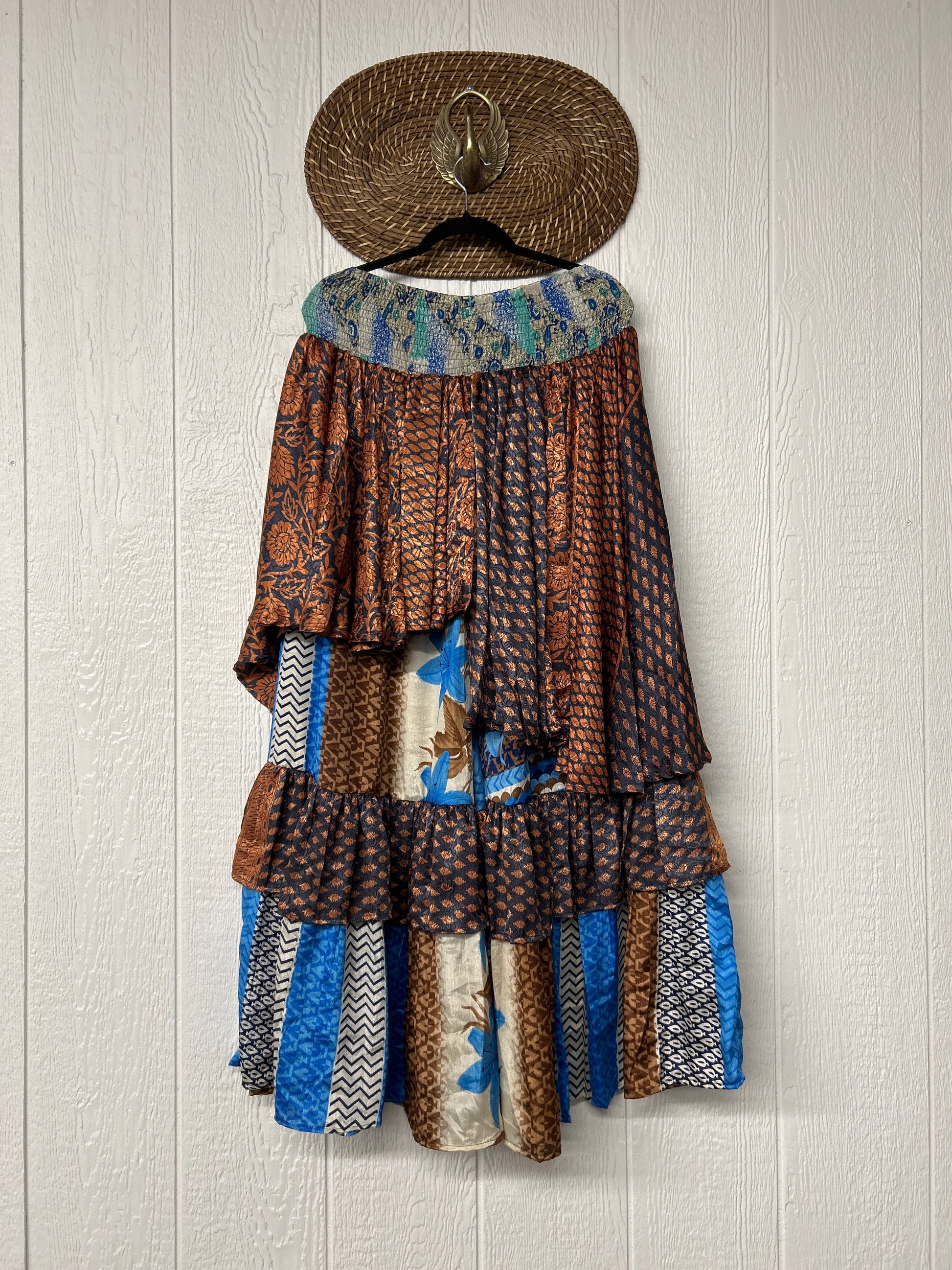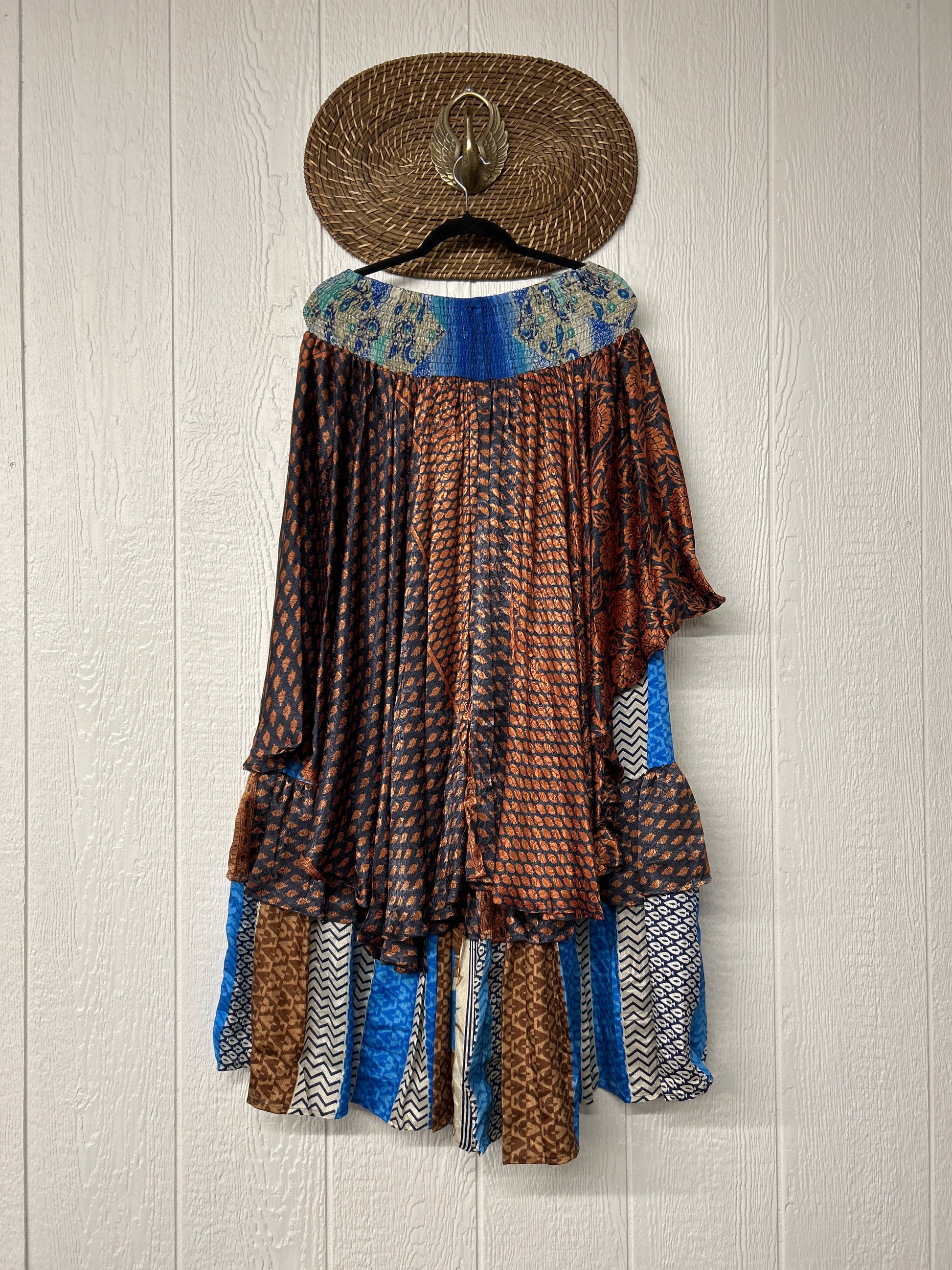 Crafted from vintage rasgulla sari these ethereal pants features stretchy waist, super wide legs, double tier hem and a skirt layer. these pants will make you want to dance! One size, recommended up to size 22/24 Crafted and sewn by families in a small village in Northern India providing work and a fair living. This product should be hand washed and line dried for longest life. For softness, fluff in the dryer on low heat after it has dried from hand washing. Disclosure: Our vintage styles have lived a full life before becoming the designs in our shop. Fabrics may have small threads or holes in the layers. Color inconsistency or small stains may be present. The saris are sewn together and extend the life of each design. Imperfections should be celebrated.