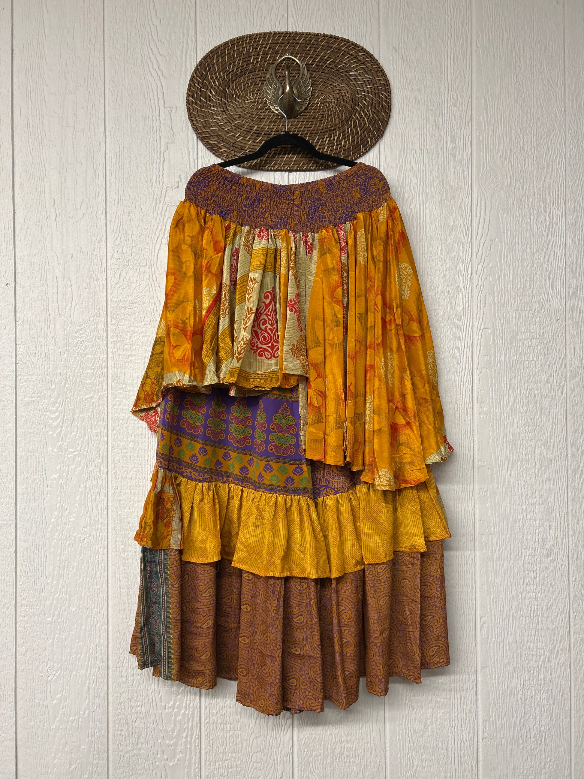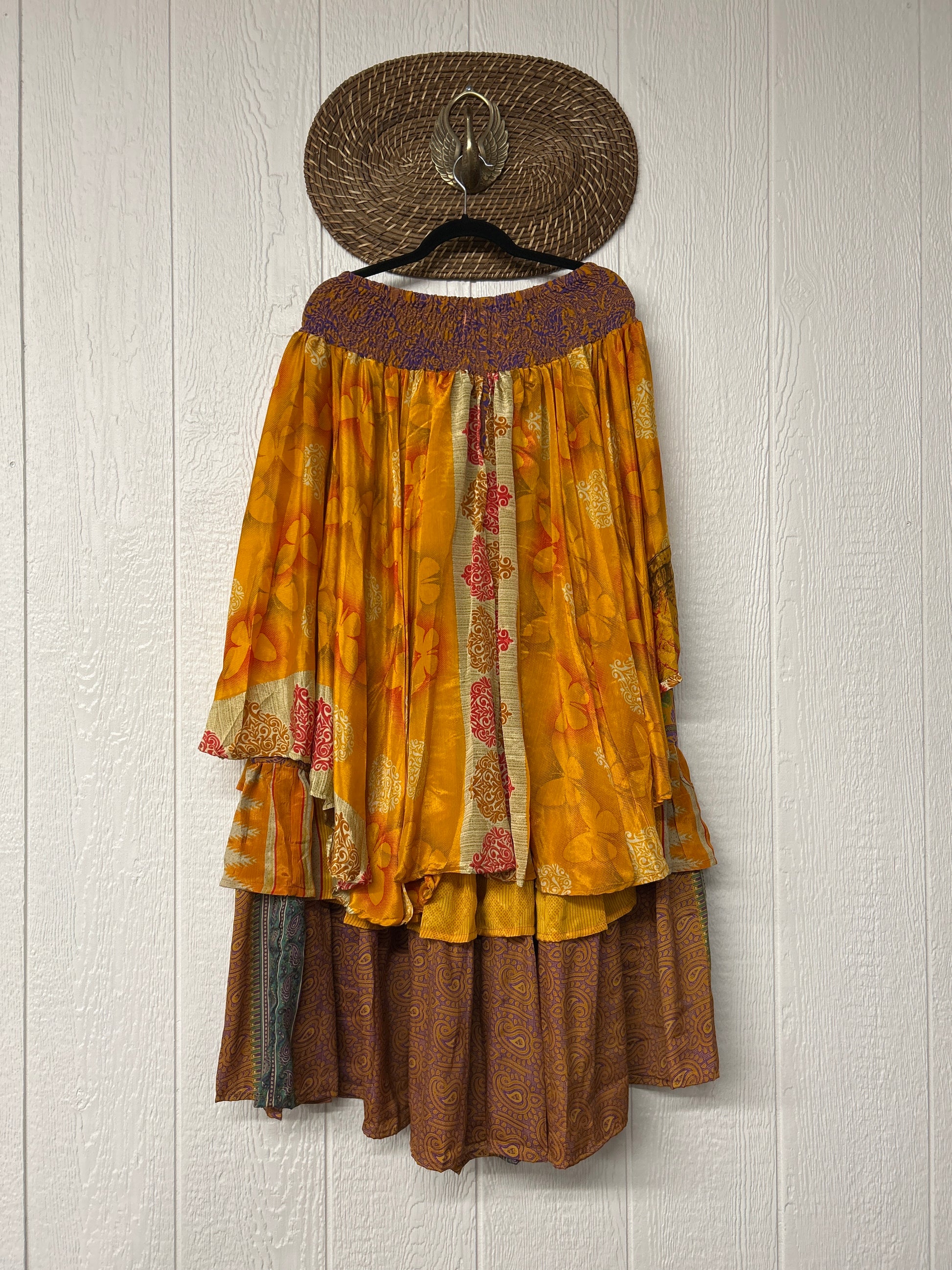 Crafted from vintage rasgulla sari these ethereal pants features stretchy waist, super wide legs, double tier hem and a skirt layer. these pants will make you want to dance! One size, recommended up to size 22/24 Crafted and sewn by families in a small village in Northern India providing work and a fair living. This product should be hand washed and line dried for longest life. For softness, fluff in the dryer on low heat after it has dried from hand washing. Disclosure: Our vintage styles have lived a full life before becoming the designs in our shop. Fabrics may have small threads or holes in the layers. Color inconsistency or small stains may be present. The saris are sewn together and extend the life of each design. Imperfections should be celebrated.