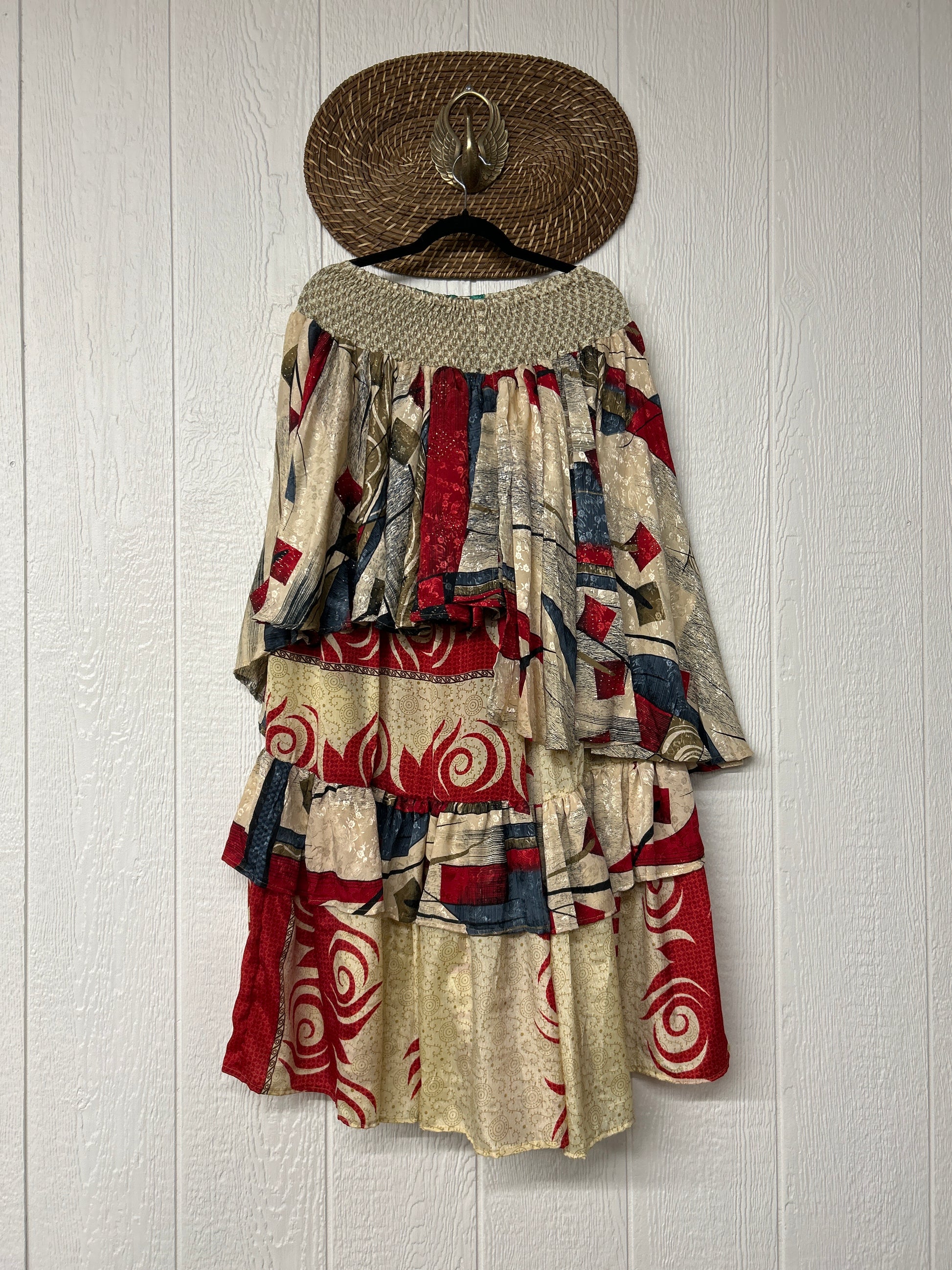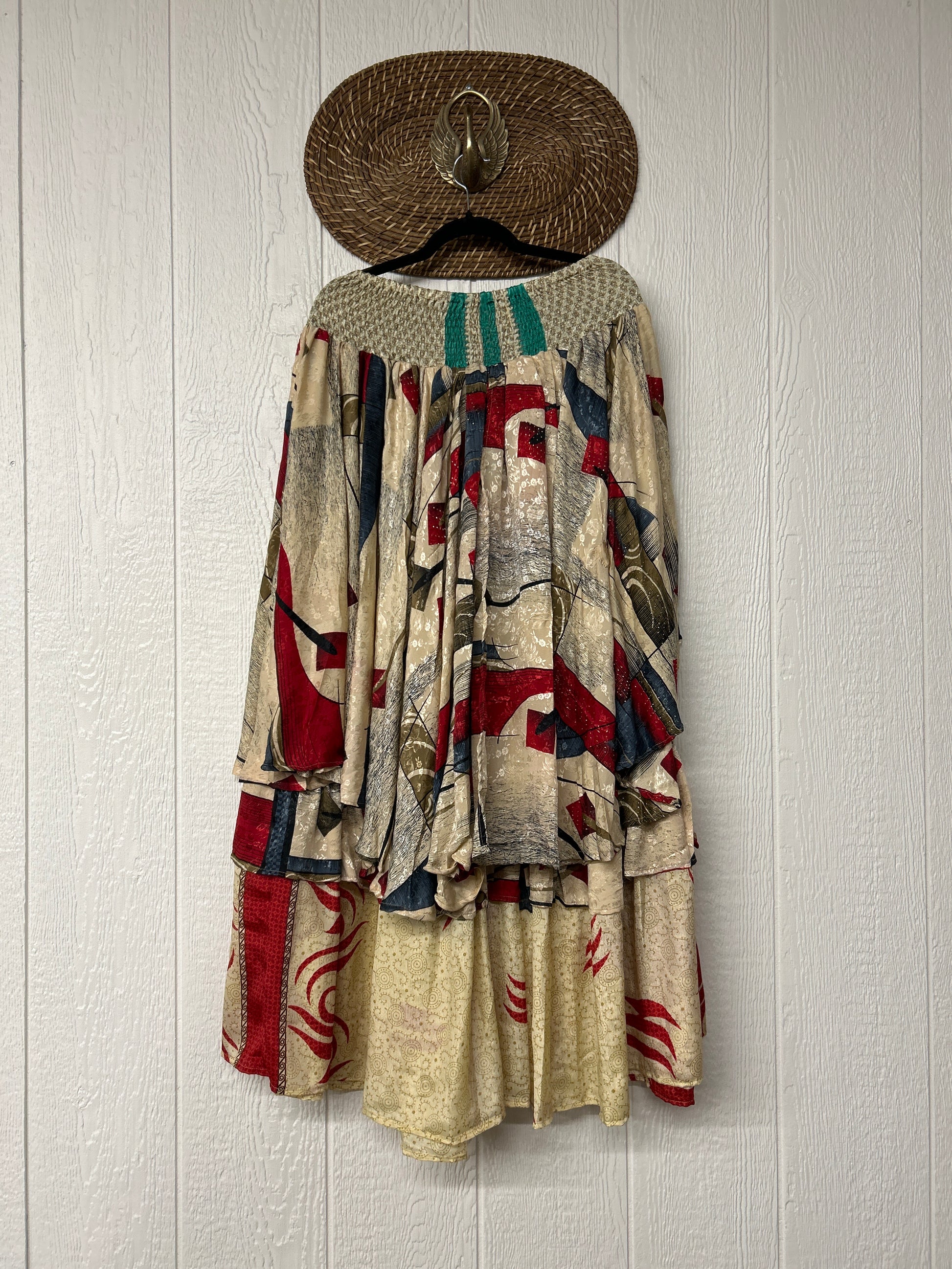 Crafted from vintage rasgulla sari these ethereal pants features stretchy waist, super wide legs, double tier hem and a skirt layer. these pants will make you want to dance! One size, recommended up to size 22/24 Crafted and sewn by families in a small village in Northern India providing work and a fair living. This product should be hand washed and line dried for longest life. For softness, fluff in the dryer on low heat after it has dried from hand washing. Disclosure: Our vintage styles have lived a full life before becoming the designs in our shop. Fabrics may have small threads or holes in the layers. Color inconsistency or small stains may be present. The saris are sewn together and extend the life of each design. Imperfections should be celebrated.