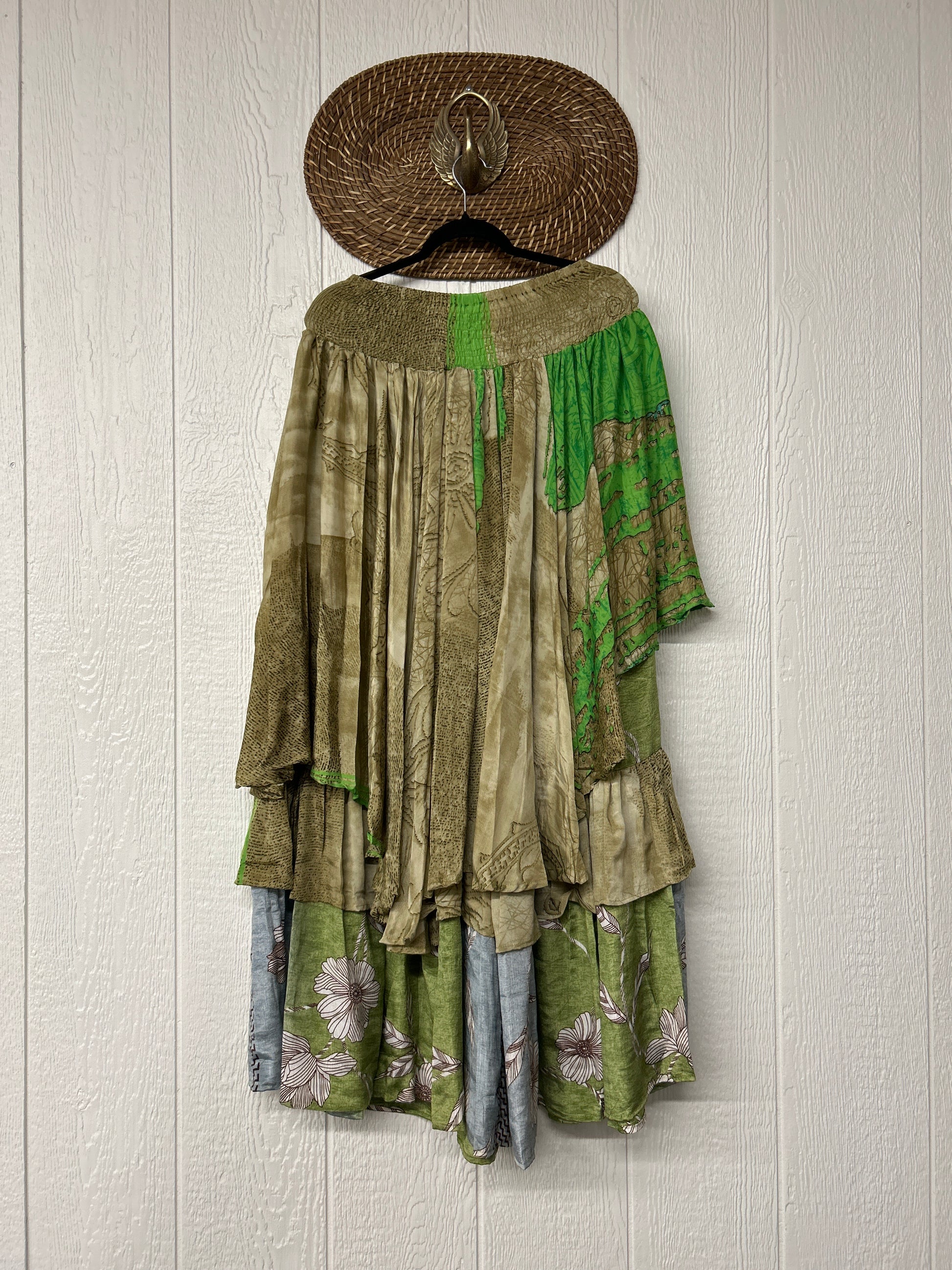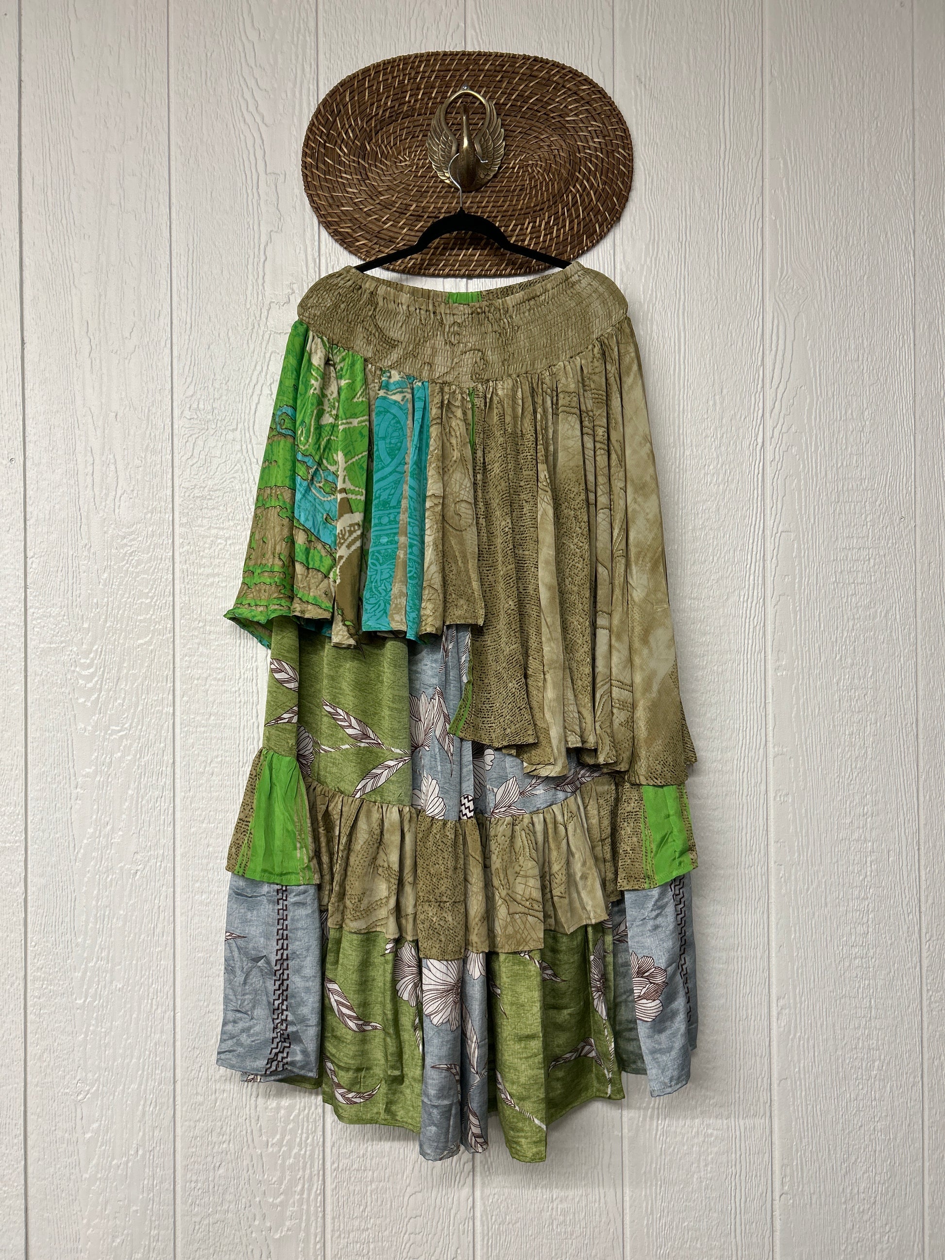 Crafted from vintage rasgulla sari these ethereal pants features stretchy waist, super wide legs, double tier hem and a skirt layer. these pants will make you want to dance! One size, recommended up to size 22/24 Crafted and sewn by families in a small village in Northern India providing work and a fair living. This product should be hand washed and line dried for longest life. For softness, fluff in the dryer on low heat after it has dried from hand washing. Disclosure: Our vintage styles have lived a full life before becoming the designs in our shop. Fabrics may have small threads or holes in the layers. Color inconsistency or small stains may be present. The saris are sewn together and extend the life of each design. Imperfections should be celebrated.