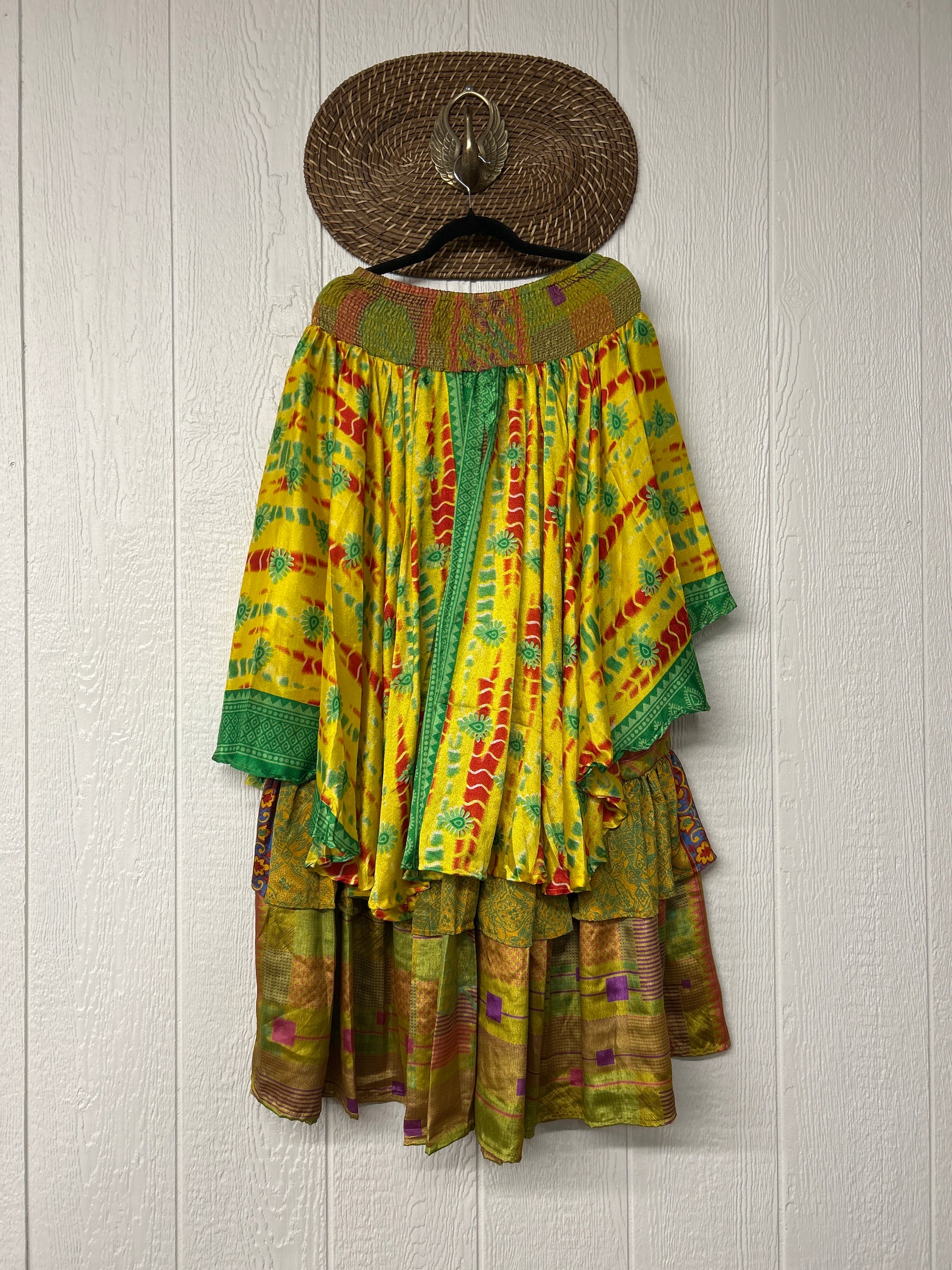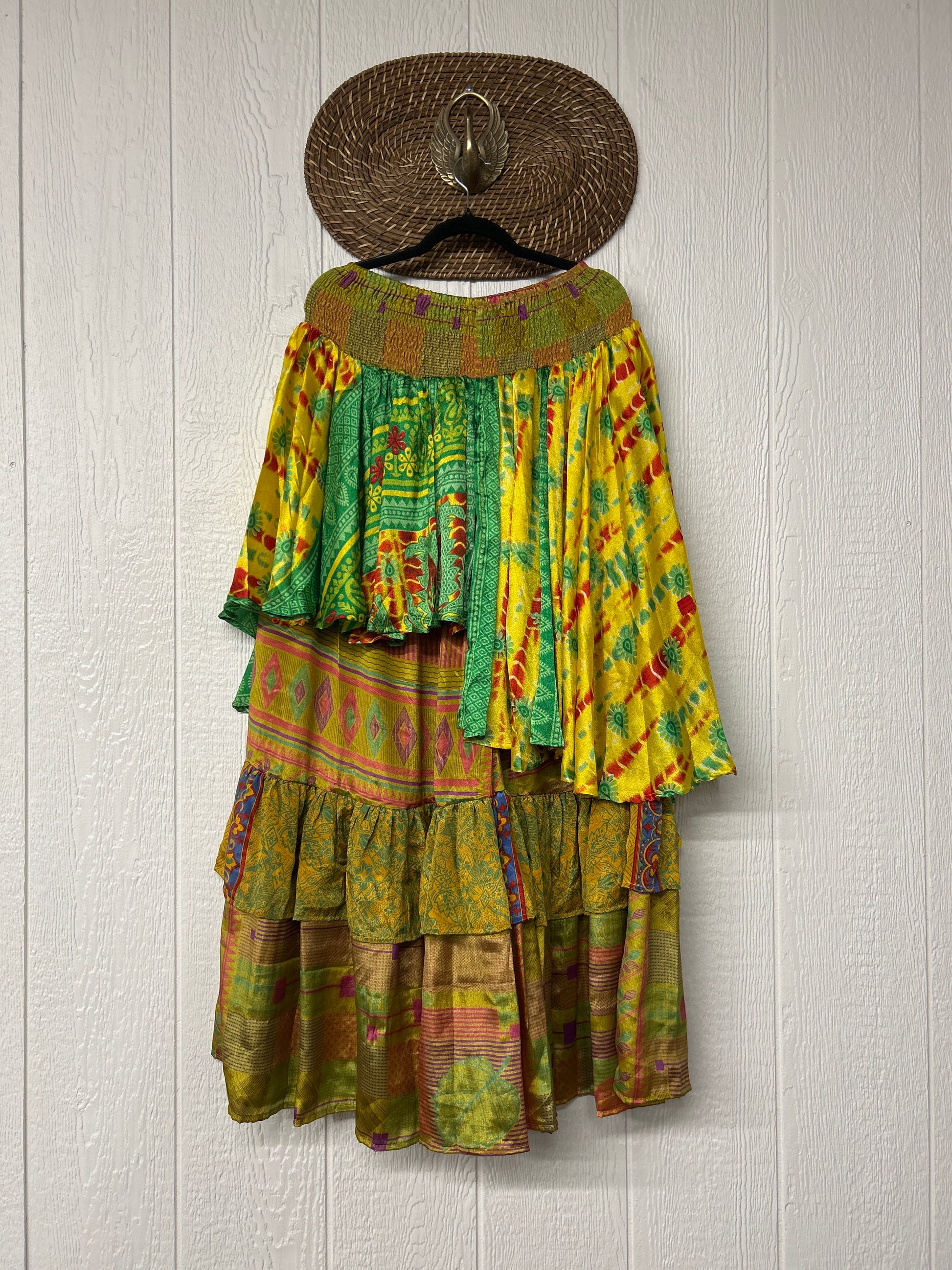 Crafted from vintage rasgulla sari these ethereal pants features stretchy waist, super wide legs, double tier hem and a skirt layer. these pants will make you want to dance! One size, recommended up to size 22/24 Crafted and sewn by families in a small village in Northern India providing work and a fair living. This product should be hand washed and line dried for longest life. For softness, fluff in the dryer on low heat after it has dried from hand washing. Disclosure: Our vintage styles have lived a full life before becoming the designs in our shop. Fabrics may have small threads or holes in the layers. Color inconsistency or small stains may be present. The saris are sewn together and extend the life of each design. Imperfections should be celebrated.