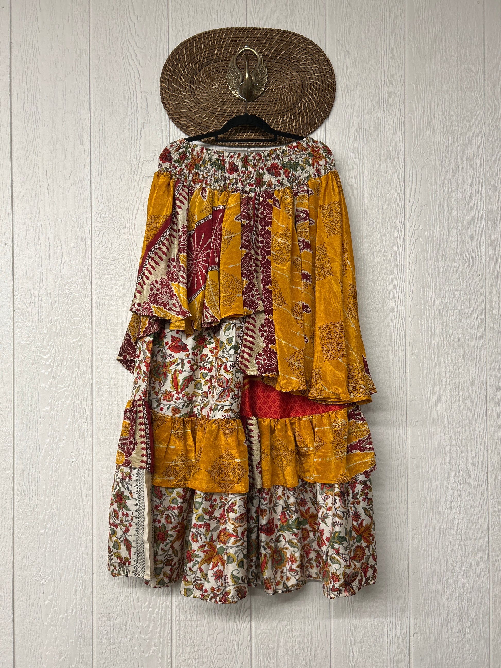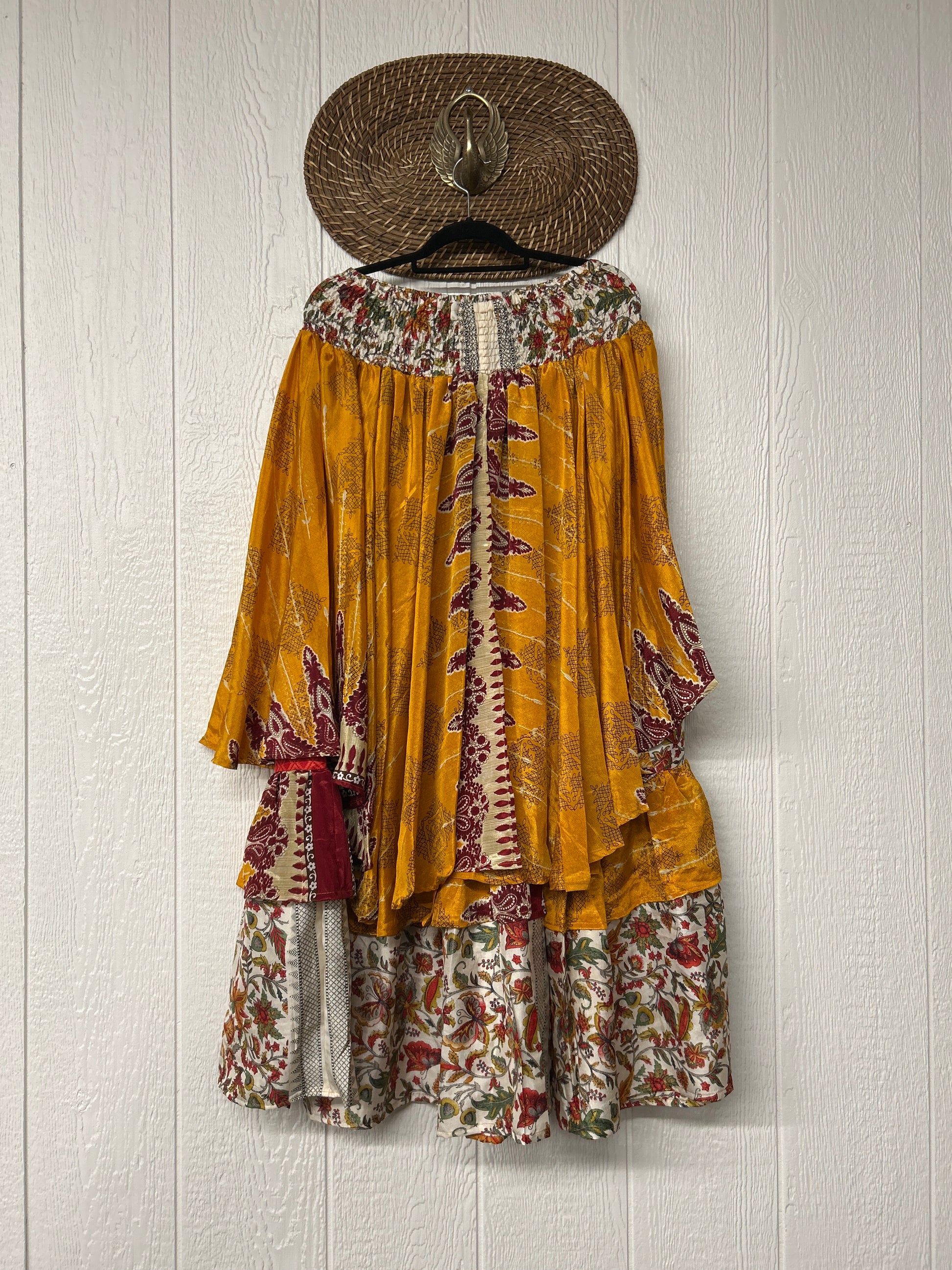 Crafted from vintage rasgulla sari these ethereal pants features stretchy waist, super wide legs, double tier hem and a skirt layer. these pants will make you want to dance! One size, recommended up to size 22/24 Crafted and sewn by families in a small village in Northern India providing work and a fair living. This product should be hand washed and line dried for longest life. For softness, fluff in the dryer on low heat after it has dried from hand washing. Disclosure: Our vintage styles have lived a full life before becoming the designs in our shop. Fabrics may have small threads or holes in the layers. Color inconsistency or small stains may be present. The saris are sewn together and extend the life of each design. Imperfections should be celebrated.