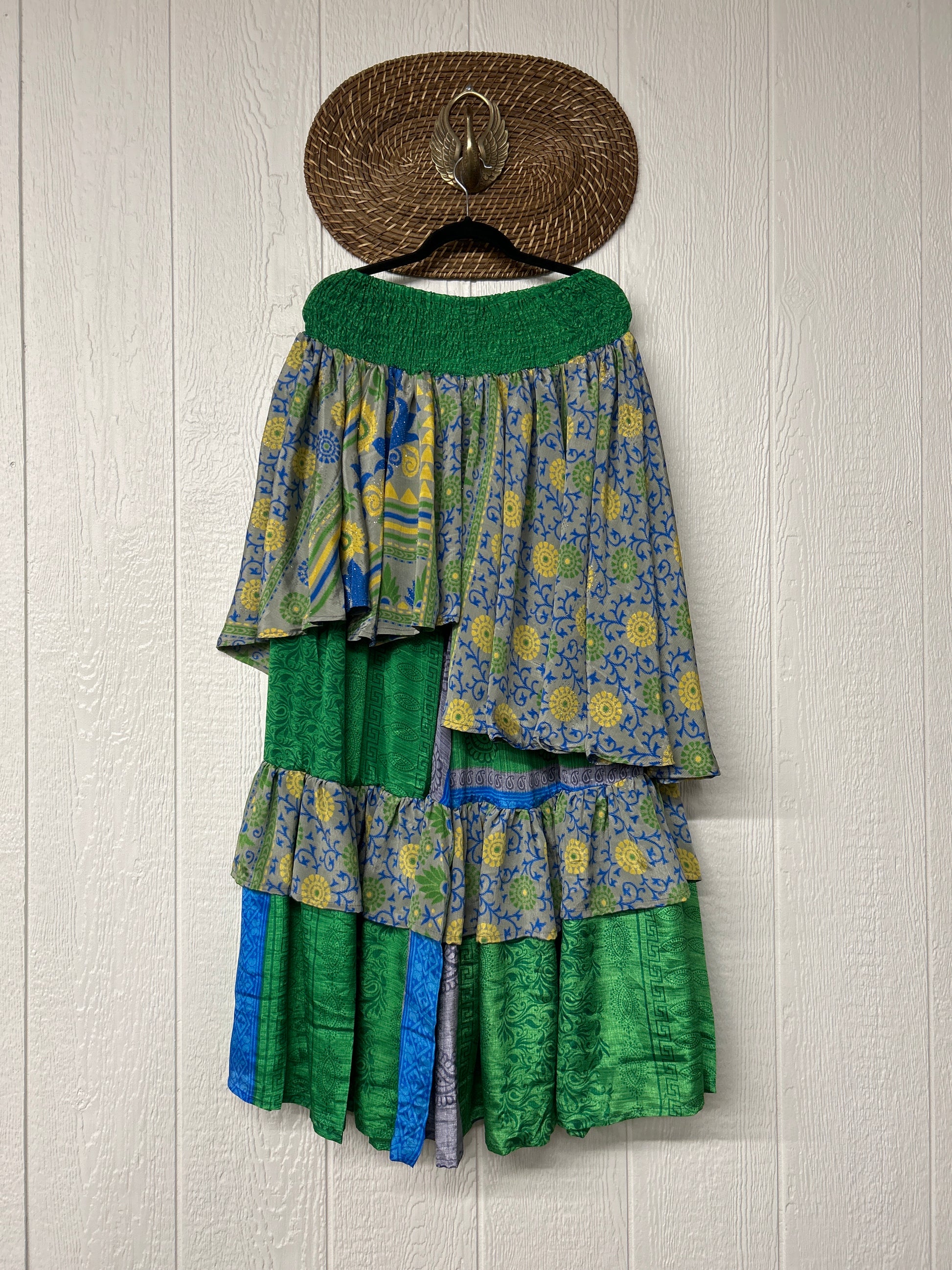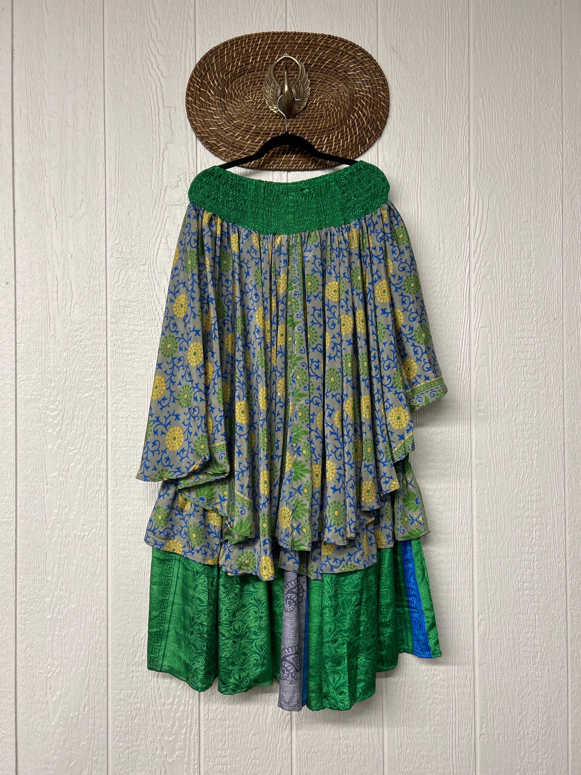 Crafted from vintage rasgulla sari these ethereal pants features stretchy waist, super wide legs, double tier hem and a skirt layer. these pants will make you want to dance! One size, recommended up to size 22/24 Crafted and sewn by families in a small village in Northern India providing work and a fair living. This product should be hand washed and line dried for longest life. For softness, fluff in the dryer on low heat after it has dried from hand washing. Disclosure: Our vintage styles have lived a full life before becoming the designs in our shop. Fabrics may have small threads or holes in the layers. Color inconsistency or small stains may be present. The saris are sewn together and extend the life of each design. Imperfections should be celebrated.