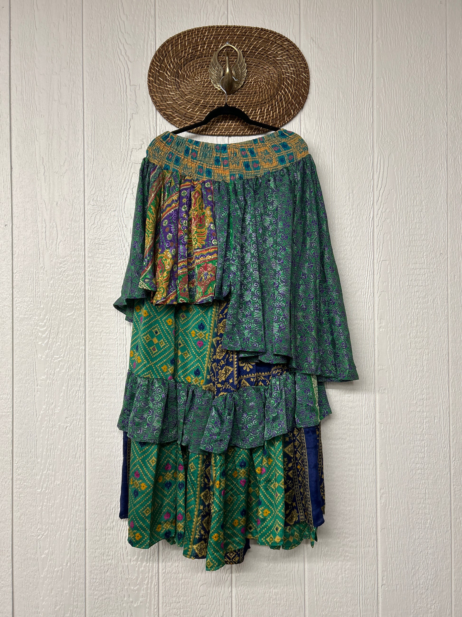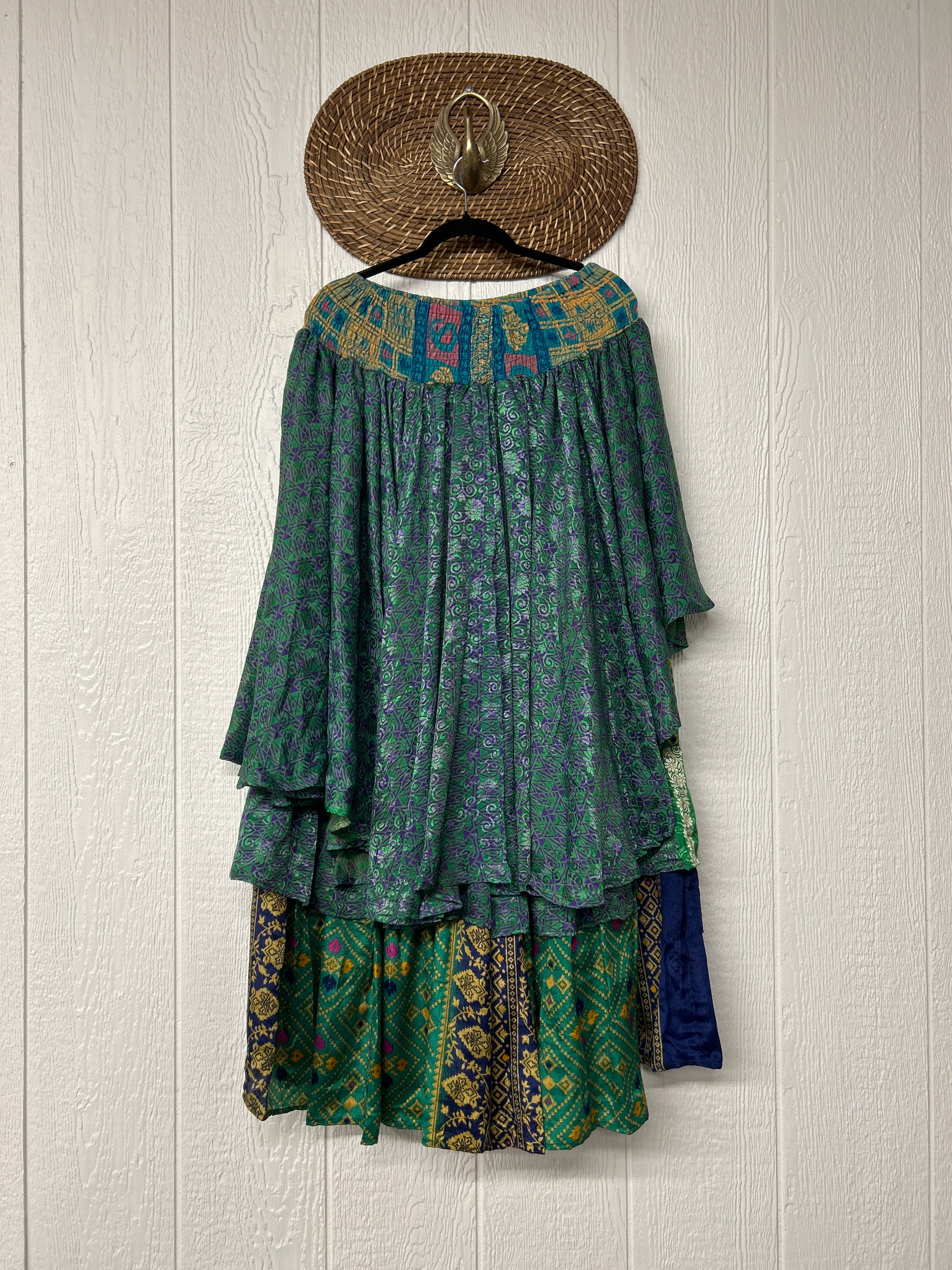 Crafted from vintage rasgulla sari these ethereal pants features stretchy waist, super wide legs, double tier hem and a skirt layer. these pants will make you want to dance! One size, recommended up to size 22/24 Crafted and sewn by families in a small village in Northern India providing work and a fair living. This product should be hand washed and line dried for longest life. For softness, fluff in the dryer on low heat after it has dried from hand washing. Disclosure: Our vintage styles have lived a full life before becoming the designs in our shop. Fabrics may have small threads or holes in the layers. Color inconsistency or small stains may be present. The saris are sewn together and extend the life of each design. Imperfections should be celebrated.