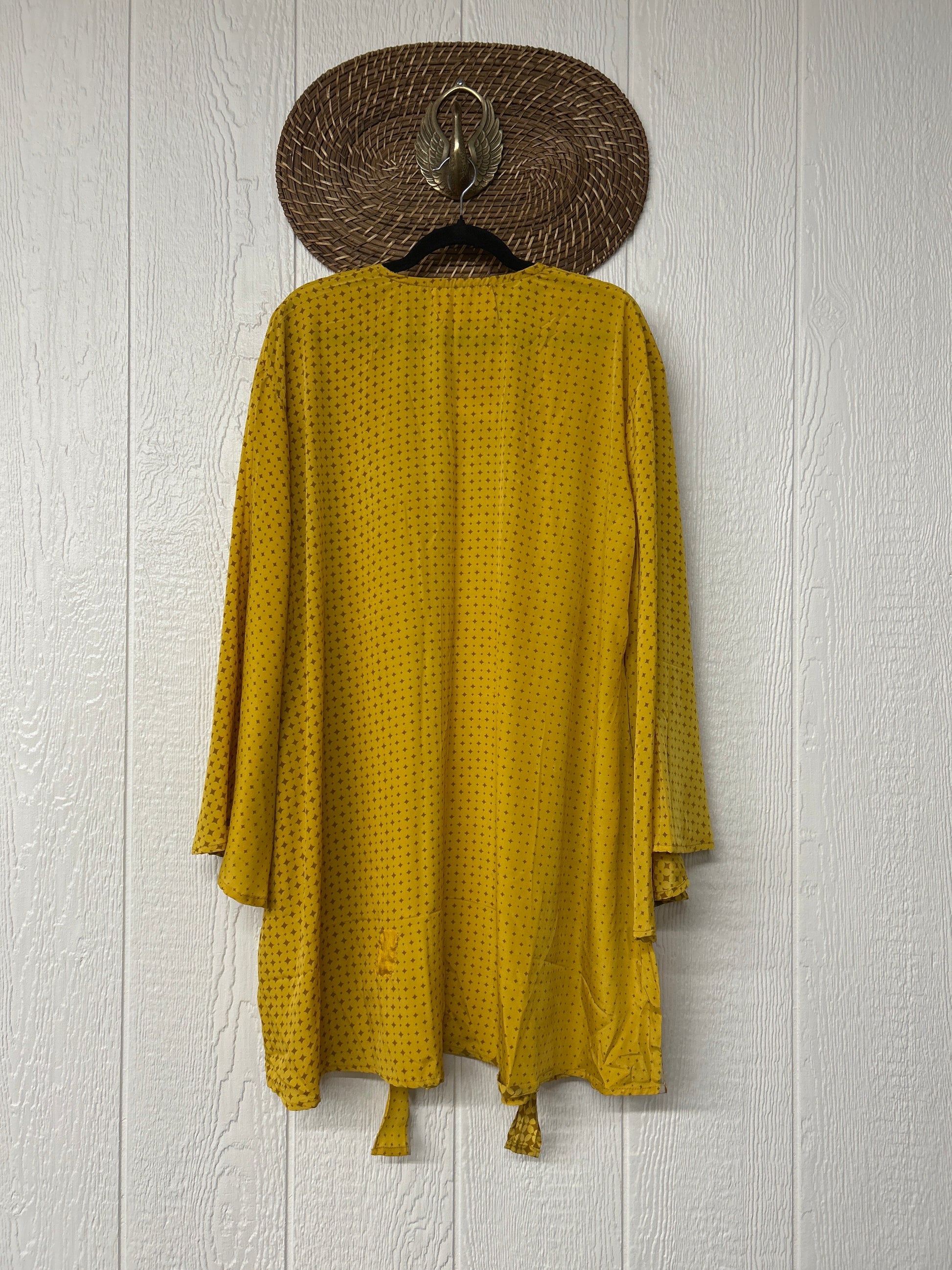 Turn heads in our Spellbound Kimono! Made from our ultra luxe vintage rasgulla sari, this groovy layering piece features exaggerated bell sleeves, a voluminous under layer and tie front shorter outer layer. Wear her open over your favorite band tee or closed with a slip under as a dress. New Shorter length!