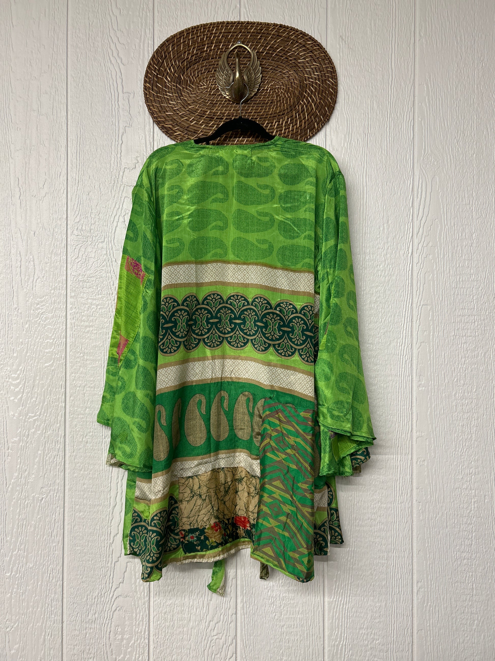 Turn heads in our Spellbound Kimono! Made from our ultra luxe vintage rasgulla sari, this groovy layering piece features exaggerated bell sleeves, a voluminous under layer and tie front shorter outer layer. Wear her open over your favorite band tee or closed with a slip under as a dress. New Shorter length!