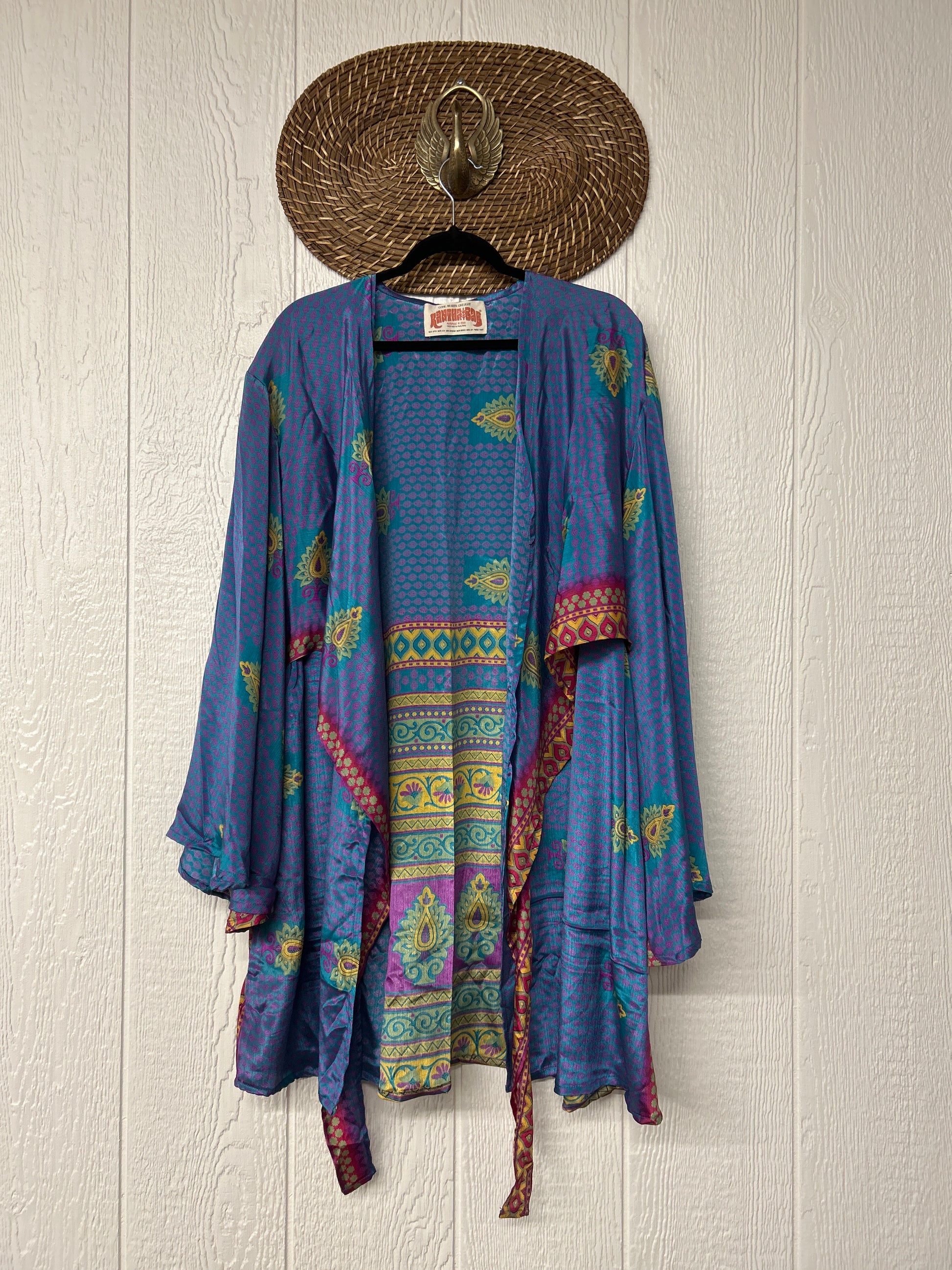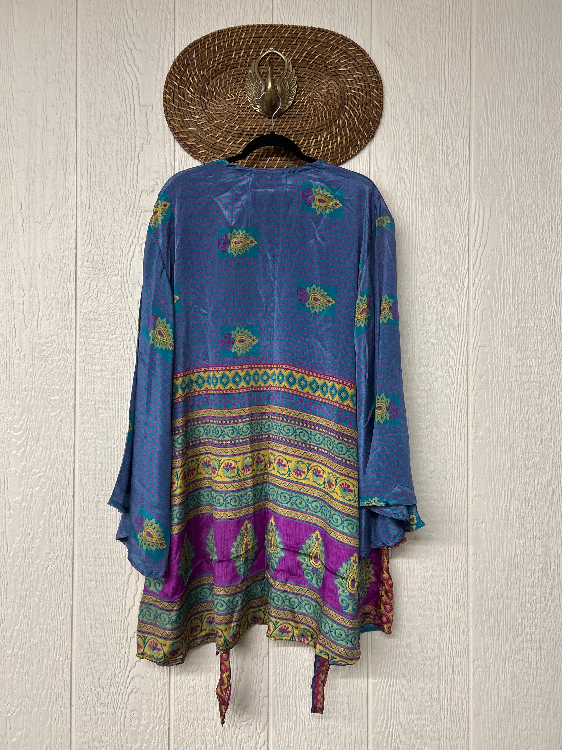 Turn heads in our Spellbound Kimono! Made from our ultra luxe vintage rasgulla sari, this groovy layering piece features exaggerated bell sleeves, a voluminous under layer and tie front shorter outer layer. Wear her open over your favorite band tee or closed with a slip under as a dress. New Shorter length!