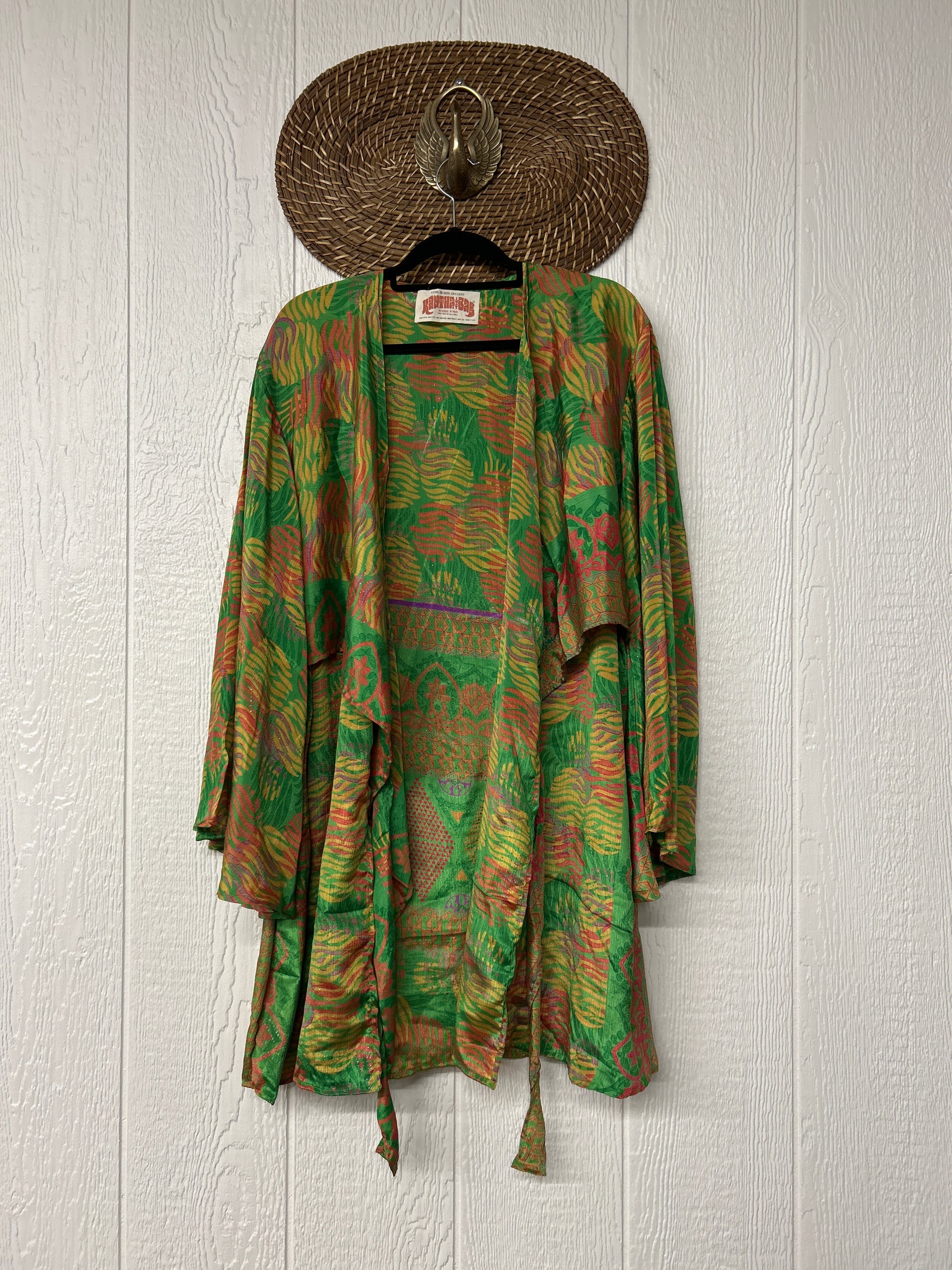 Turn heads in our Spellbound Kimono! Made from our ultra luxe vintage rasgulla sari, this groovy layering piece features exaggerated bell sleeves, a voluminous under layer and tie front shorter outer layer. Wear her open over your favorite band tee or closed with a slip under as a dress. New Shorter length!