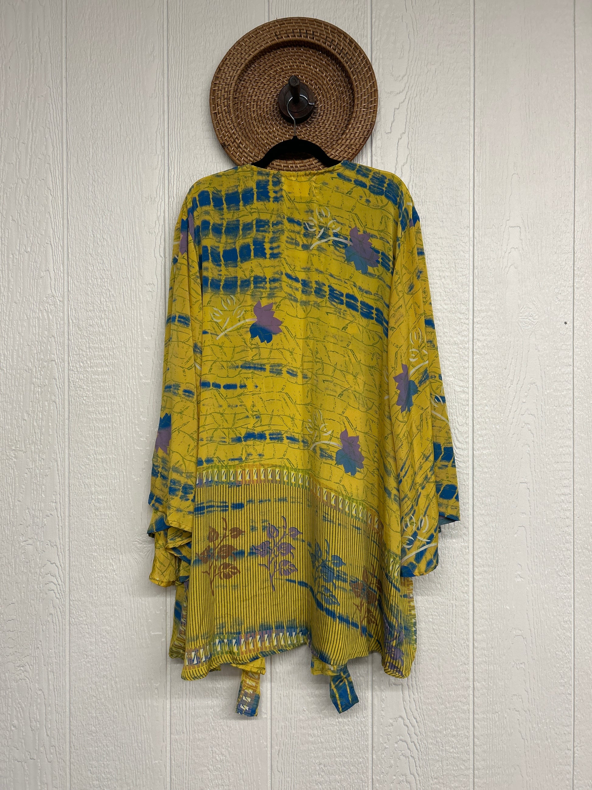 Turn heads in our Spellbound Kimono! Made from our ultra luxe vintage rasgulla sari, this groovy layering piece features exaggerated bell sleeves, a voluminous under layer and tie front shorter outer layer. Wear her open over your favorite band tee or closed with a slip under as a dress. New Shorter length!