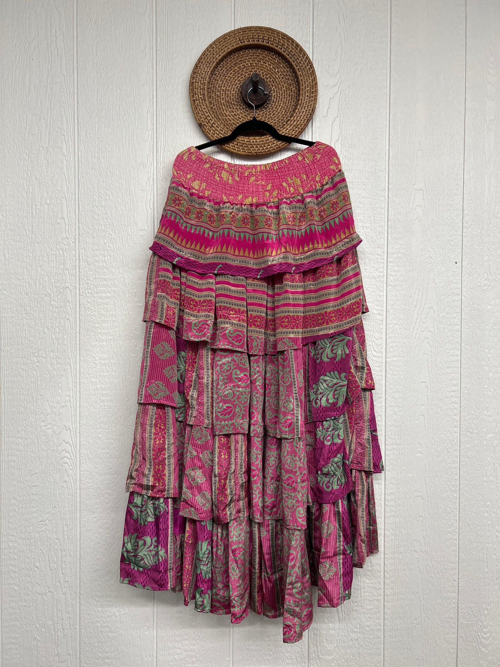 Crafted from vintage rasgulla sari, this ethereal piece features a stretchy ruffle waistband, a tiered floaty ruffle skirt.