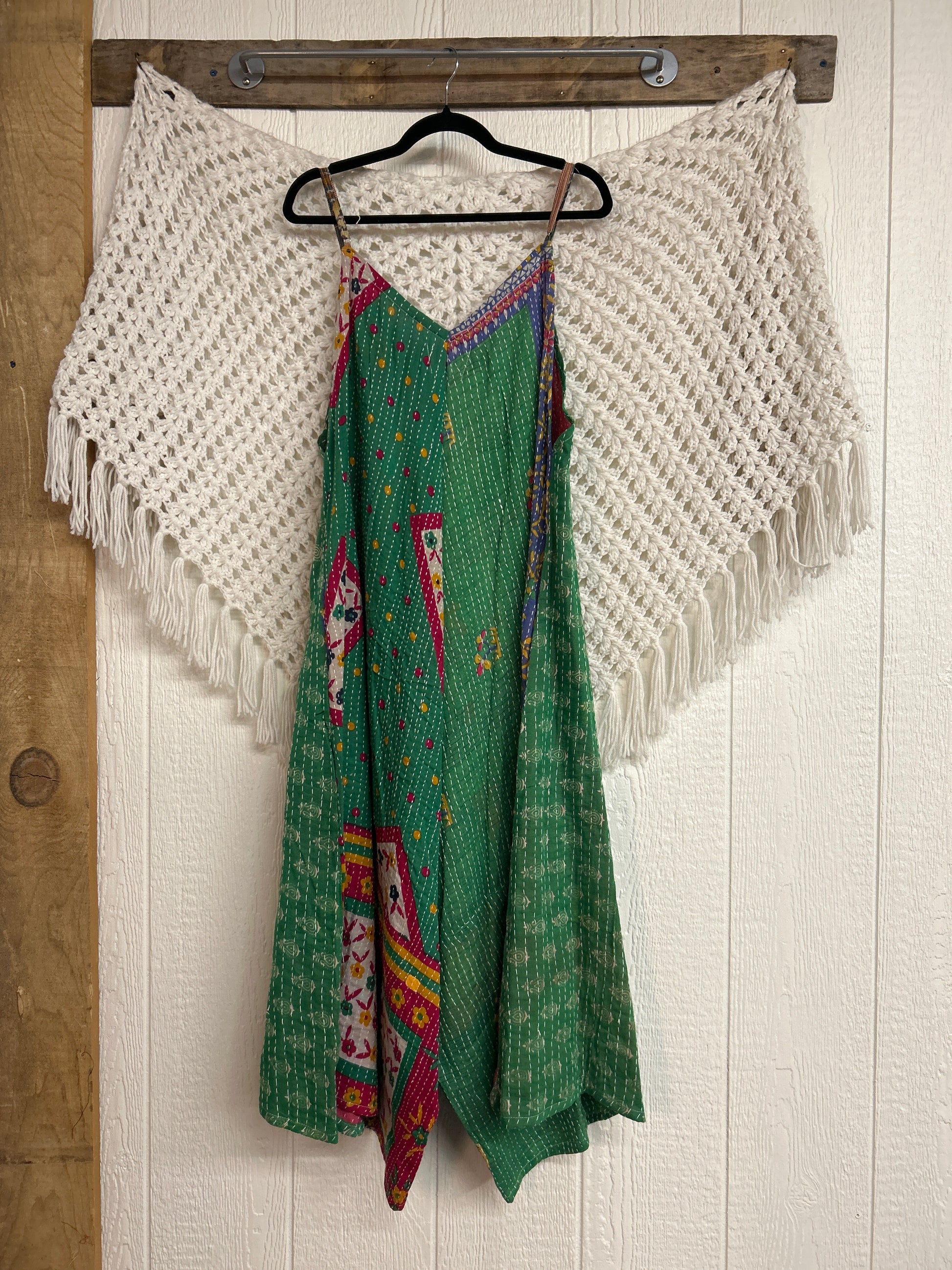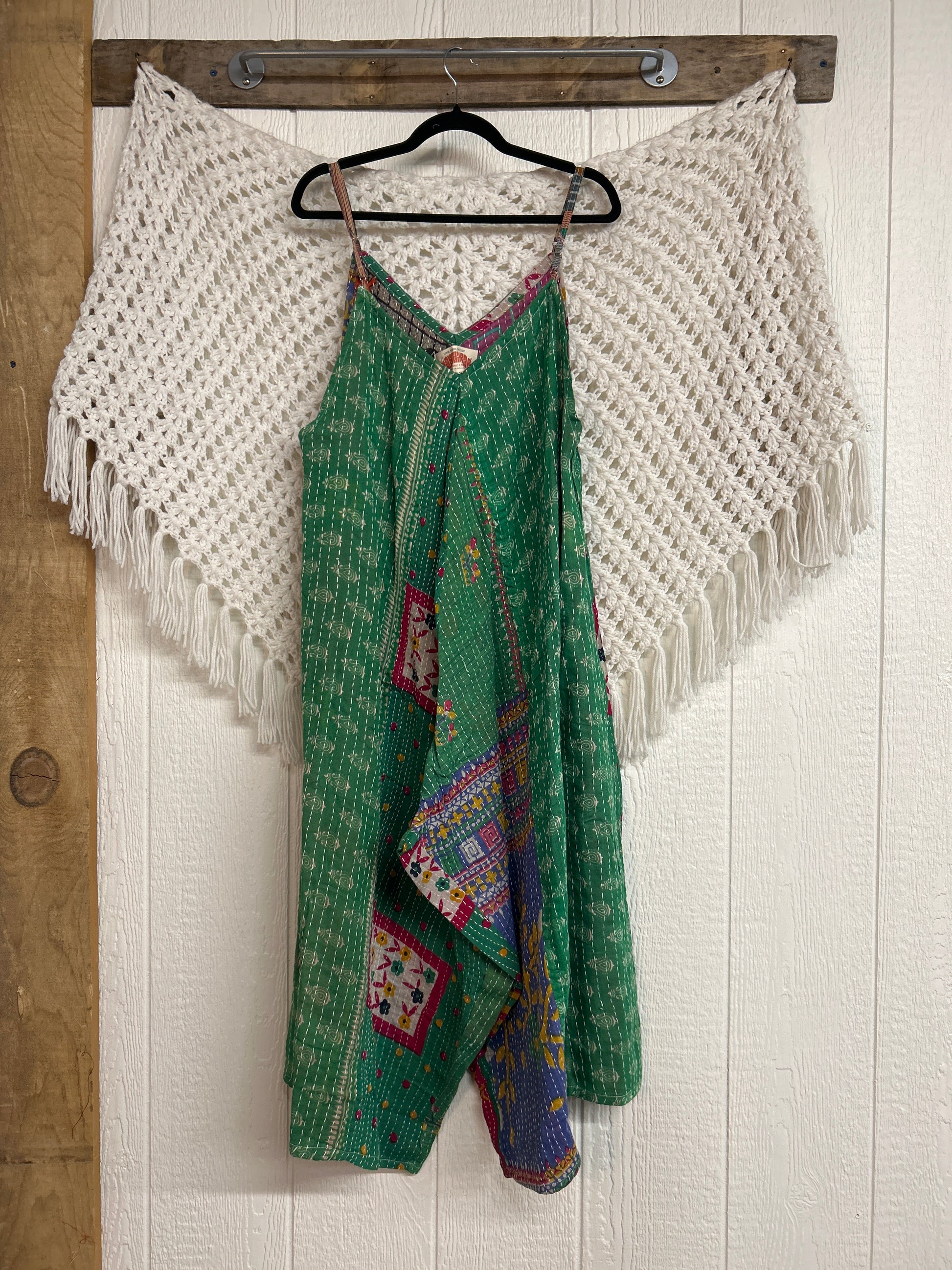 Crafted from vintage cotton kantha stitched sari this fully reversible jumpsuit features interior pockets, adjustable straps, wide legs & a double v neckline.