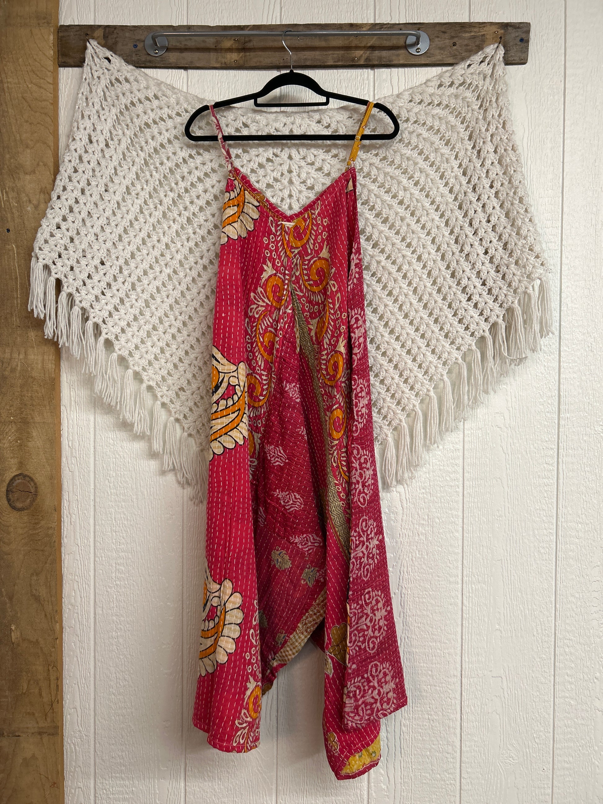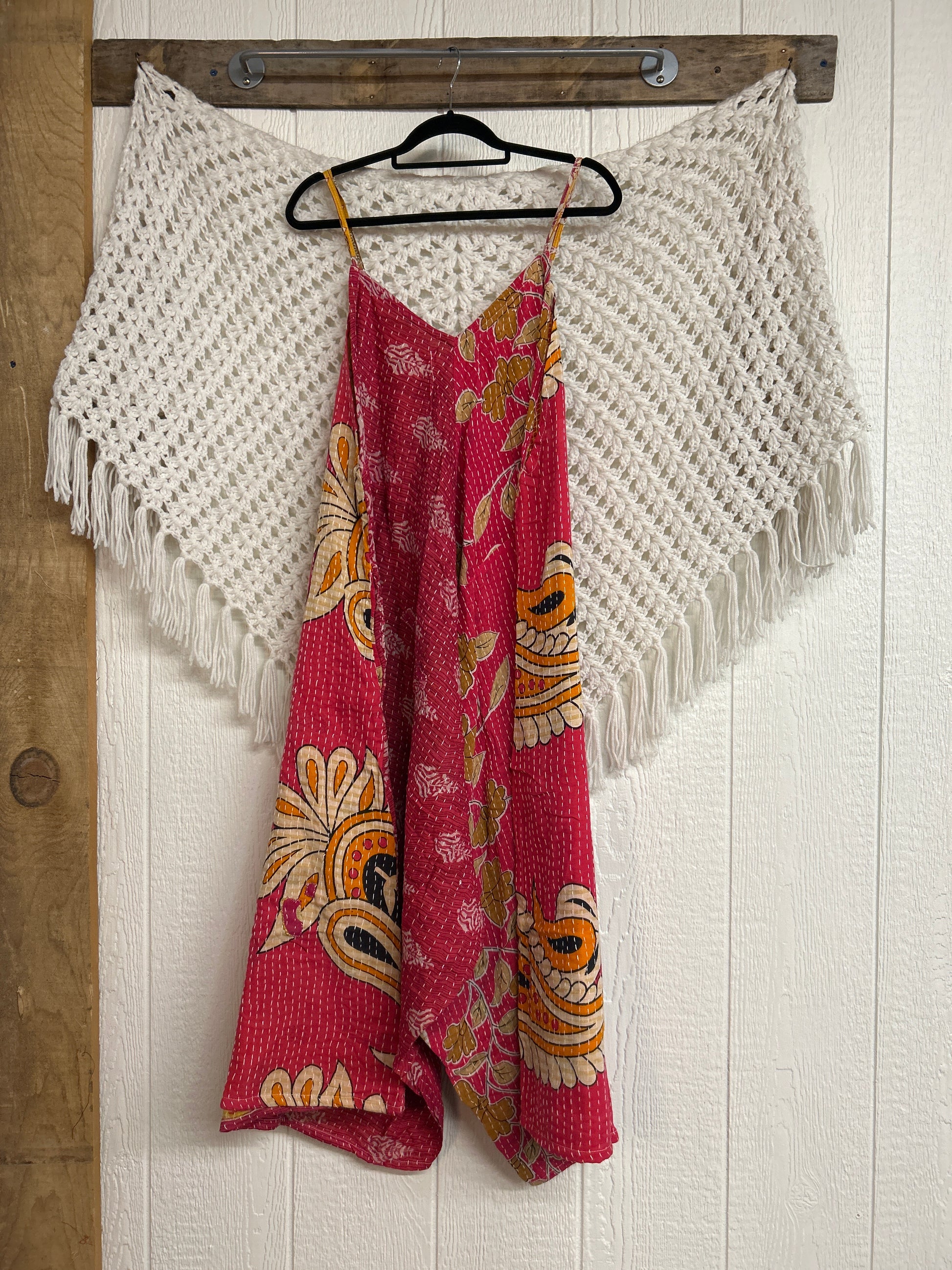 Crafted from vintage cotton kantha stitched sari this fully reversible jumpsuit features interior pockets, adjustable straps, wide legs & a double v neckline.