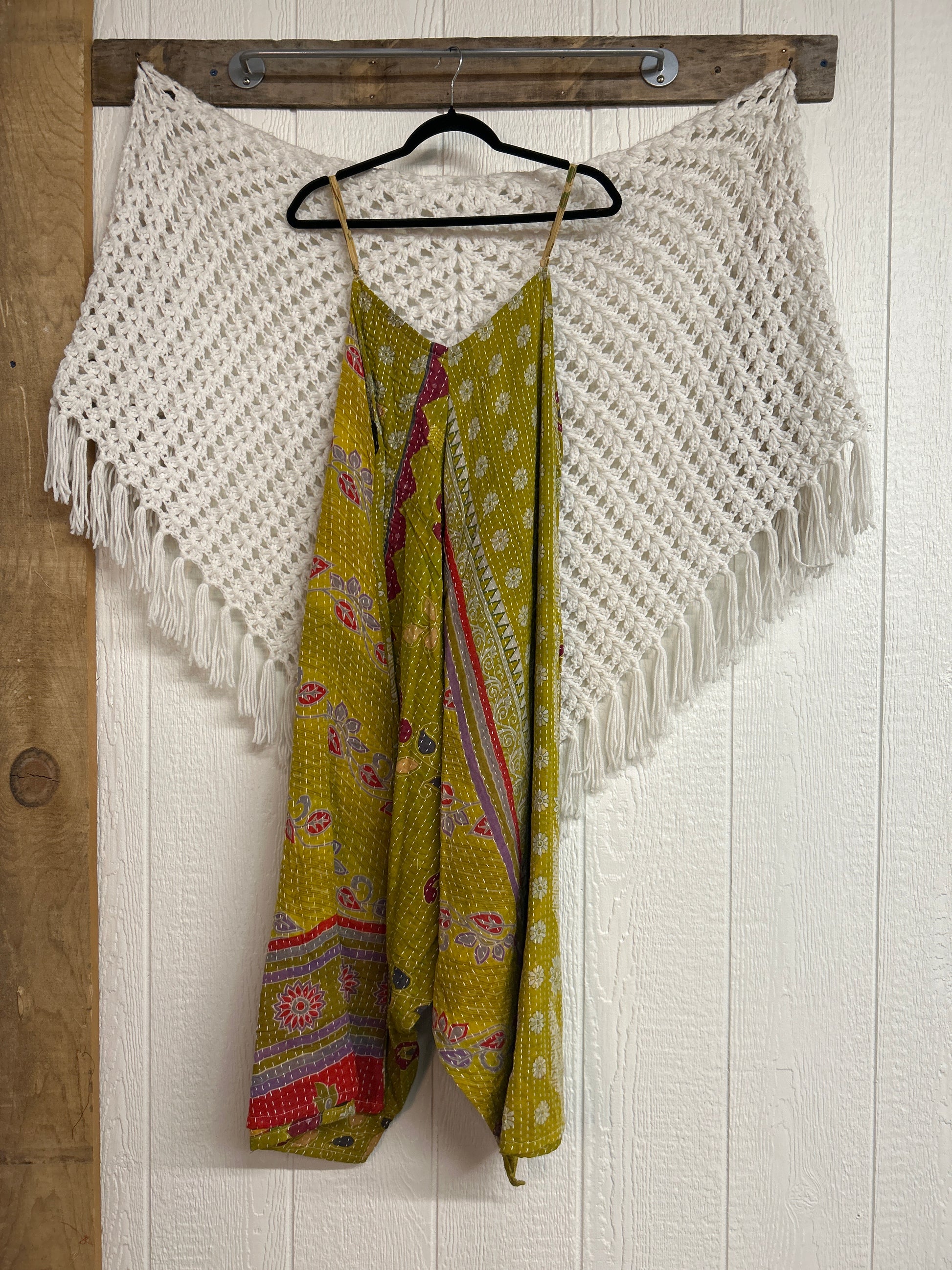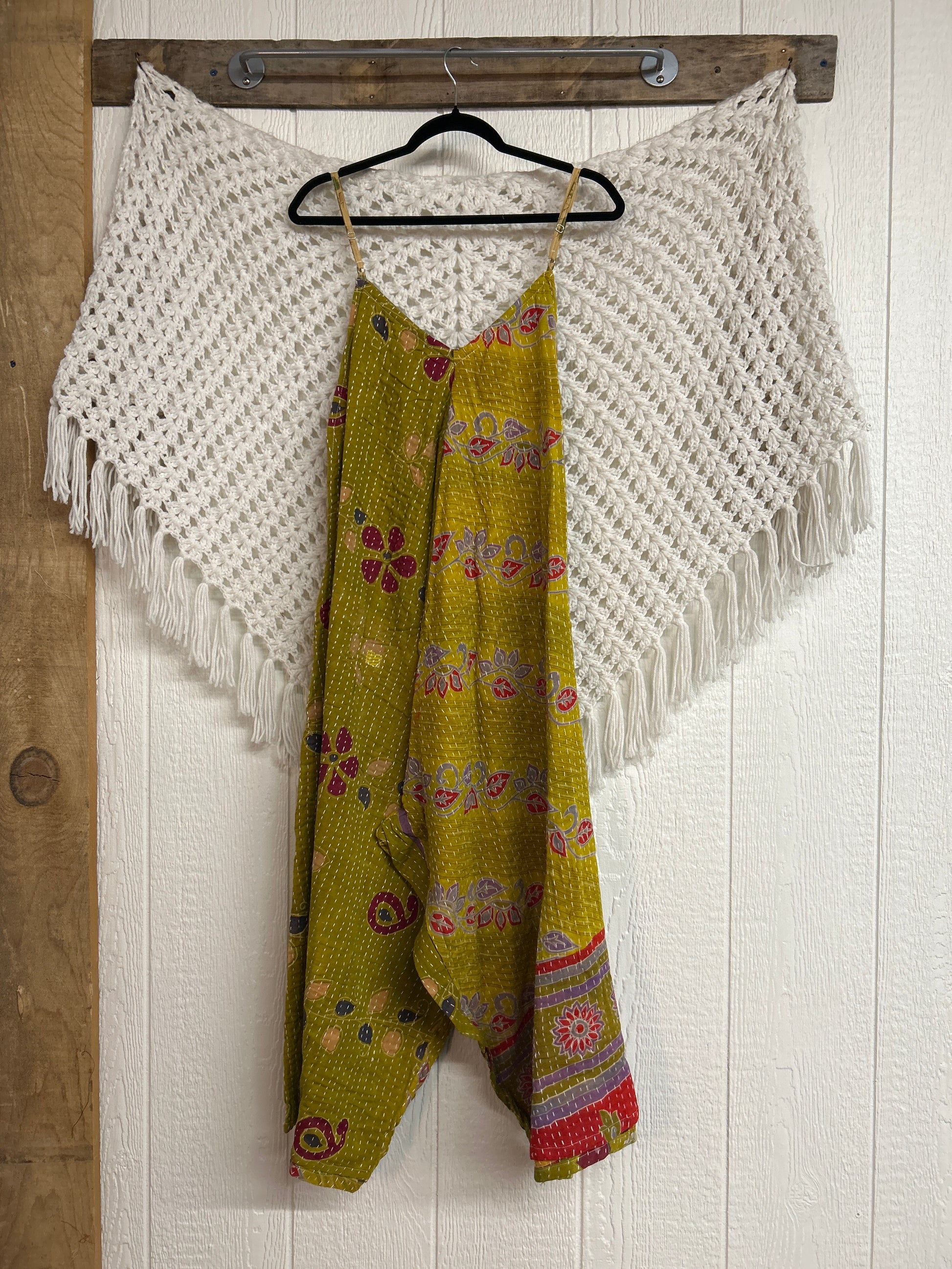 Crafted from vintage cotton kantha stitched sari this fully reversible jumpsuit features interior pockets, adjustable straps, wide legs & a double v neckline.