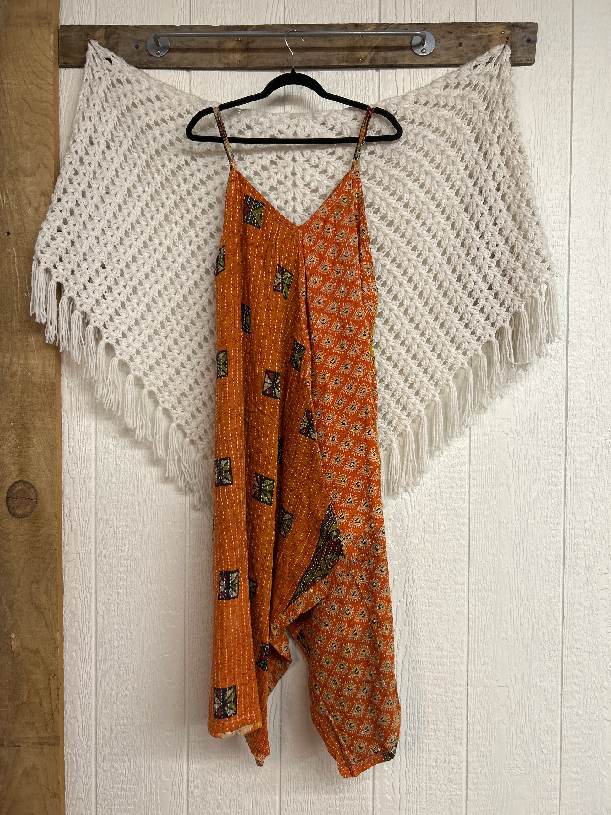 Crafted from vintage cotton kantha stitched sari this fully reversible jumpsuit features interior pockets, adjustable straps, wide legs & a double v neckline.