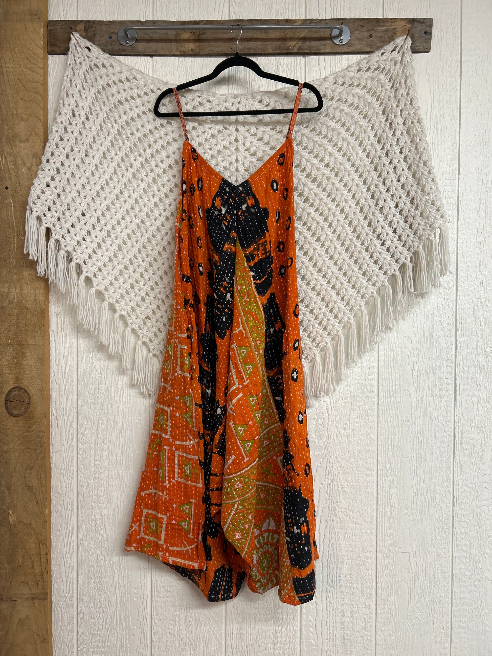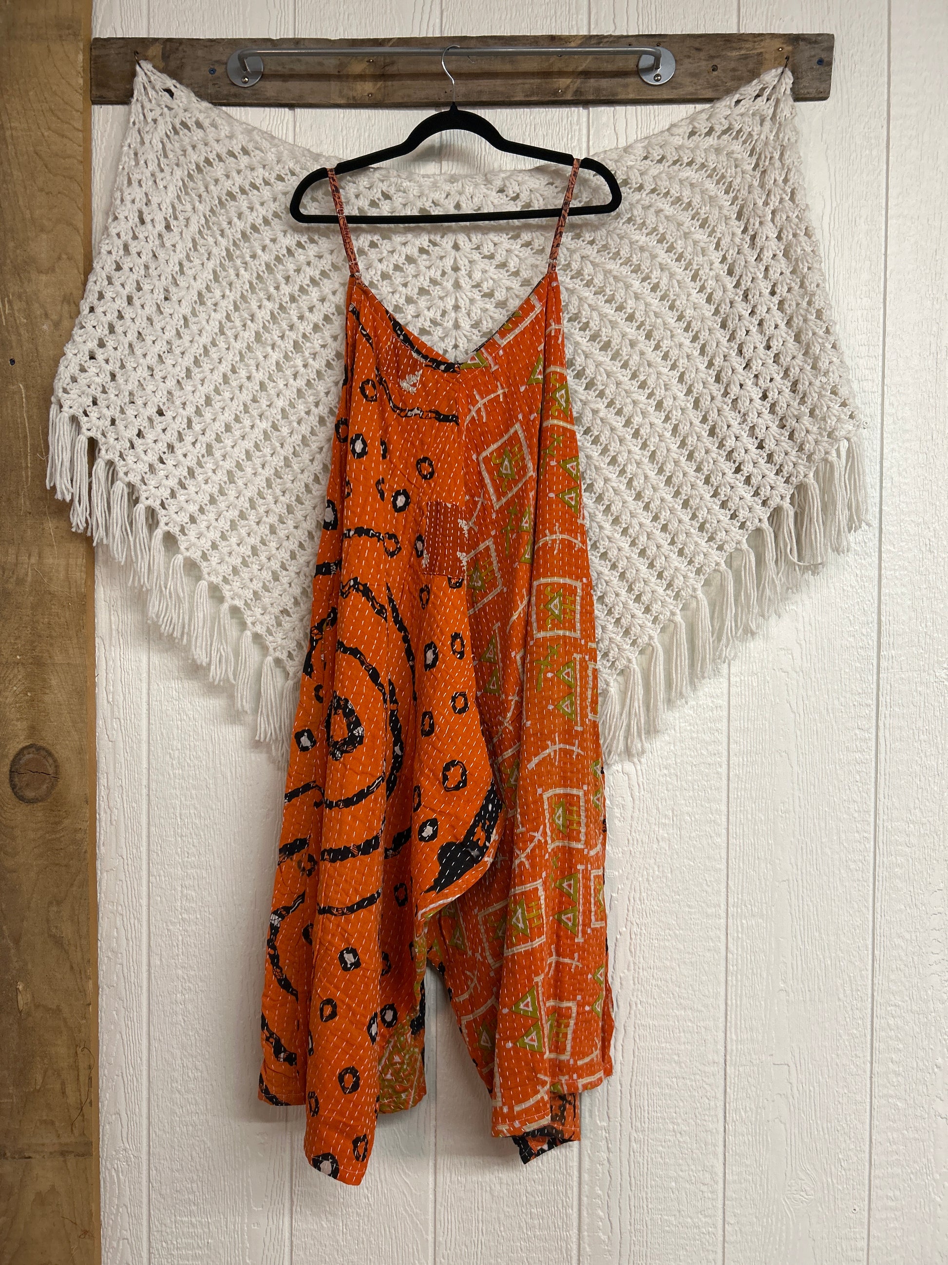 Crafted from vintage cotton kantha stitched sari this fully reversible jumpsuit features interior pockets, adjustable straps, wide legs & a double v neckline.