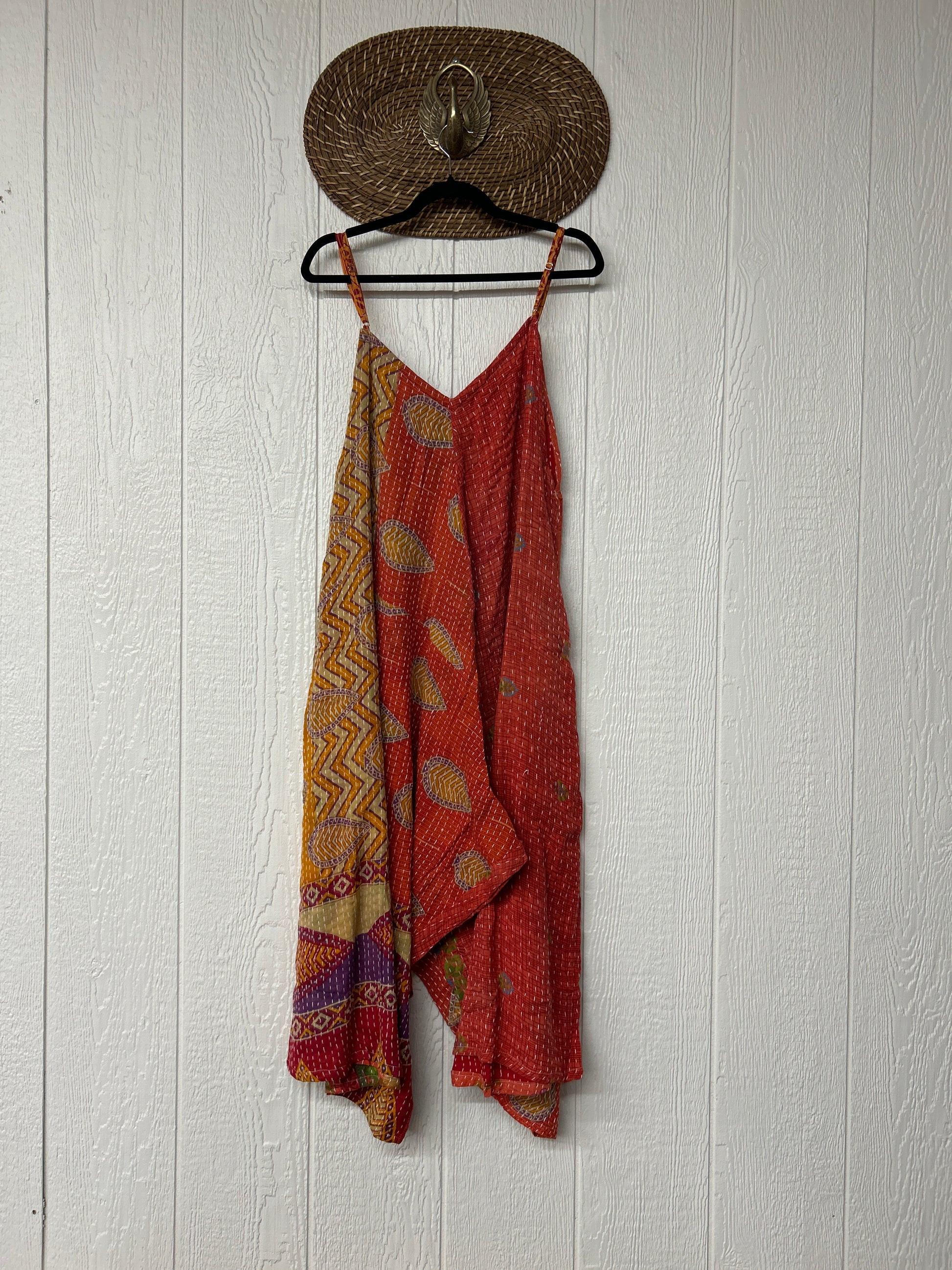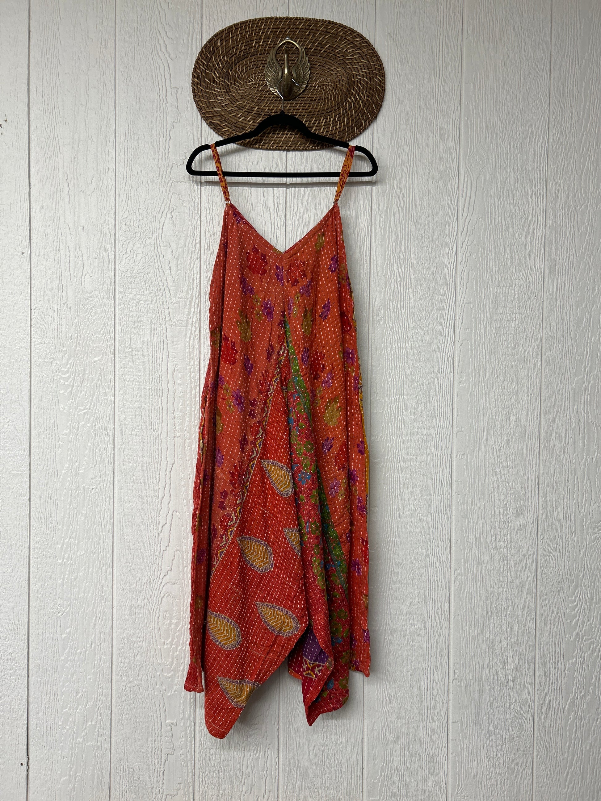 Crafted from vintage cotton kantha stitched sari this fully reversible jumpsuit features interior pockets, adjustable straps, wide legs & a double v neckline.