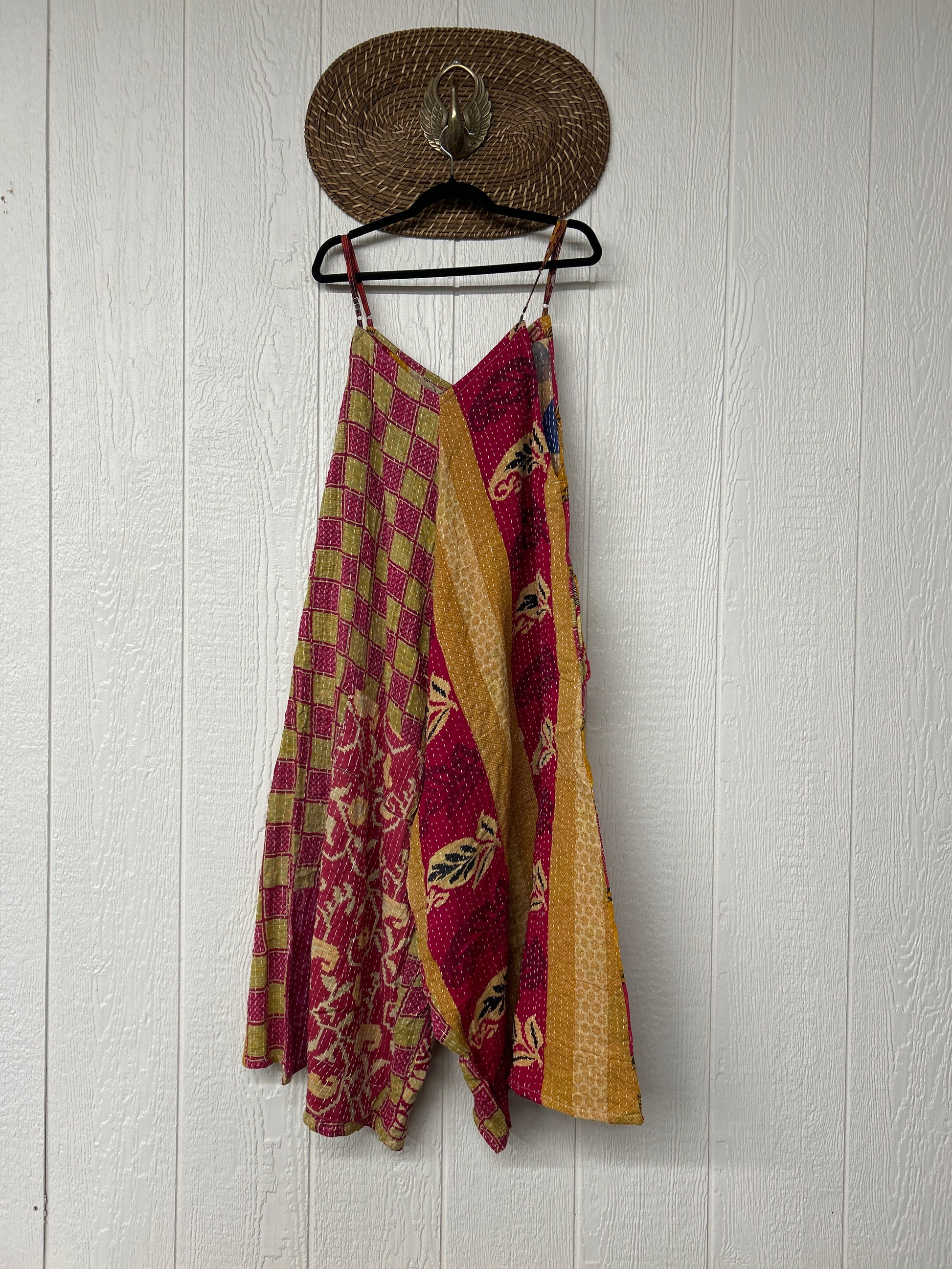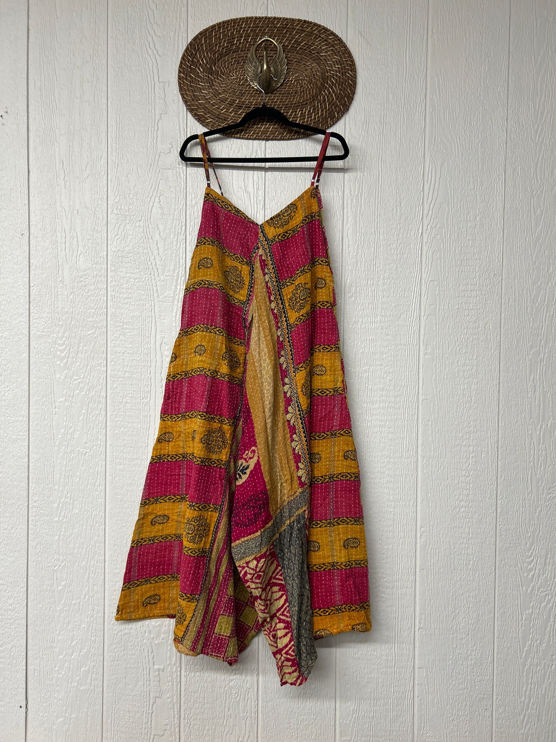 Crafted from vintage cotton kantha stitched sari this fully reversible jumpsuit features interior pockets, adjustable straps, wide legs & a double v neckline.