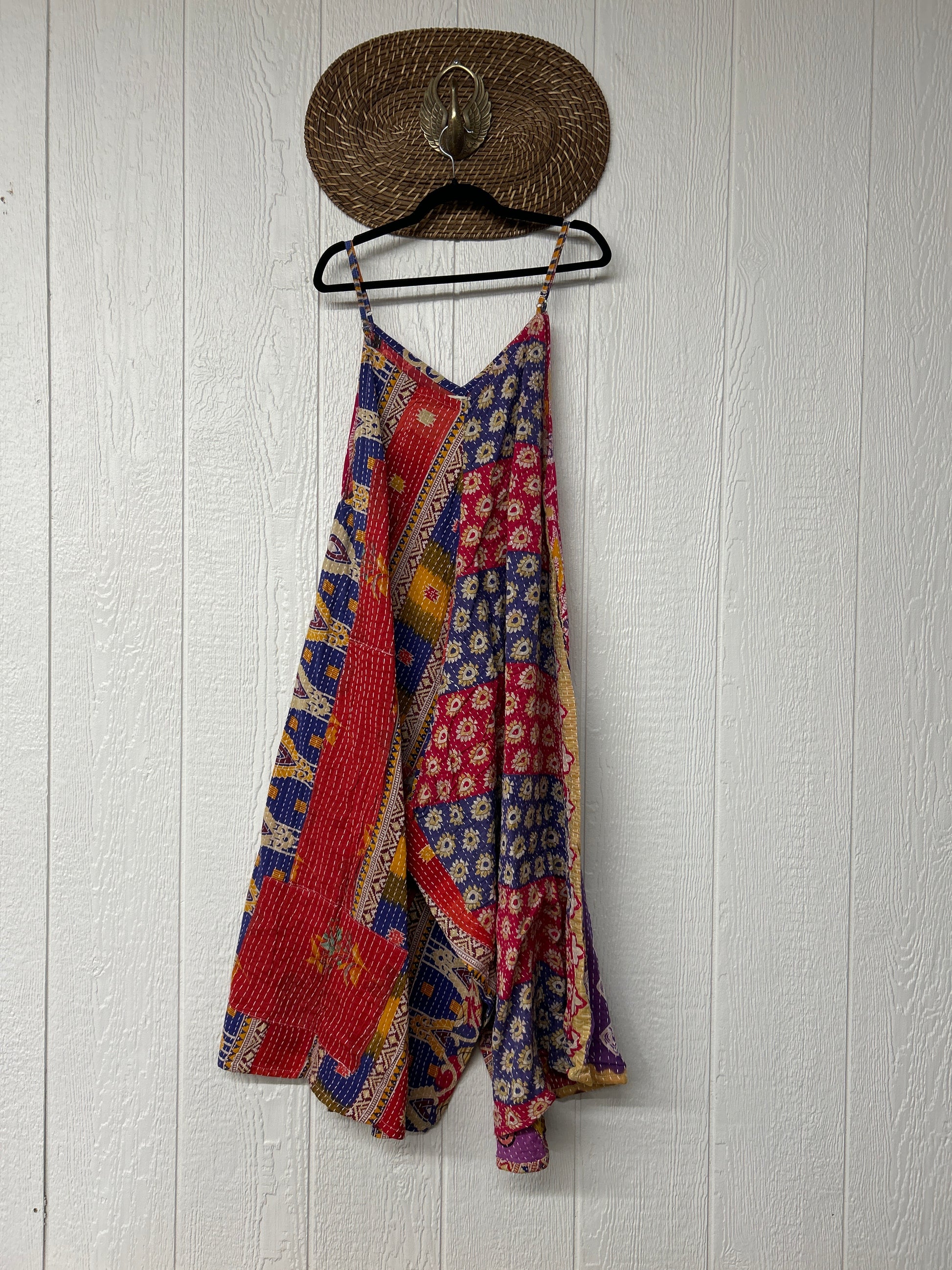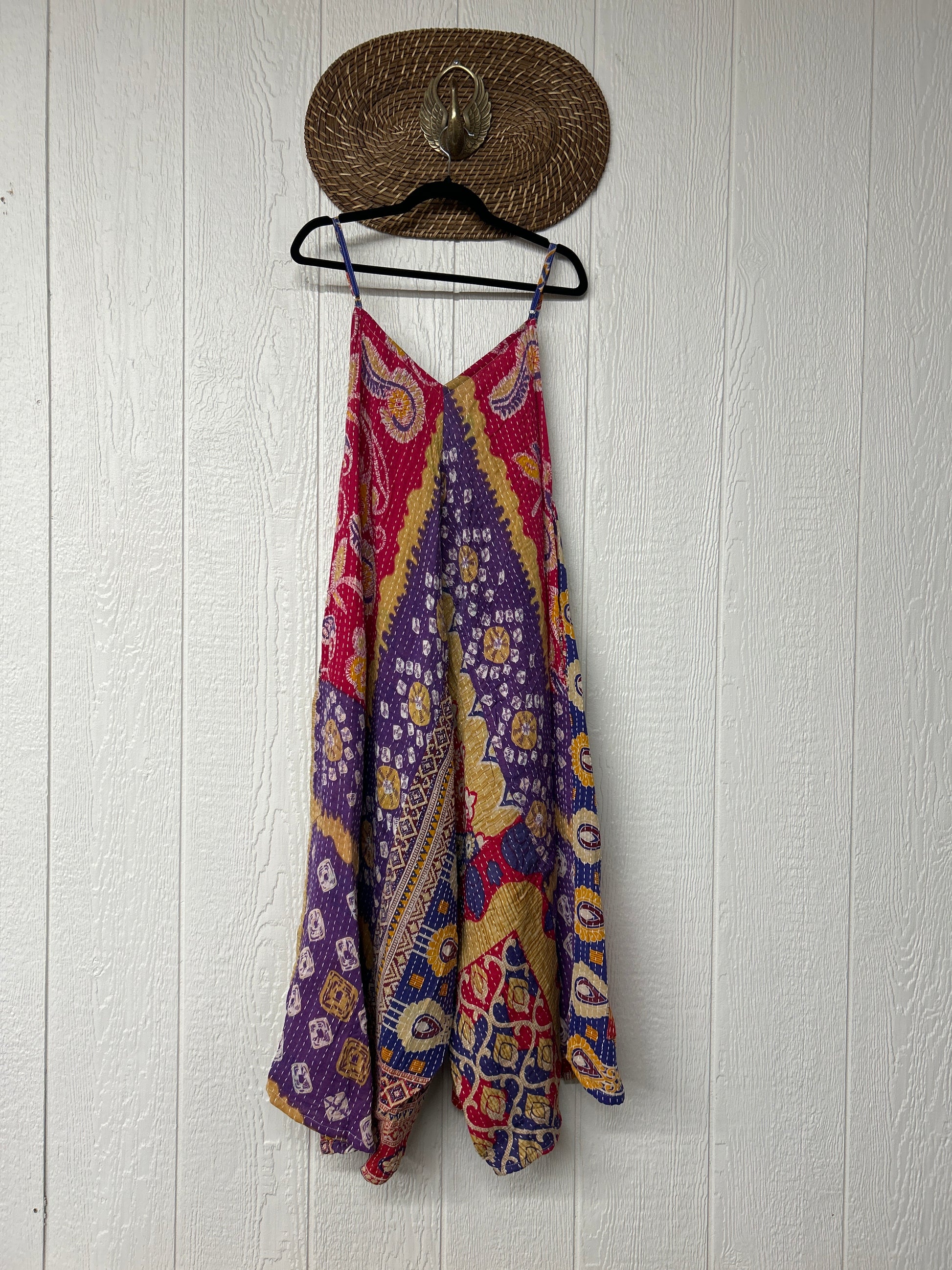 Crafted from vintage cotton kantha stitched sari this fully reversible jumpsuit features interior pockets, adjustable straps, wide legs & a double v neckline.