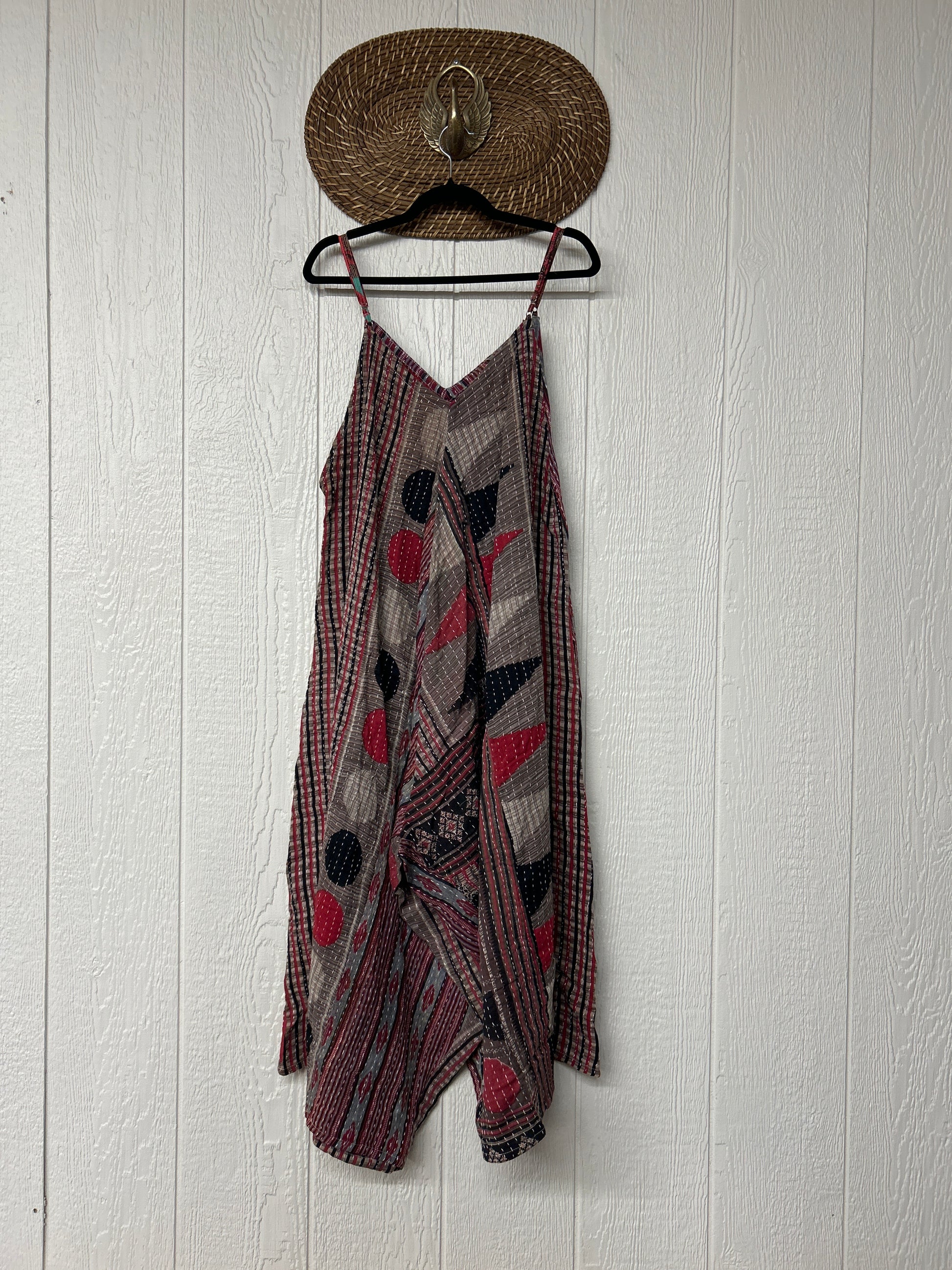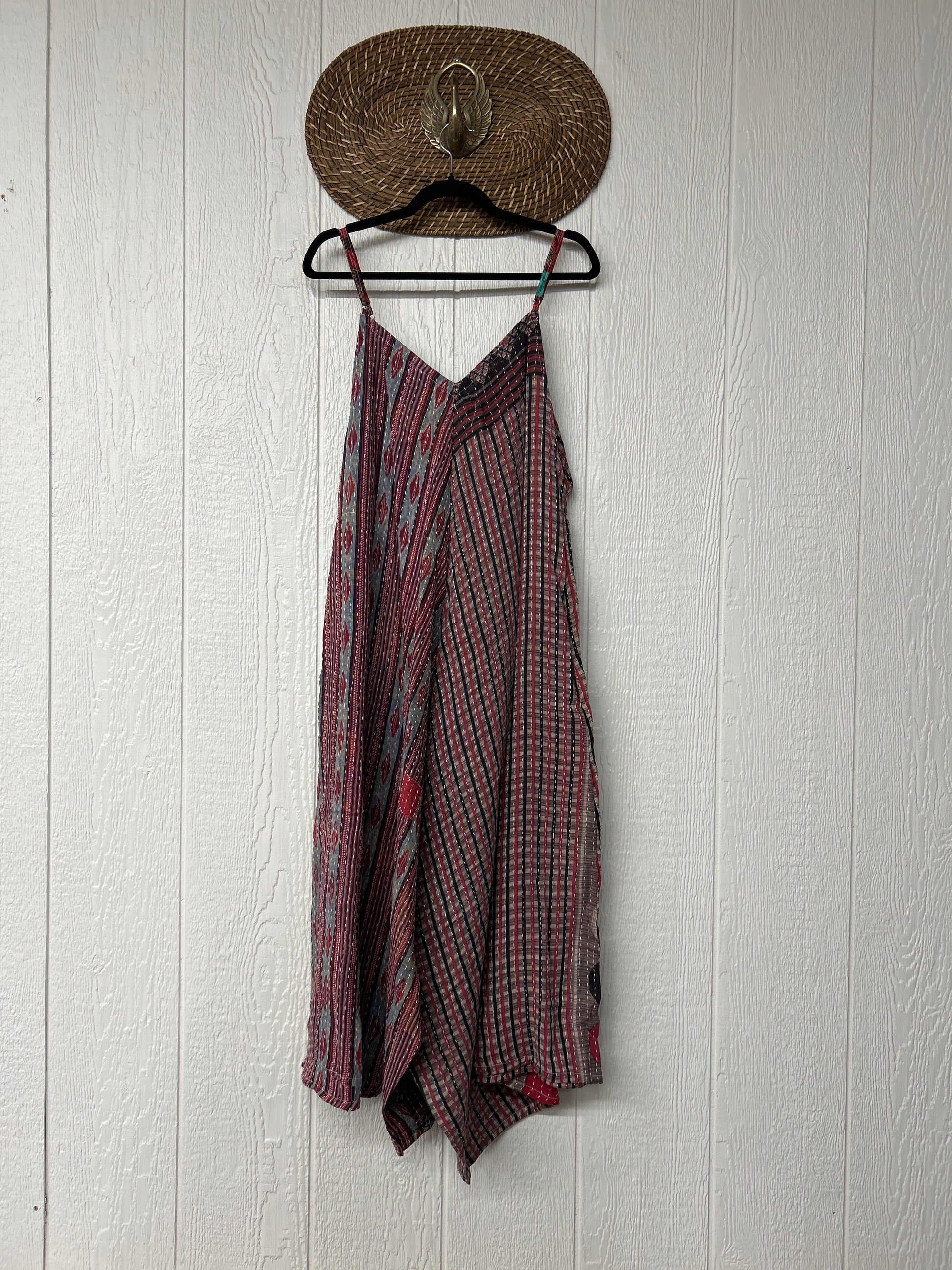 Crafted from vintage cotton kantha stitched sari this fully reversible jumpsuit features interior pockets, adjustable straps, wide legs & a double v neckline.