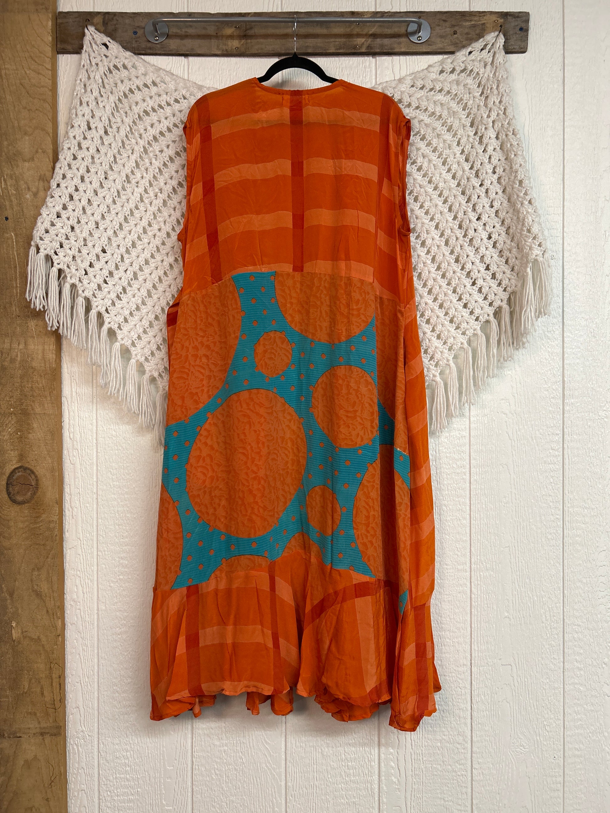 The Rhapsody Kimono Vest is crafted from our ultra lux vintage crepe silk sari. Features ruffle details throughout, interior pockets and a built in sash tie closure to wear open or closed. We're obsessed!