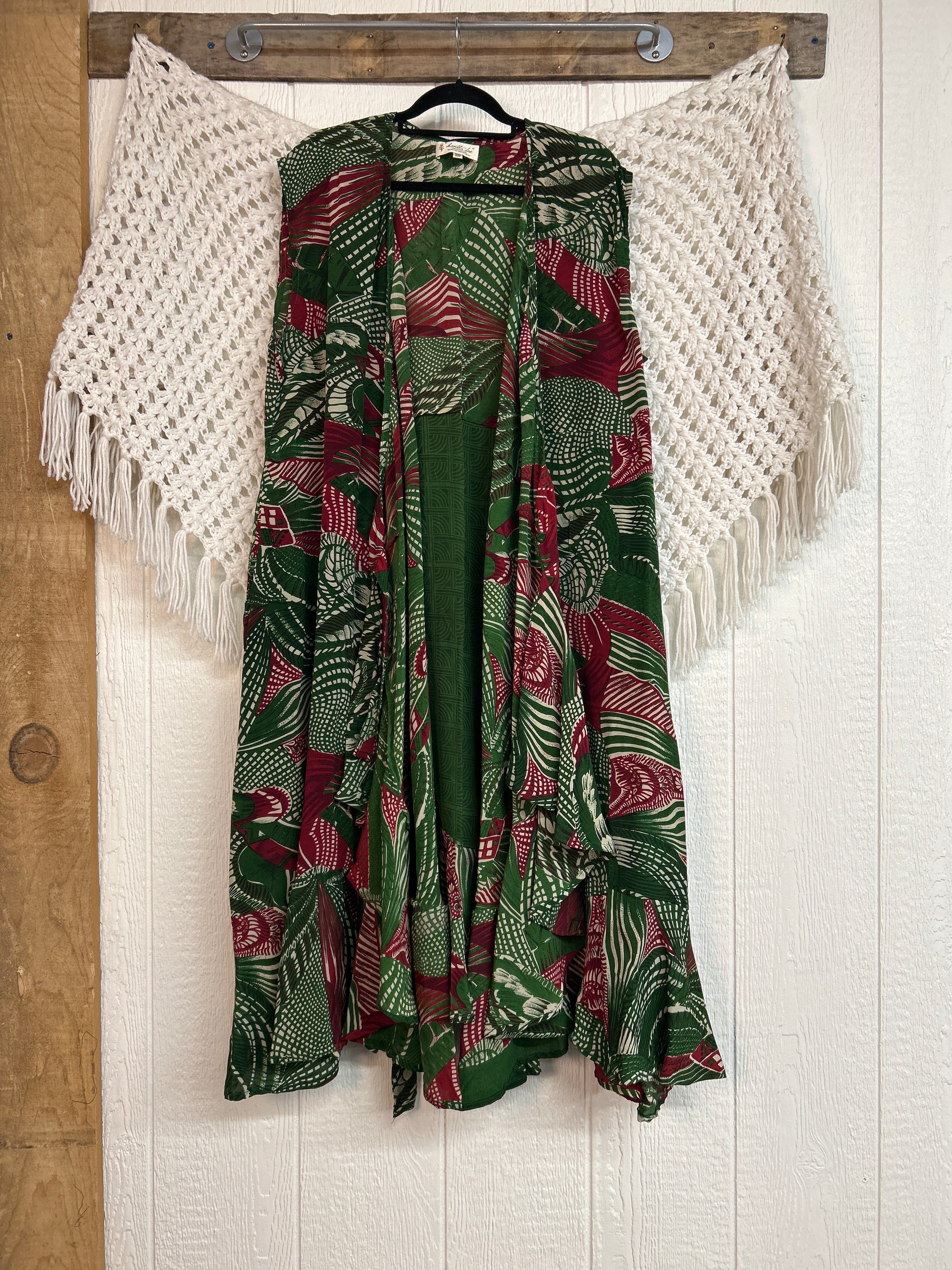 The Rhapsody Kimono Vest is crafted from our ultra lux vintage crepe silk sari. Features ruffle details throughout, interior pockets and a built in sash tie closure to wear open or closed. We're obsessed!