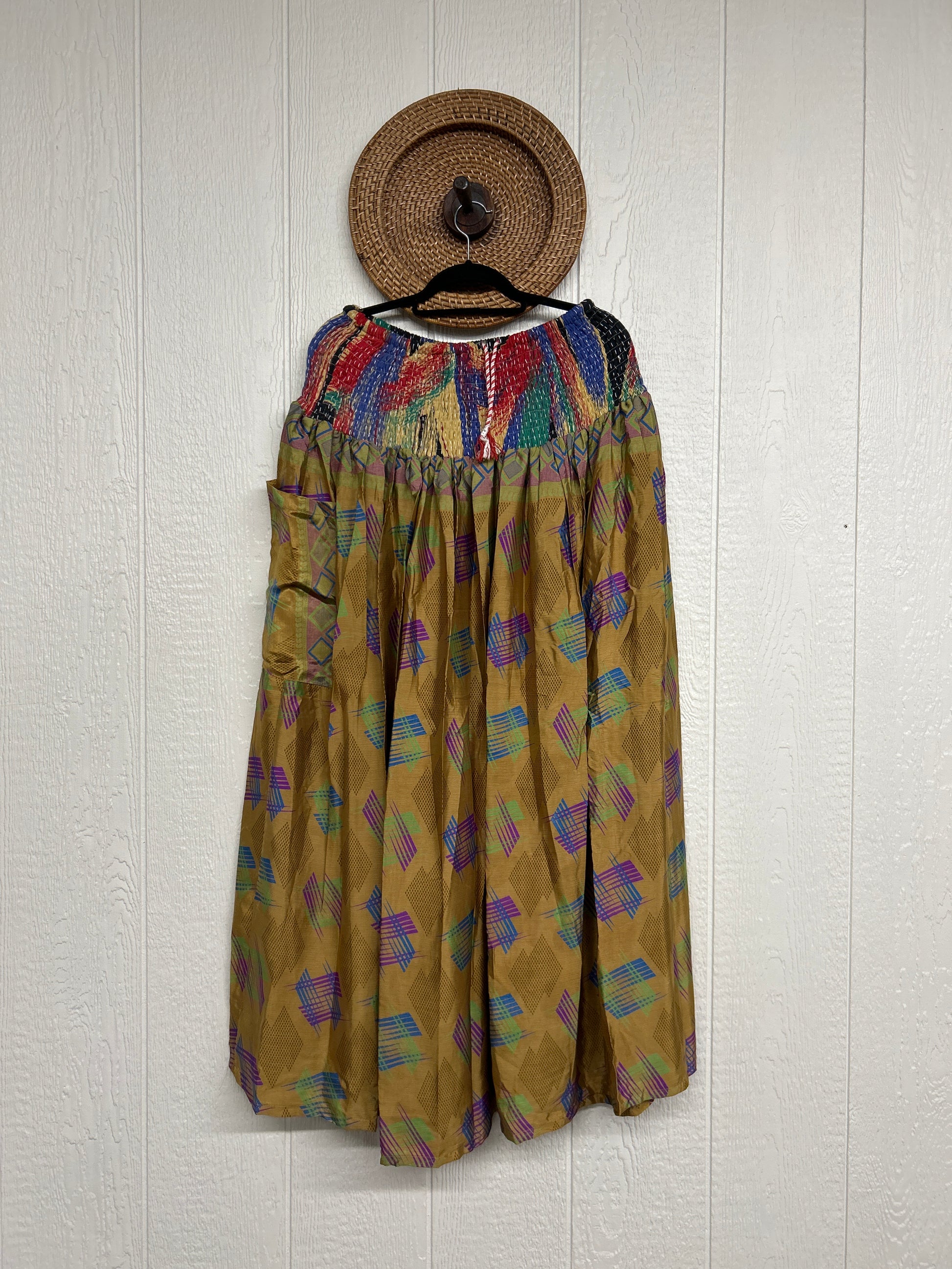 Made from our vintage rasgulla sari, this versatile piece features a smocked band at the waist to wear as a maxi dress or midi skirt. Our convertible maxi dress has two deep exterior pockets and a drawstring waist in a stretchy Kantha waistband in the middle for extra versatility. One Size, recommended up to a size 26. Crafted and sewn by families in a small village in Northern India, providing work and a fair living.