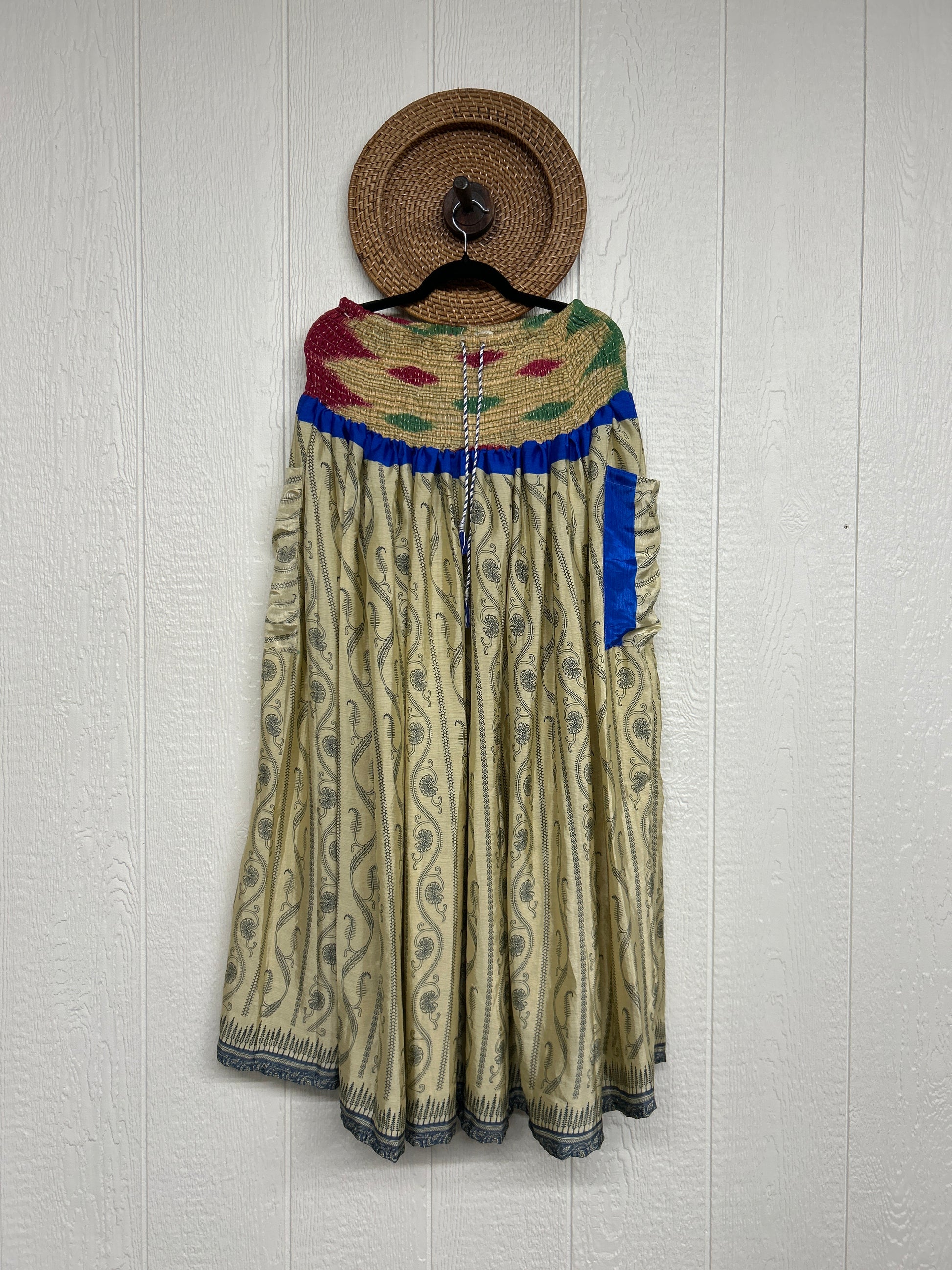 Made from our vintage rasgulla sari, this versatile piece features a smocked band at the waist to wear as a maxi dress or midi skirt. Our convertible maxi dress has two deep exterior pockets and a drawstring waist in a stretchy Kantha waistband in the middle for extra versatility. One Size, recommended up to a size 26. Crafted and sewn by families in a small village in Northern India, providing work and a fair living.