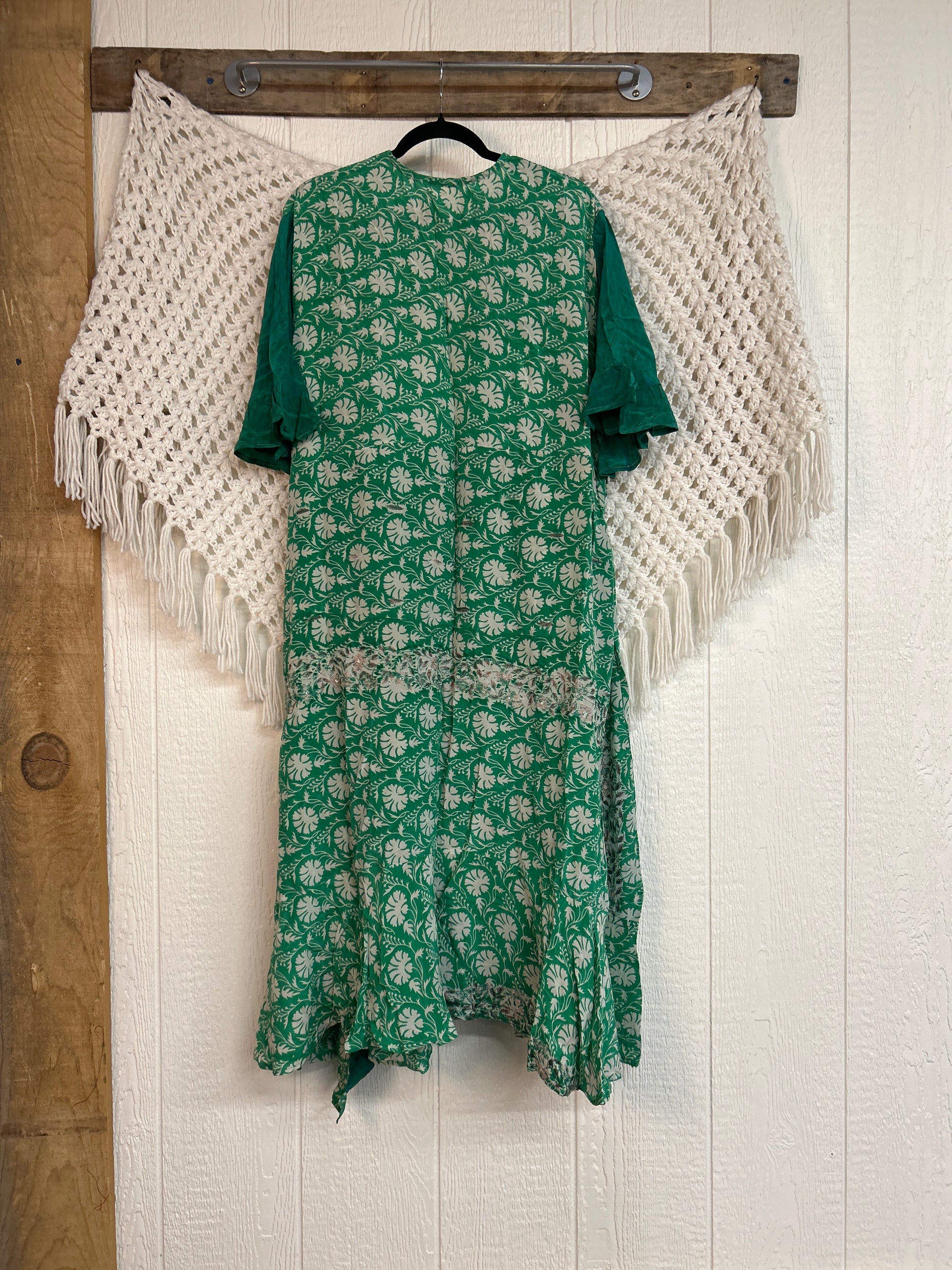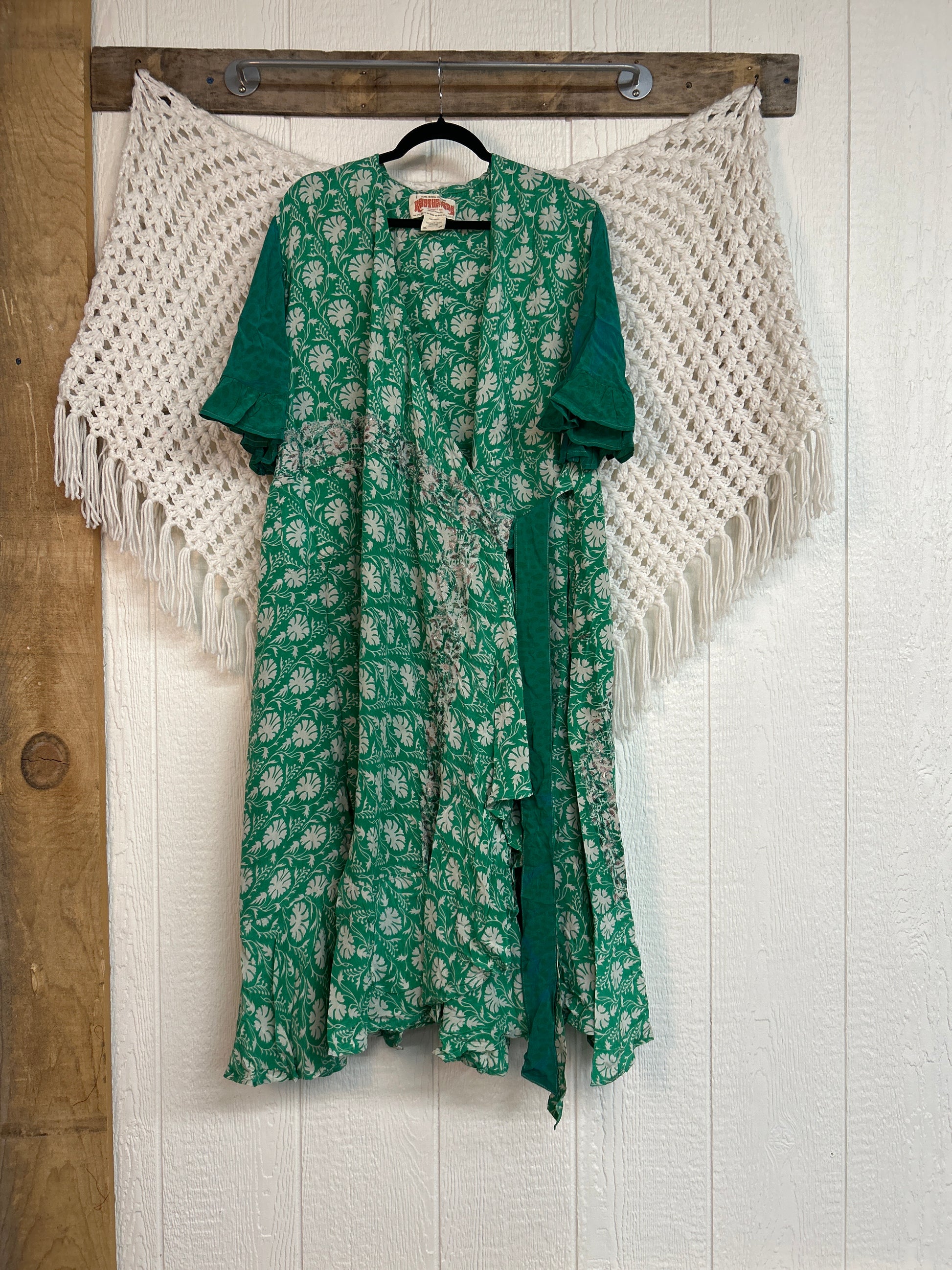 The Summer Flourish Wrap Dress is crafted from our ultra lux vintage crepe sari. Features short bell sleeves, ruffle details throughout and a built in sash belt which wraps around the body to make this beauty fully customizable for a wide range of sizes. You can also wear the Flourish open as a vibey kimono over your favorite outfit. We're obsessed!