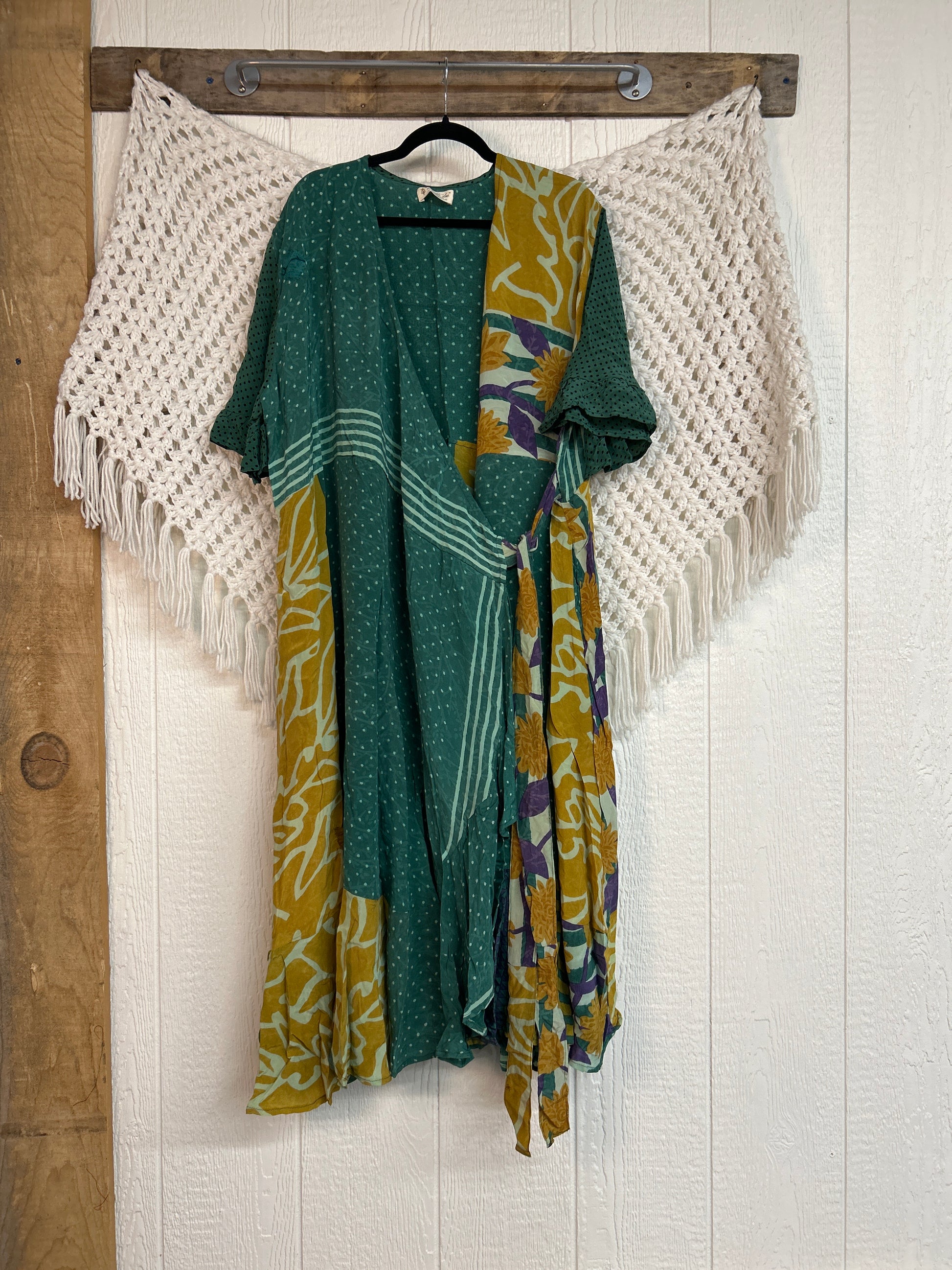 The Summer Flourish Wrap Dress is crafted from our ultra lux vintage crepe sari. Features short bell sleeves, ruffle details throughout and a built in sash belt which wraps around the body to make this beauty fully customizable for a wide range of sizes. You can also wear the Flourish open as a vibey kimono over your favorite outfit. We're obsessed!