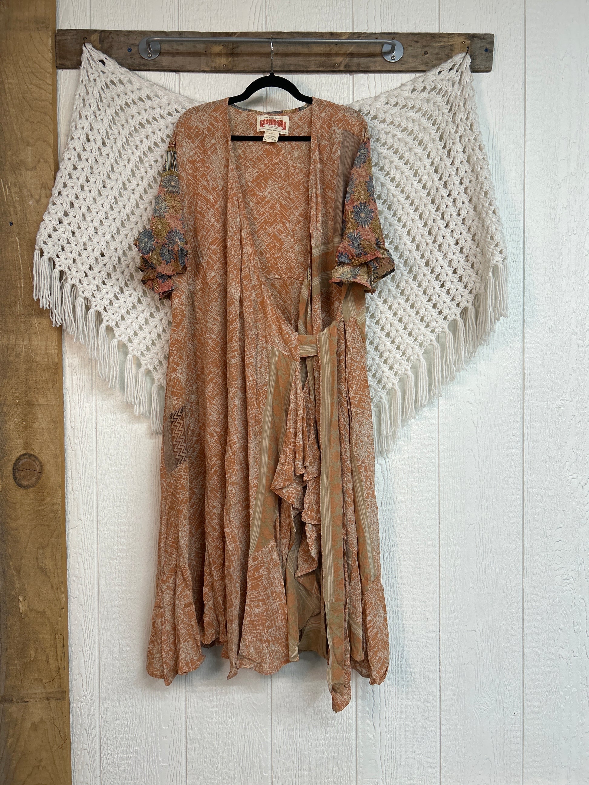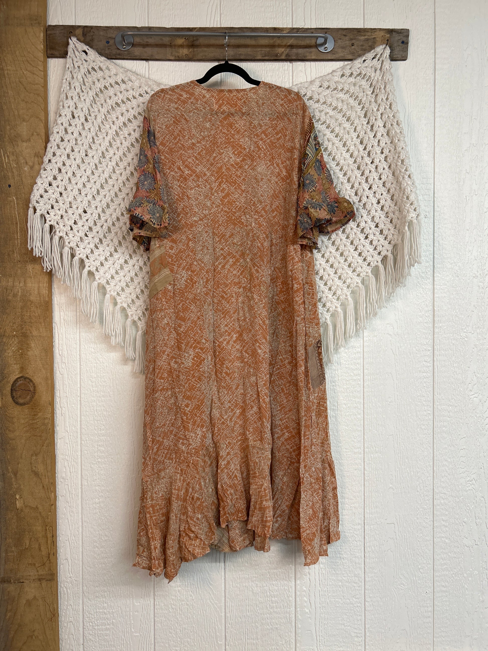The Summer Flourish Wrap Dress is crafted from our ultra lux vintage crepe sari. Features short bell sleeves, ruffle details throughout and a built in sash belt which wraps around the body to make this beauty fully customizable for a wide range of sizes. You can also wear the Flourish open as a vibey kimono over your favorite outfit. We're obsessed!