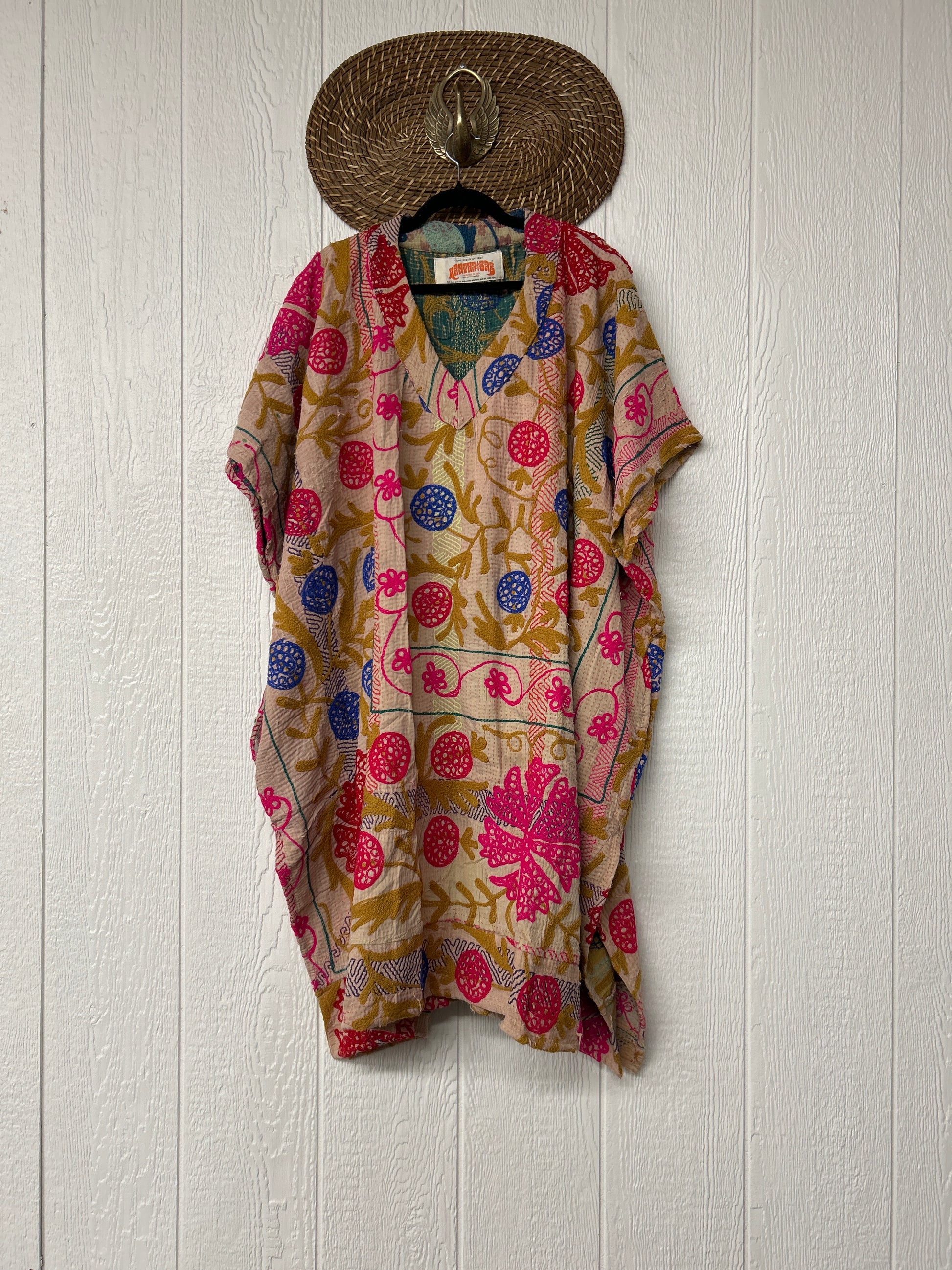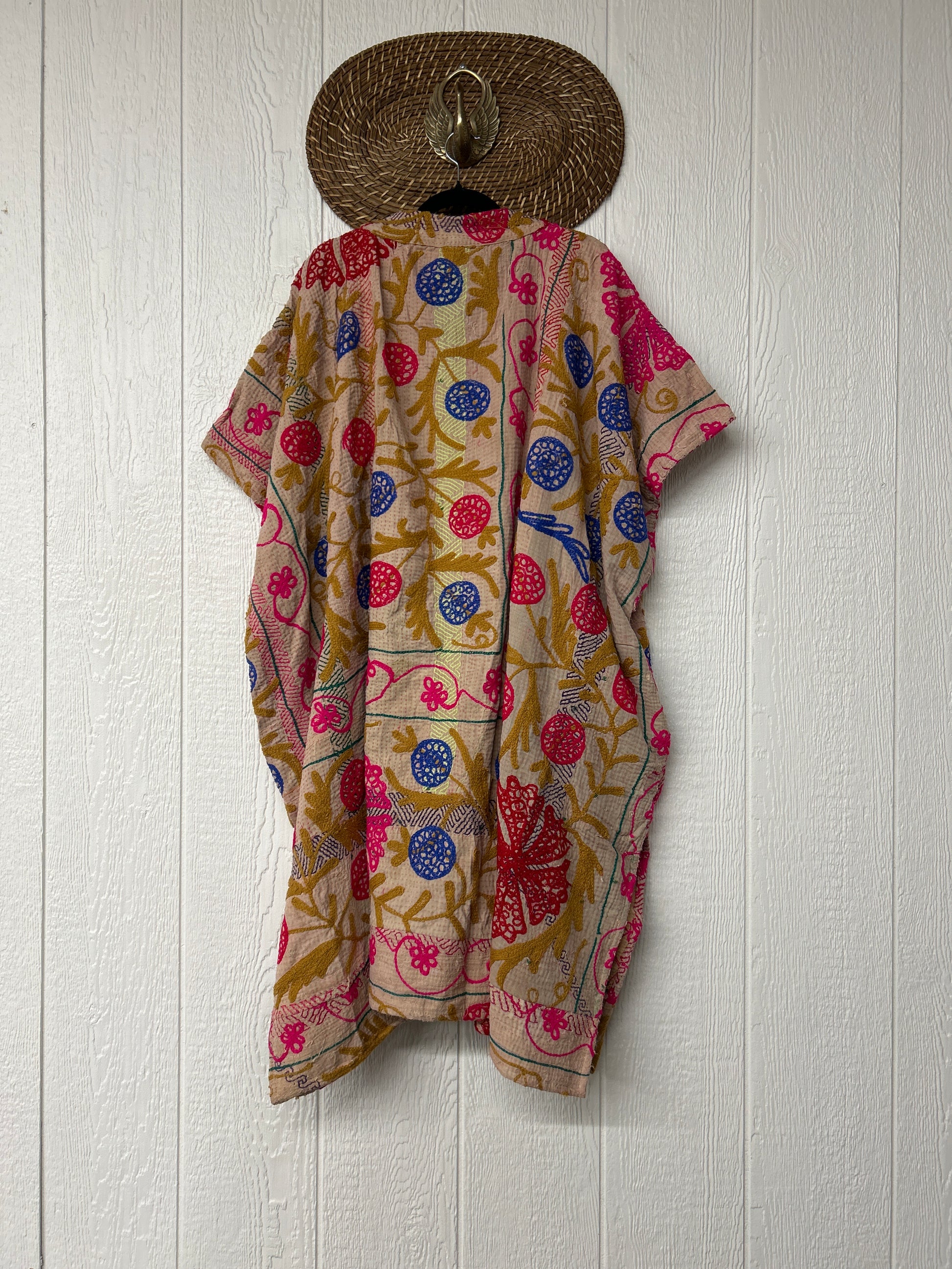 Crafted from hand embroidered fine kantha features a v neckline and interior pockets and side slits for extra dimension.