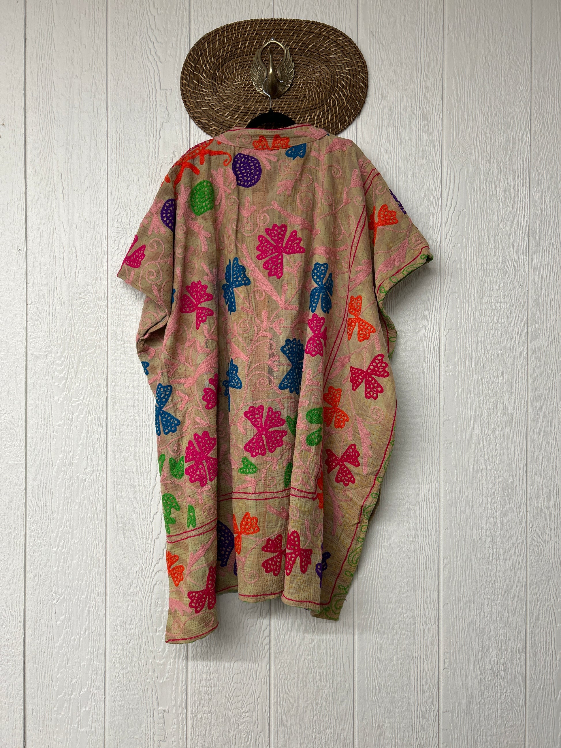 Crafted from hand embroidered fine kantha features a v neckline and interior pockets and side slits for extra dimension.